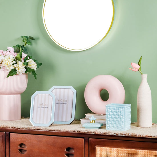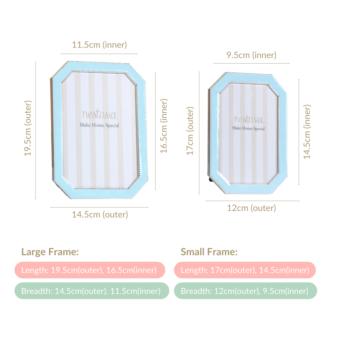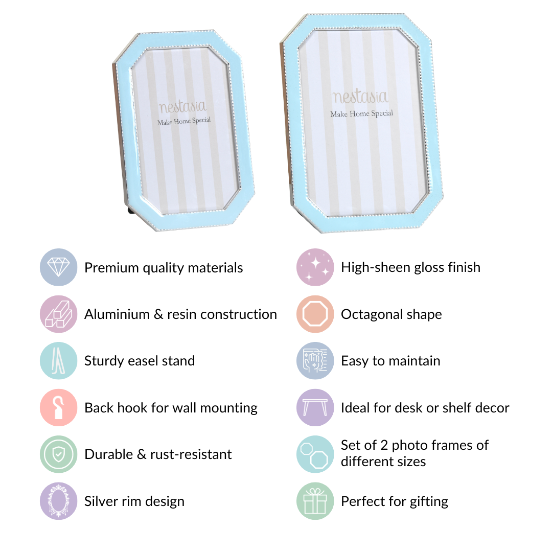 Embrace the allure of our photo frame set in mint green. Crafted from premium quality materials, these picture frames boast a blend of aluminium and resin, ensuring their durability and longevity. Whether you choose to display them on your desk or shelf with the sturdy easel stand or hang them on your wall using the convenient back hook for wall mounting, these frames offer versatility to suit your decor preferences. Their robust construction is rust-resistant, allowing them to maintain their lustrous appearance effortlessly.