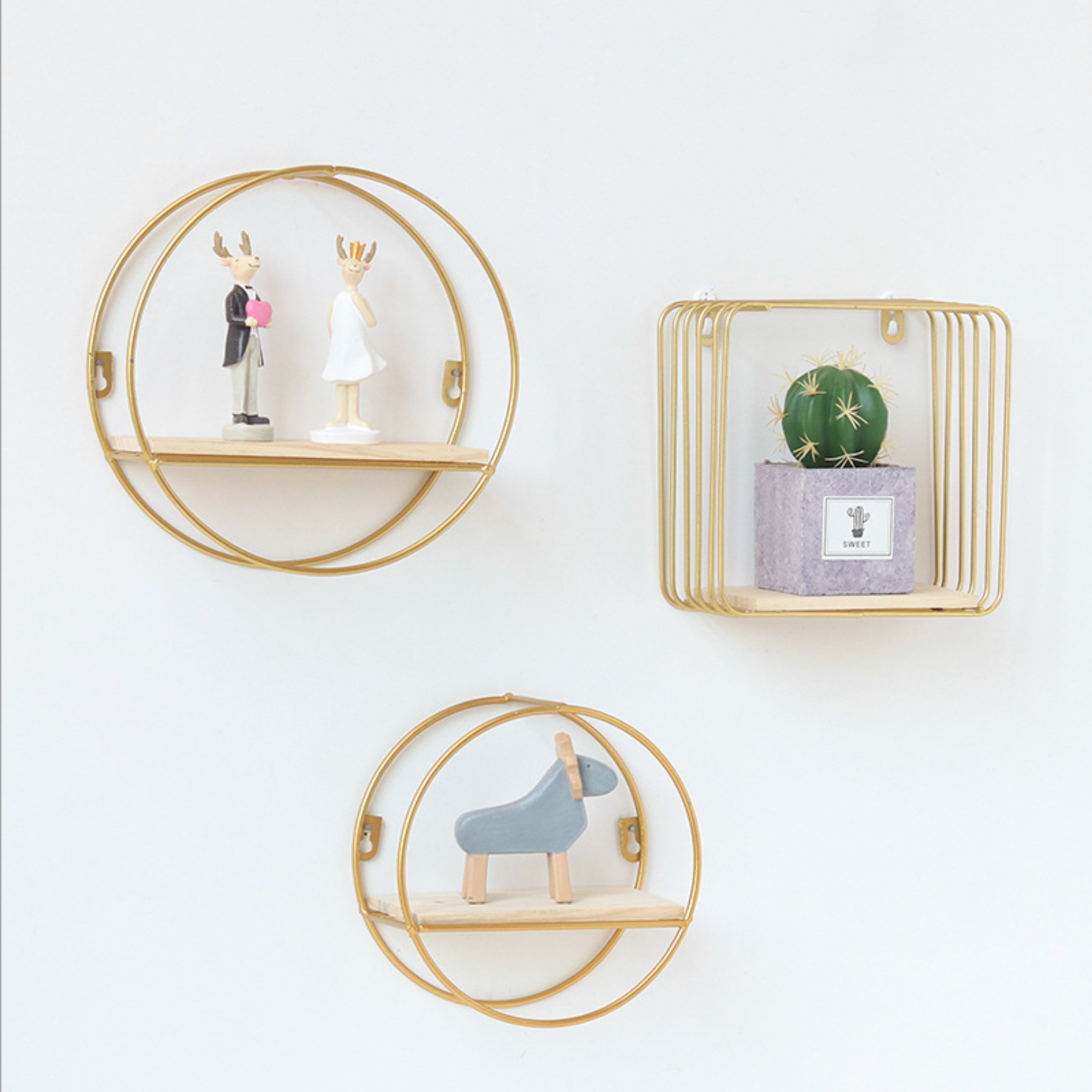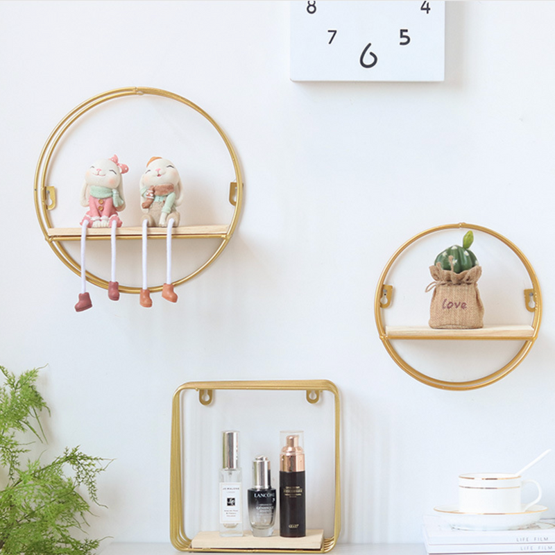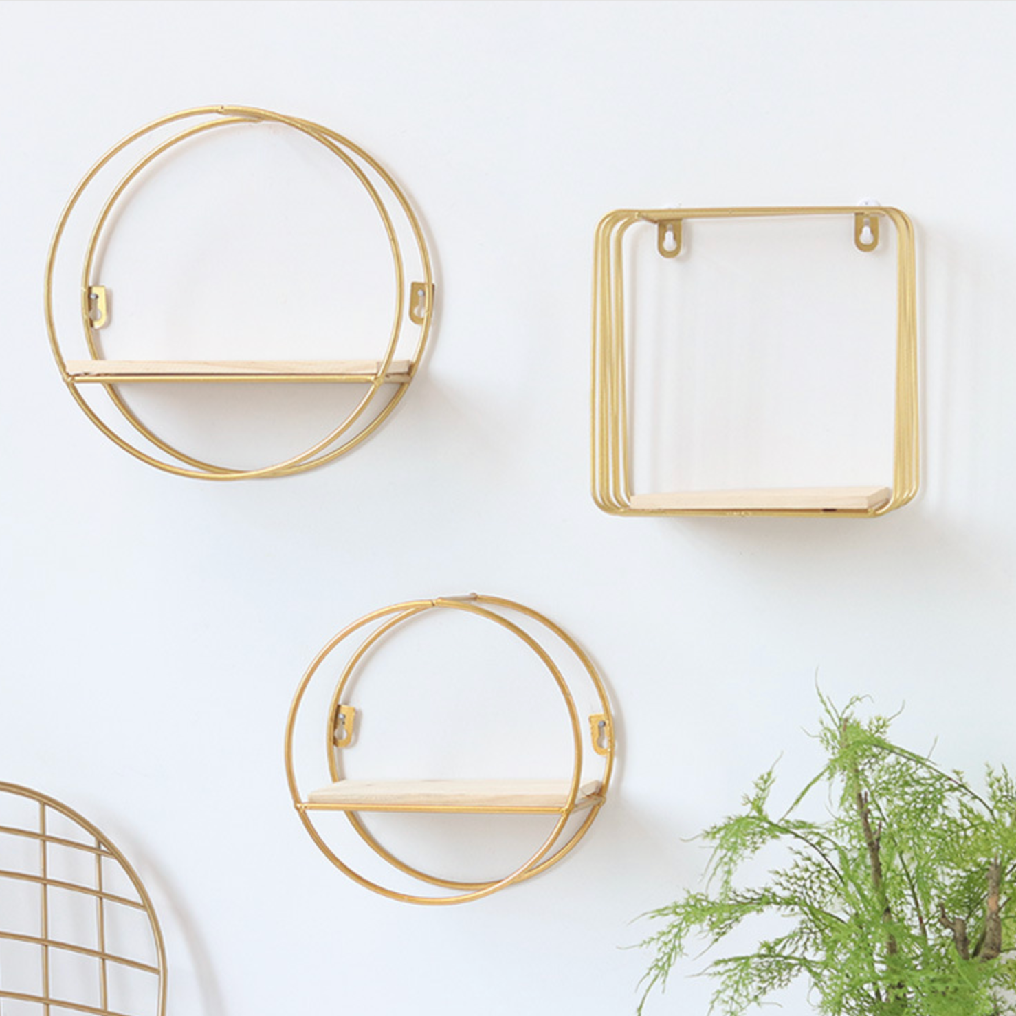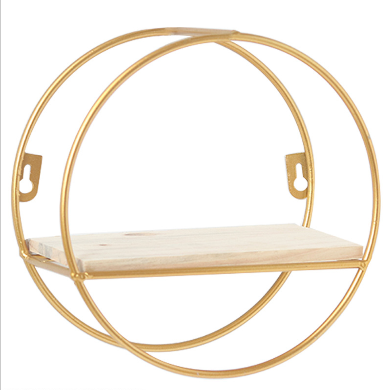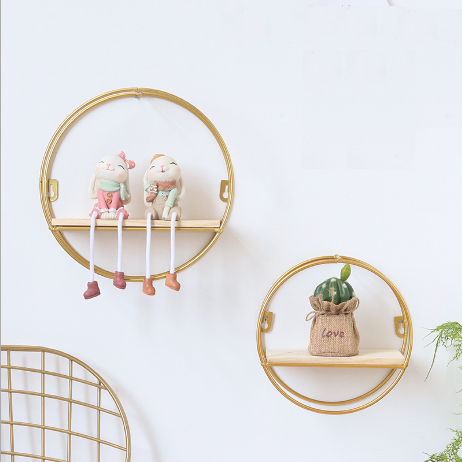 The round gold metal wall shelves have two metal rings with a wooden plank in between to create an aesthetically pleasing wall shelf design. The gold metal texture complements the wooden shelf and is apt to display decor objects, kitchen essentials, flowers, planters and more. Wall shelves can deck up plain walls, bring together the decor theme of the room and make the space feel vibrant and aesthetic.