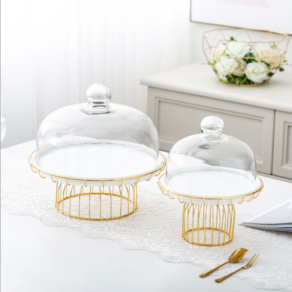 Material: Wrought iron stand, ceramic plate, and glass cloche
