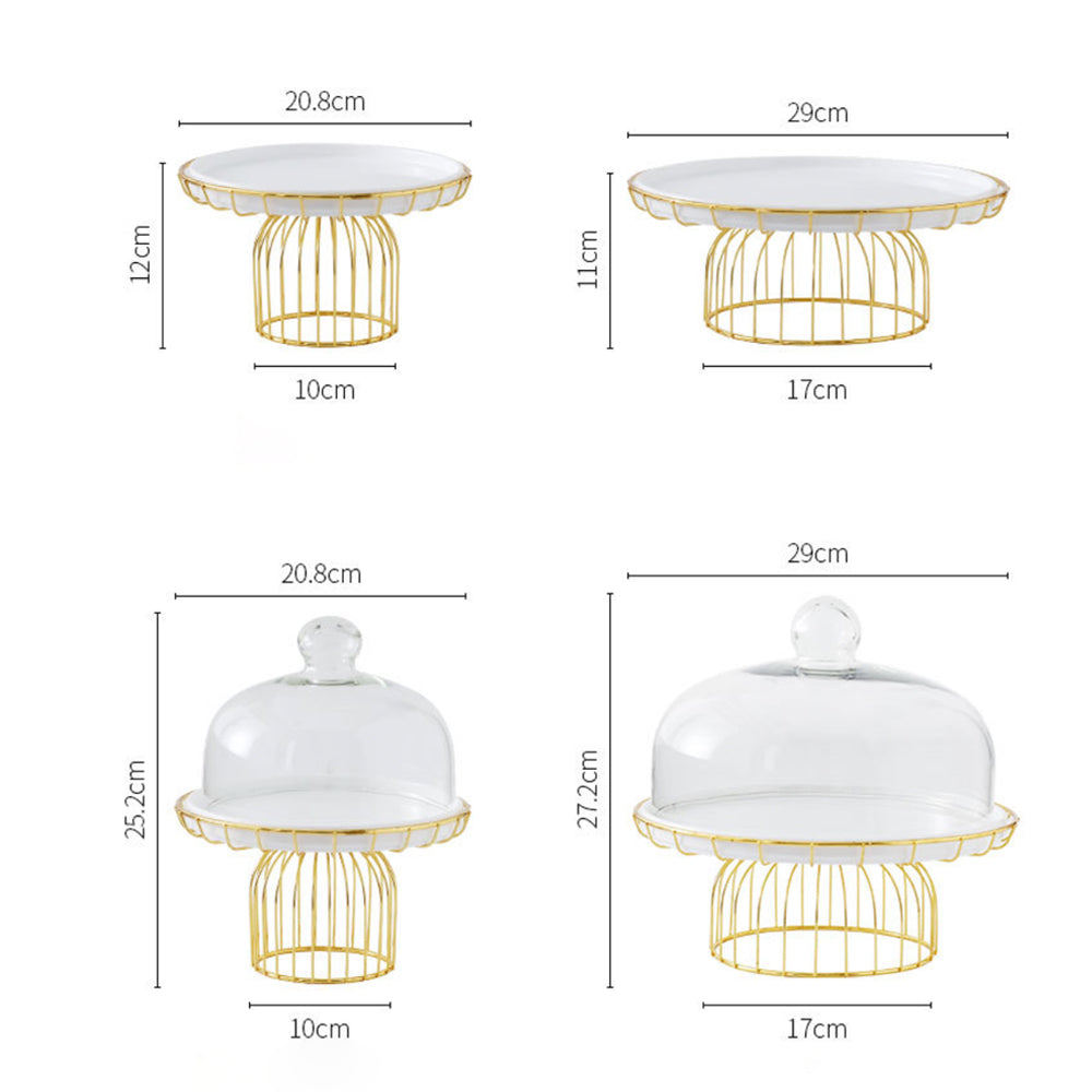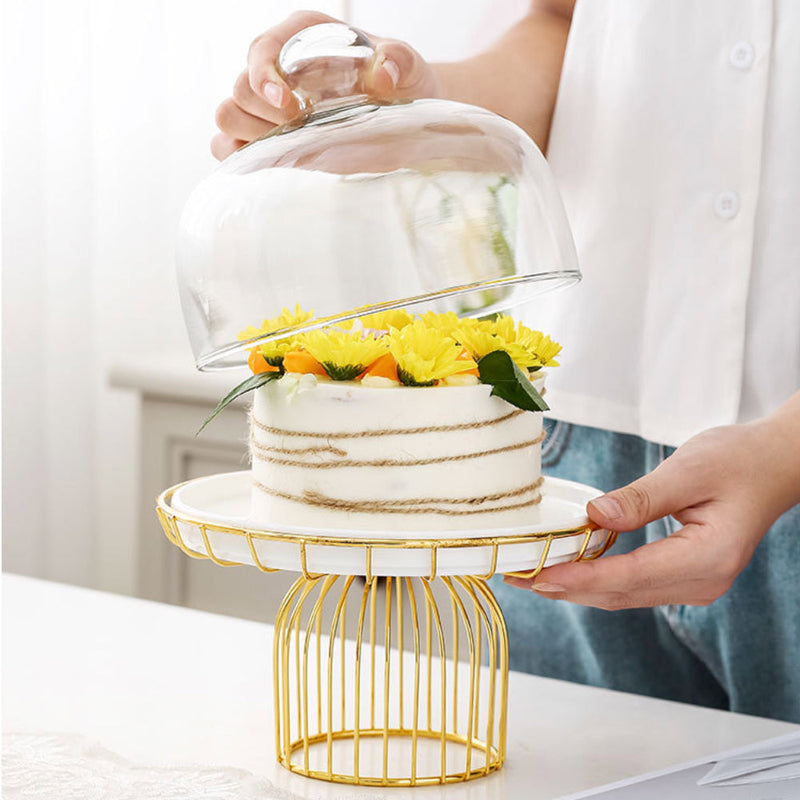 A ceramic plate and a glass cloche are included with the metallic cake stands, which have honeycomb bases. The modern colors of the stands are ideal for both beautifying the dining table and presenting, exhibiting, and preserving the food and its freshness. The plate and stand enhance any classic dining table arrangement due to their remarkably different colors. When used separately, the ceramic plate can also be used as a platter.