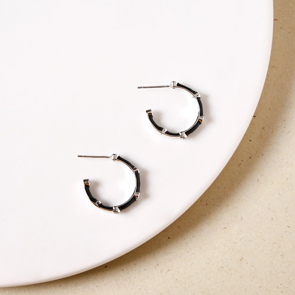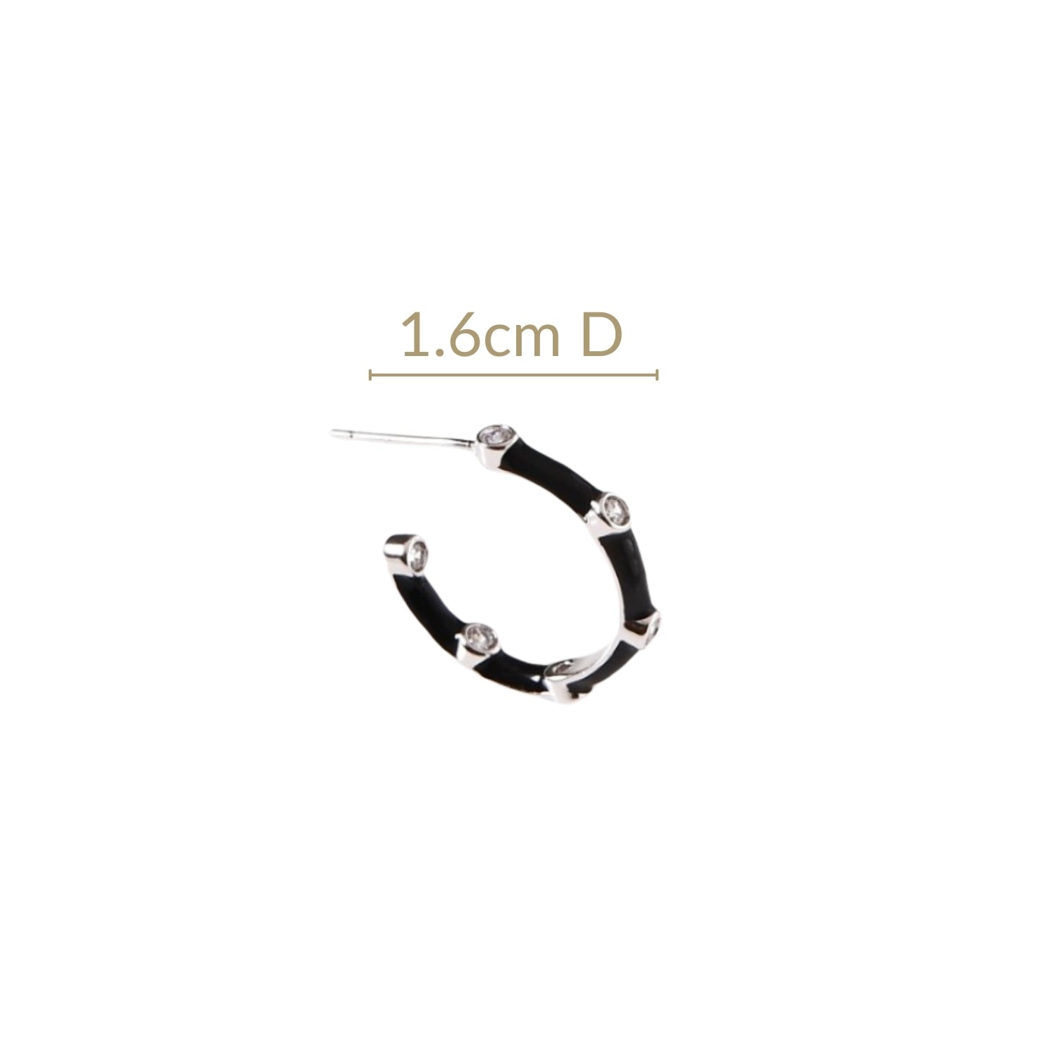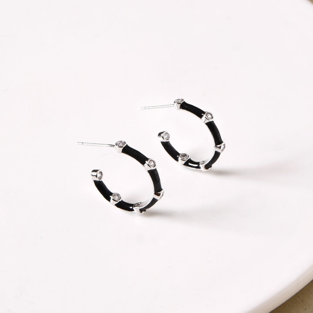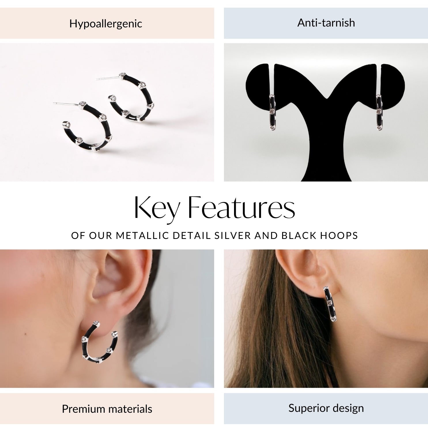 The striking metallic hoops feature a bold design with half of the hoop in a sleek black finish, while the other half gleams in shiny silver. Adorned with sparkling stones along its body, these earrings exude an aura of modern elegance and glamour.