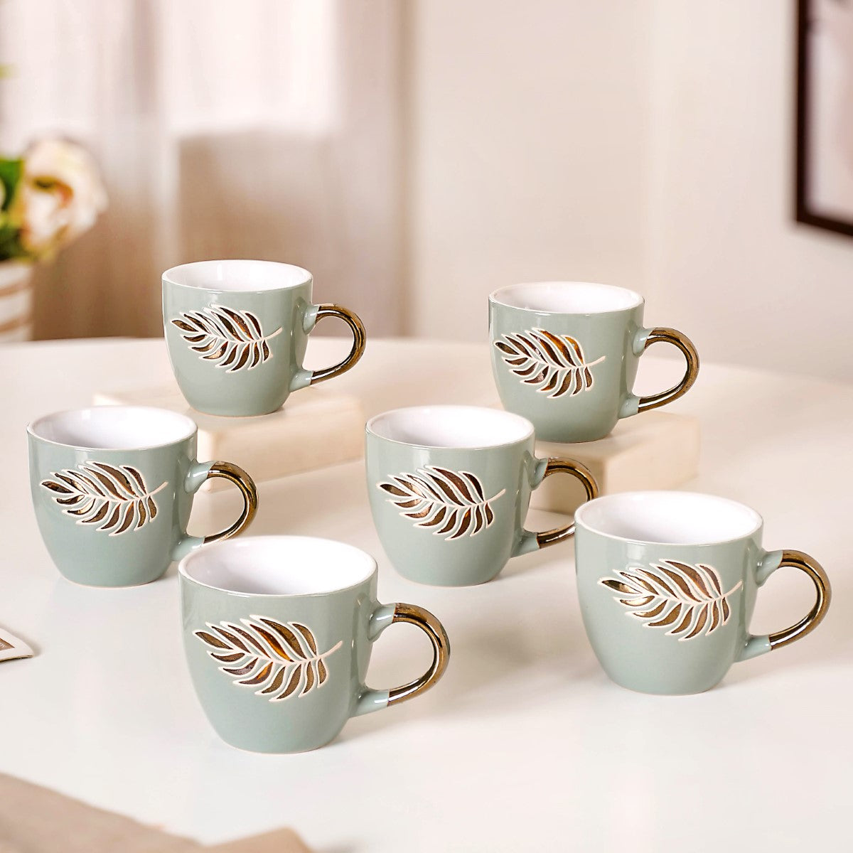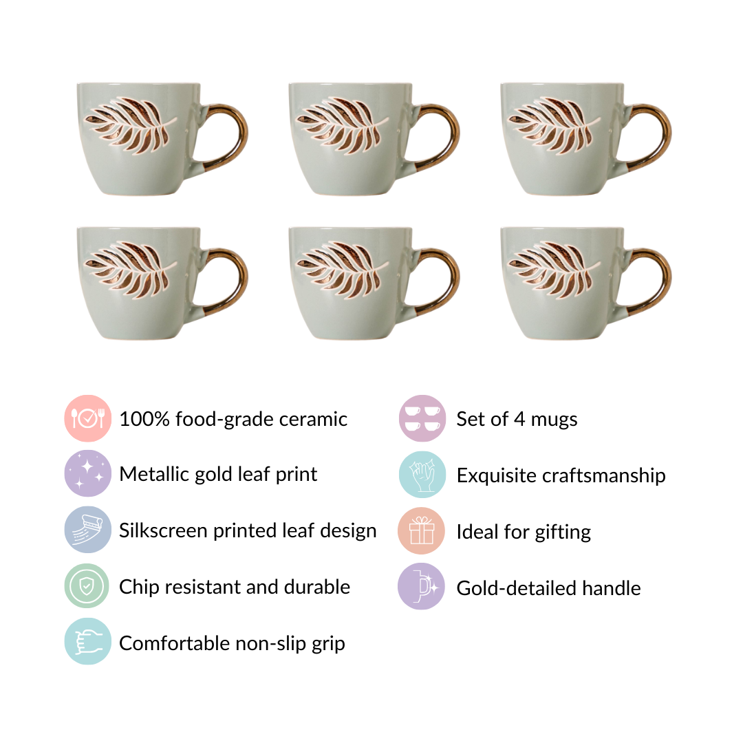 Elevate your daily coffee ritual with our fern leaf pattern light blue coffee cup set of 6. The striking black and white silk-screen printed fern leaf motif infuses a hint of nature's grace into your daily routine. Meticulously crafted from top-tier ceramic, these cups are engineered for durability. The metallic handle design adds a touch of luxury, while their chip-resistant construction ensures they endure the test of time. Sip your coffee with confidence, enjoying a secure non-slip grip.