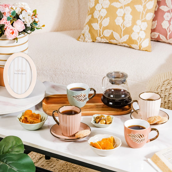 Elevate your daily coffee ritual with our fern leaf pattern light blue coffee cup set of 6. The striking black and white silk-screen printed fern leaf motif infuses a hint of nature's grace into your daily routine. Meticulously crafted from top-tier ceramic, these cups are engineered for durability. The metallic handle design adds a touch of luxury, while their chip-resistant construction ensures they endure the test of time. Sip your coffee with confidence, enjoying a secure non-slip grip.