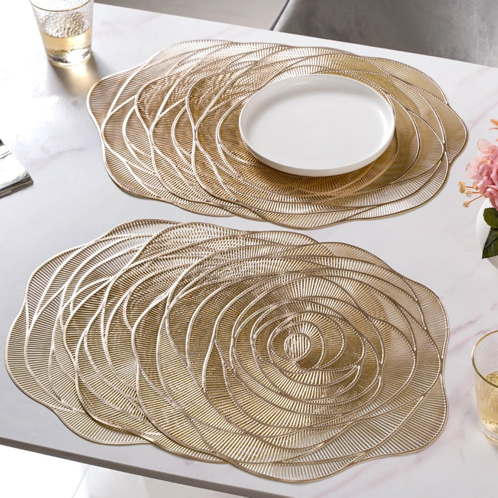 The lustrous golden metallic placemats that come in a set of 6 feature have the shape of blooming roses to grace the table with an unparalleled charm to woo guests. The netted table mats feature a semi-matte finish and can be placed directly on the tabletop or a tablecloth. The anti-skid table mat adds texture to the tabletop and elevates the dishes served. The round table mat is ideal for daily use as it's easy to clean and can also be used for decorating a festive dinner table setup.