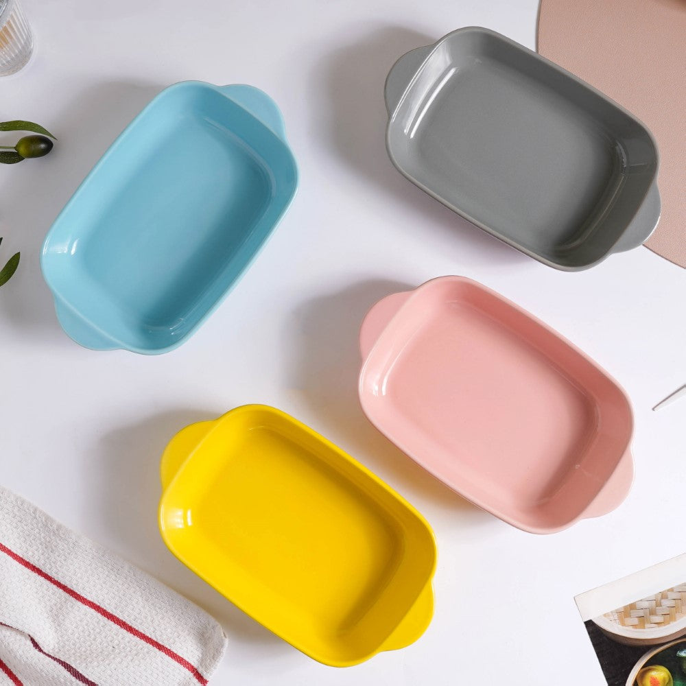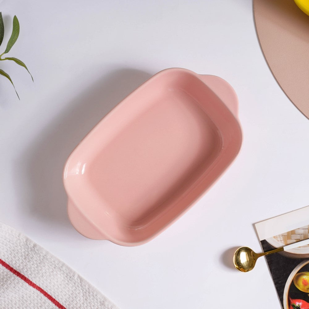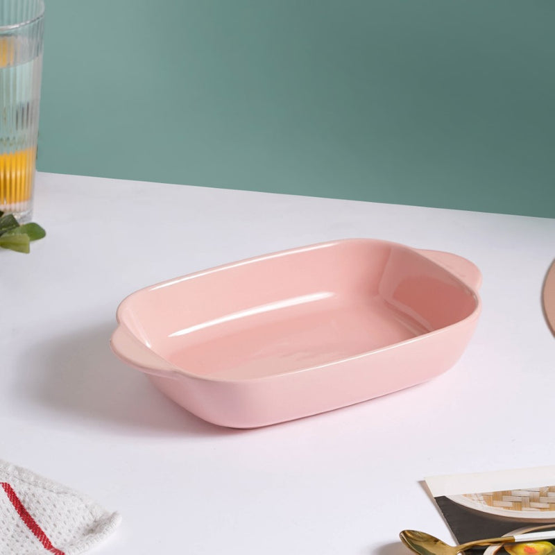 The high-quality ceramic used to craft the rectangular baking dish is resistant to the intense heat of the oven. The dish's large surface area makes it possible to bake a larger volume of food. In the pink porcelain dish, bake steaks, lasagna, or cheese pasta. Cookies, cupcakes, and pies can all be baked and served on the ceramic baking dish.