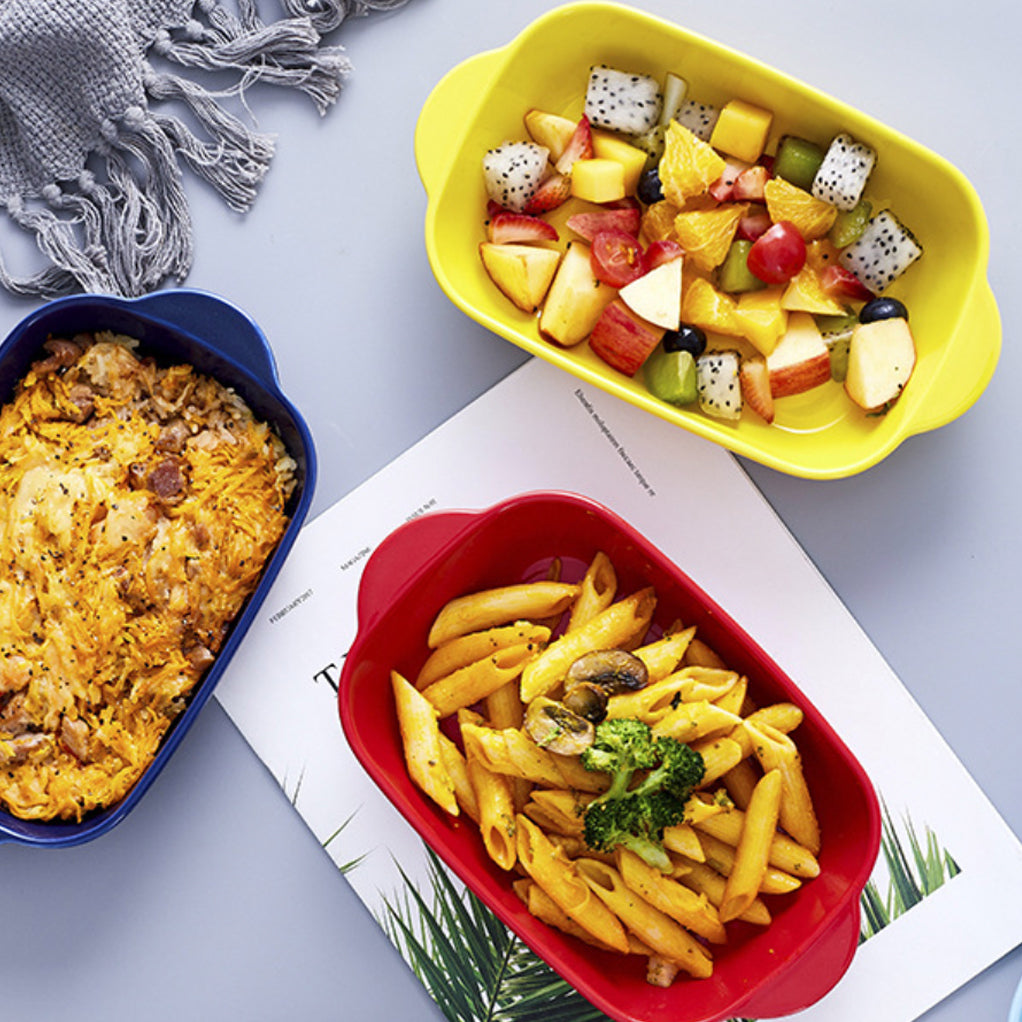 The microwave oven dish for baking and serving comes in red colour. Bake pasta, veggies, chicken, au gratin and desserts in the baking dish or use it as a salad bowl toss up fresh cold salad or serve snacks or noodles or fruits in the bowl. The bakeware can also be used to heat or reheat food in the microwave.