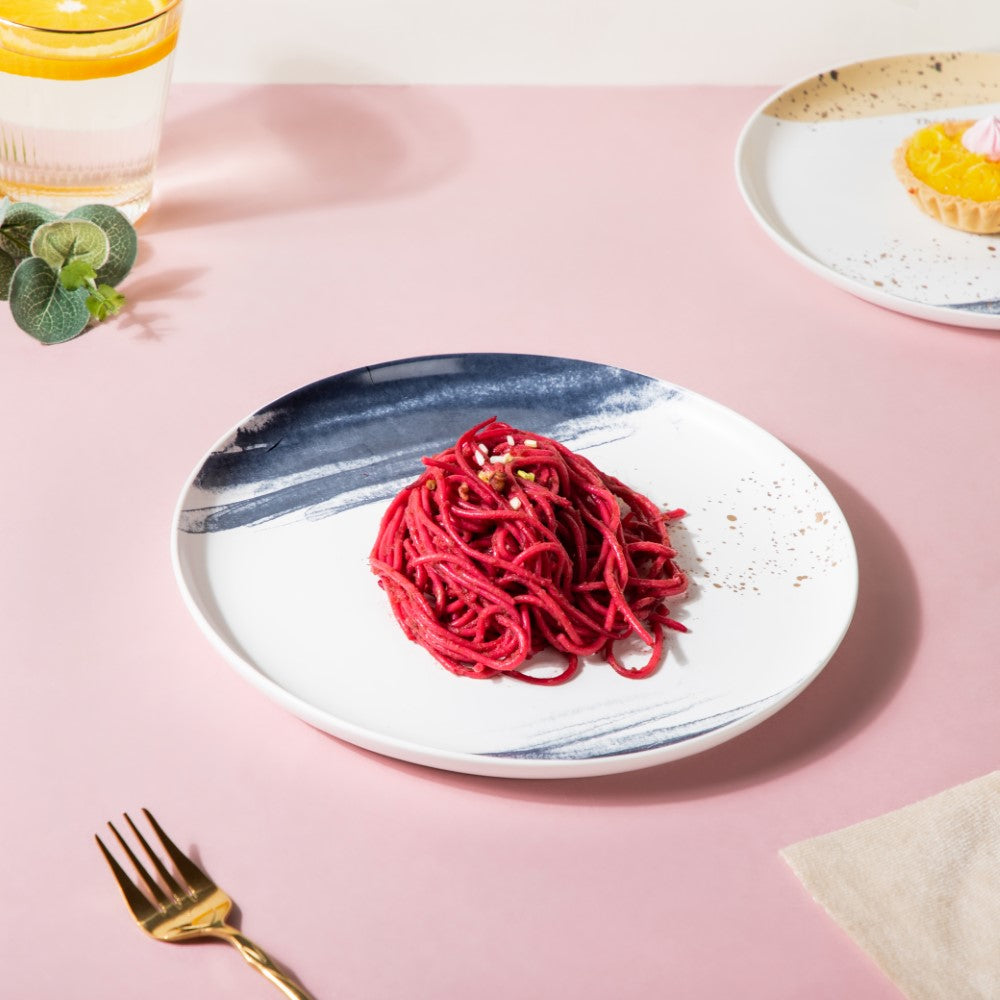 The ceramic dinner plate with gold detail and abstract patterns is a luxurious addition to any dinnerware collection. This plate is crafted from high-quality ceramic material and is adorned with gold details, adding a touch of elegance to any dining experience. The plate itself is usually large enough to accommodate a full meal and a raised rim to prevent food from spilling over.
