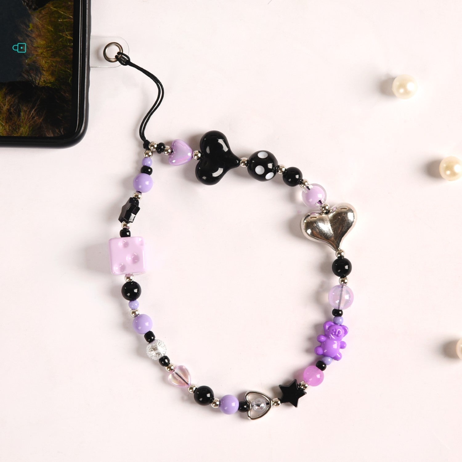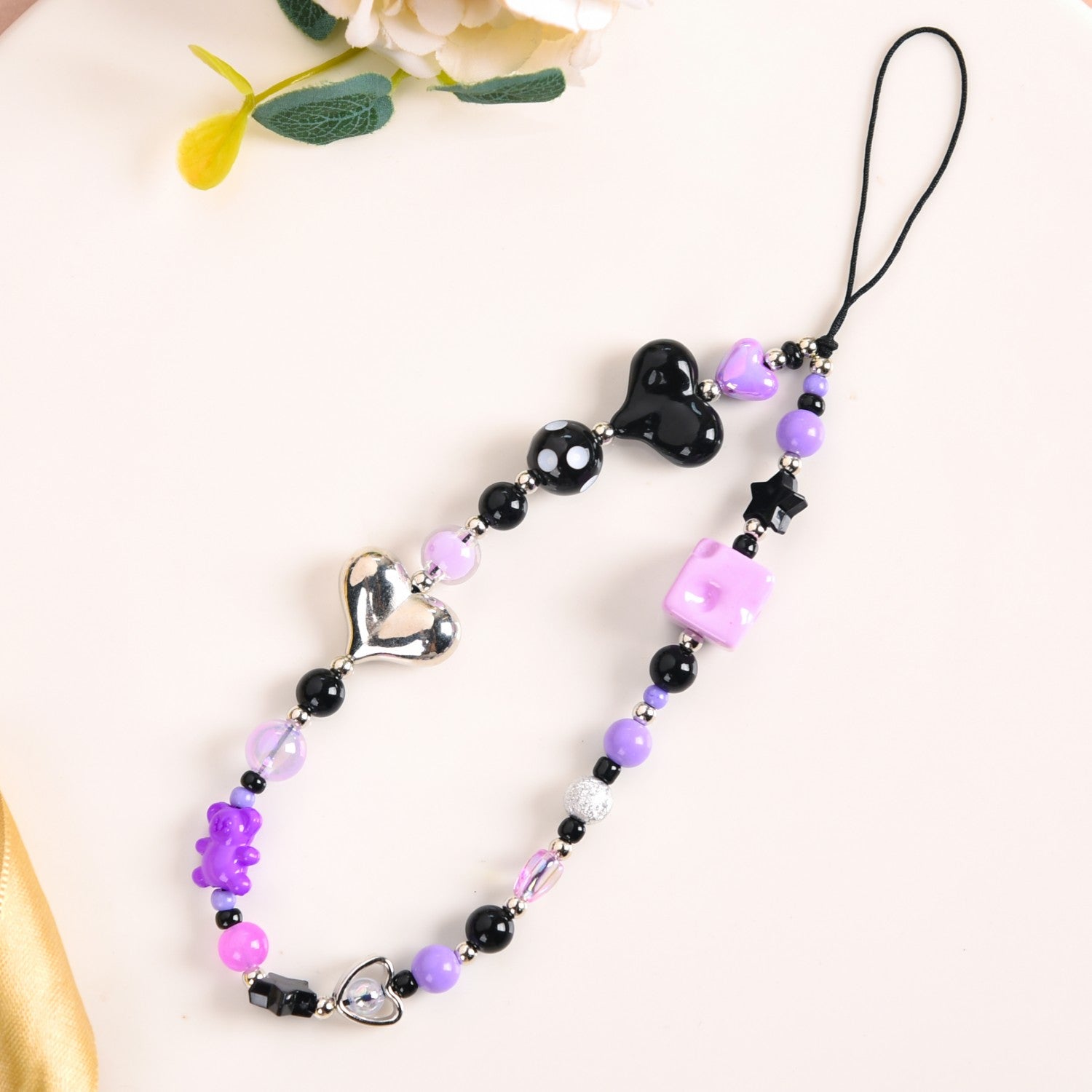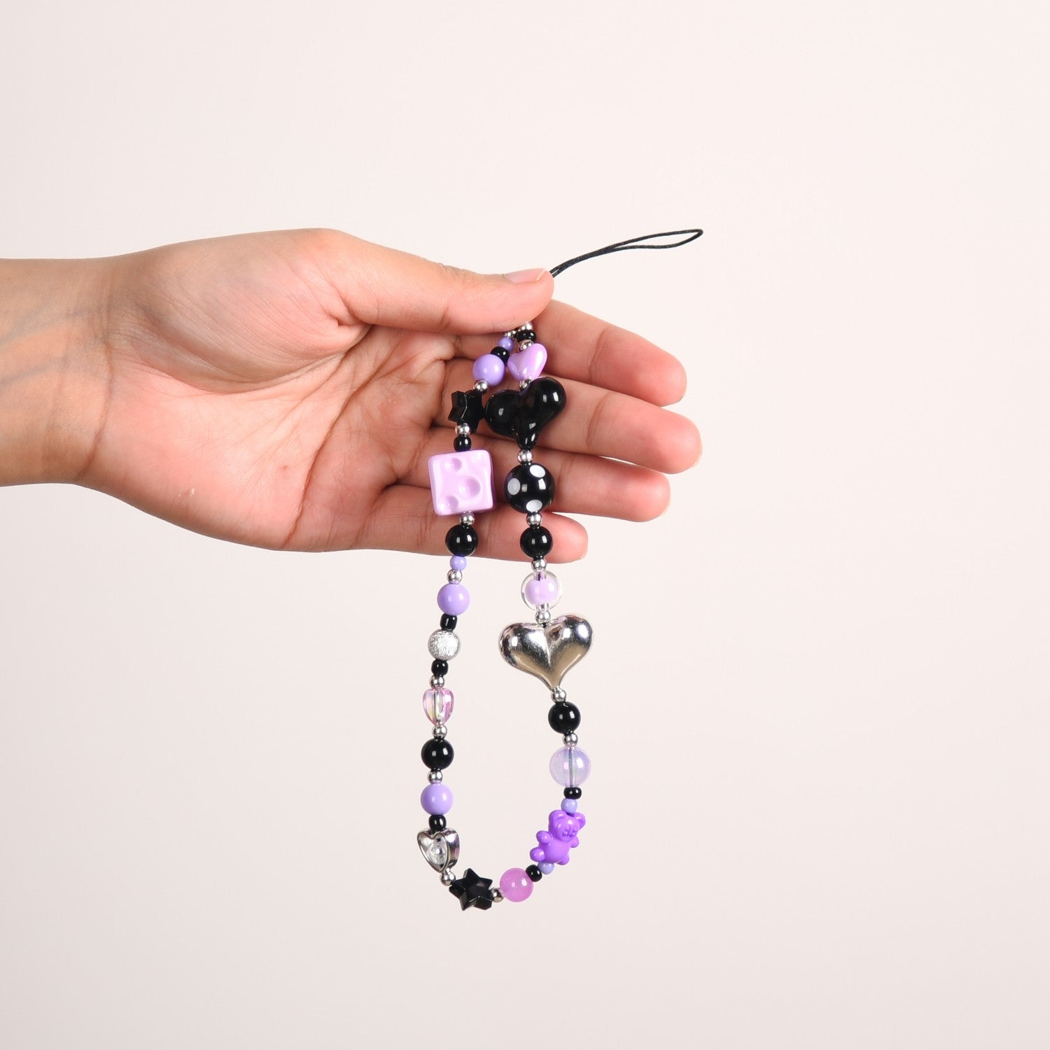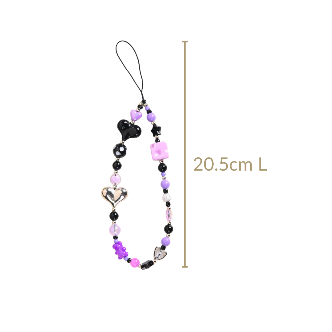 This phone charm brings together a perfect blend of playful charm and style. Handcrafted using high-quality materials, this phone strap is all things durable, functional, and style. Adorned with a whimsically punk-rock mix of beads, in shades of purple, black, and silver, this phone charm lanyard instantly adds character to your device. With two heart-shaped beads for a sweet touch paired with a purple cheese cube, a tiny teddy bear, and a round polka-dot bead for some whimsy, this phone charm is a must-have phone accessory. Whether you’re looking for a phone strap or a fun phone lanyard to personalize your device, this phone charm is the perfect accessory to make your phone stand out with a little extra flair.