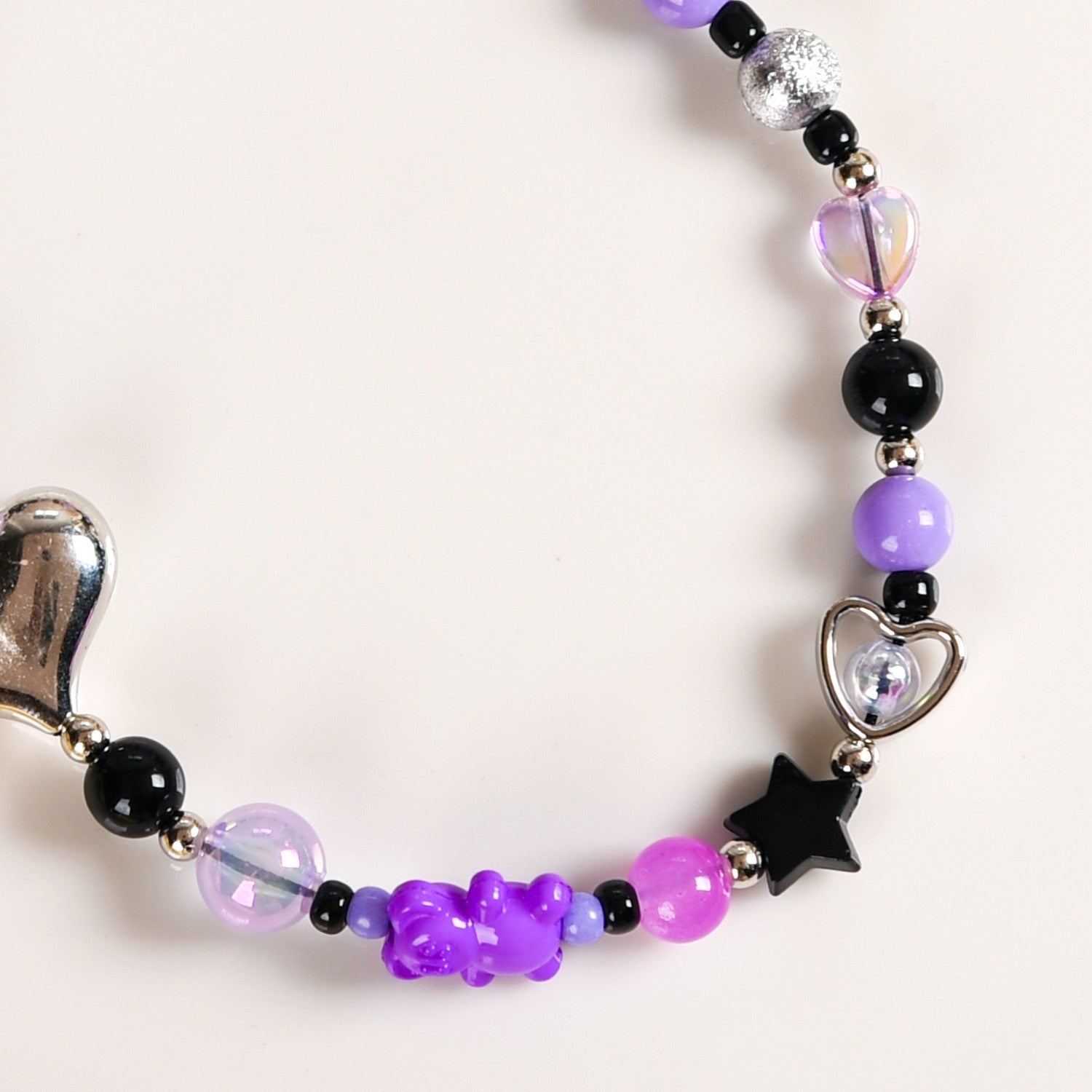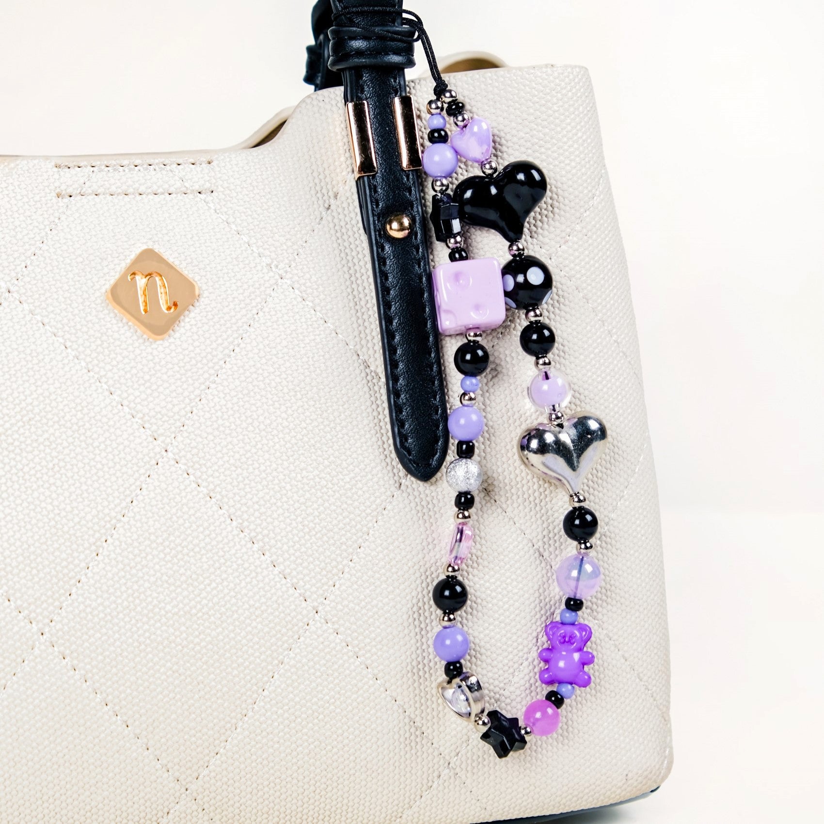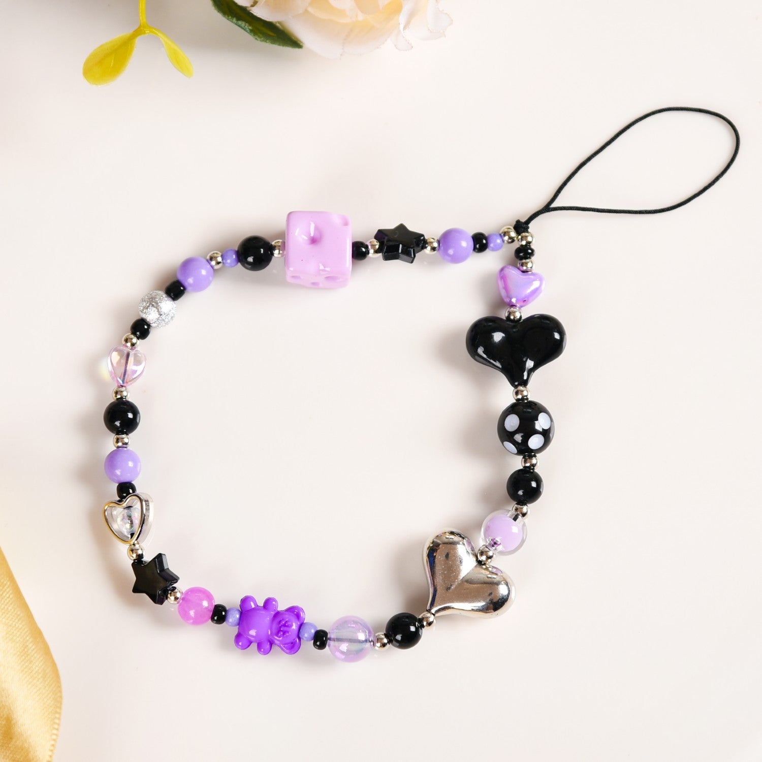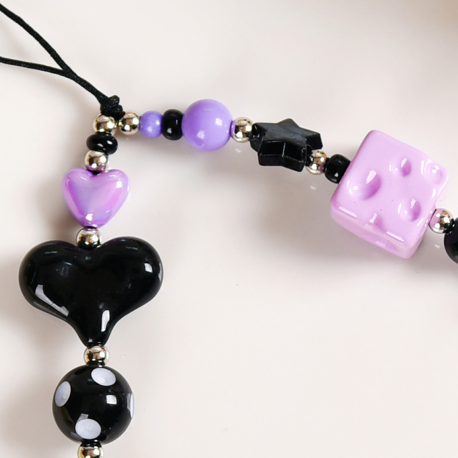 This phone charm brings together a perfect blend of playful charm and style. Handcrafted using high-quality materials, this phone strap is all things durable, functional, and style. Adorned with a whimsically punk-rock mix of beads, in shades of purple, black, and silver, this phone charm lanyard instantly adds character to your device. With two heart-shaped beads for a sweet touch paired with a purple cheese cube, a tiny teddy bear, and a round polka-dot bead for some whimsy, this phone charm is a must-have phone accessory. Whether you’re looking for a phone strap or a fun phone lanyard to personalize your device, this phone charm is the perfect accessory to make your phone stand out with a little extra flair.