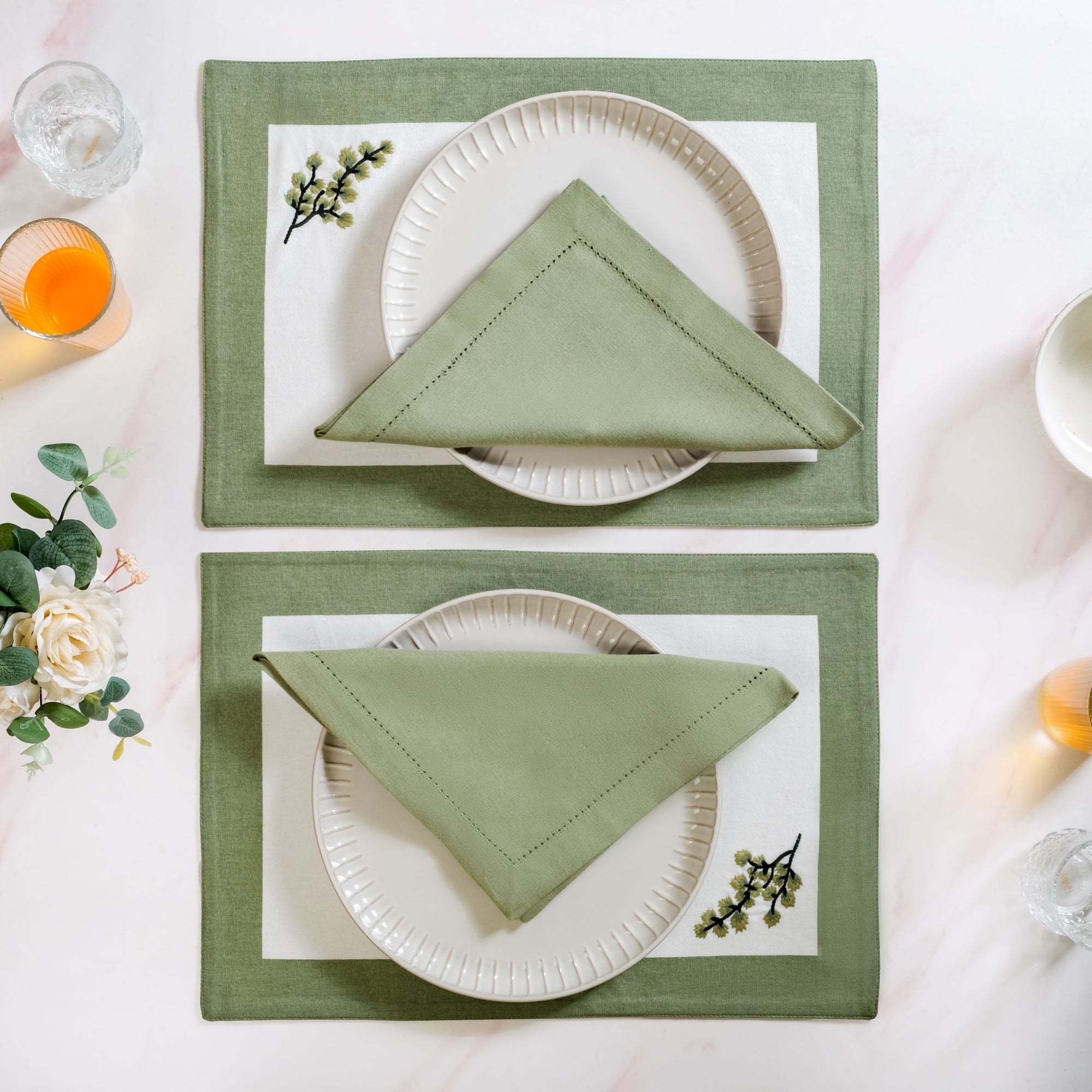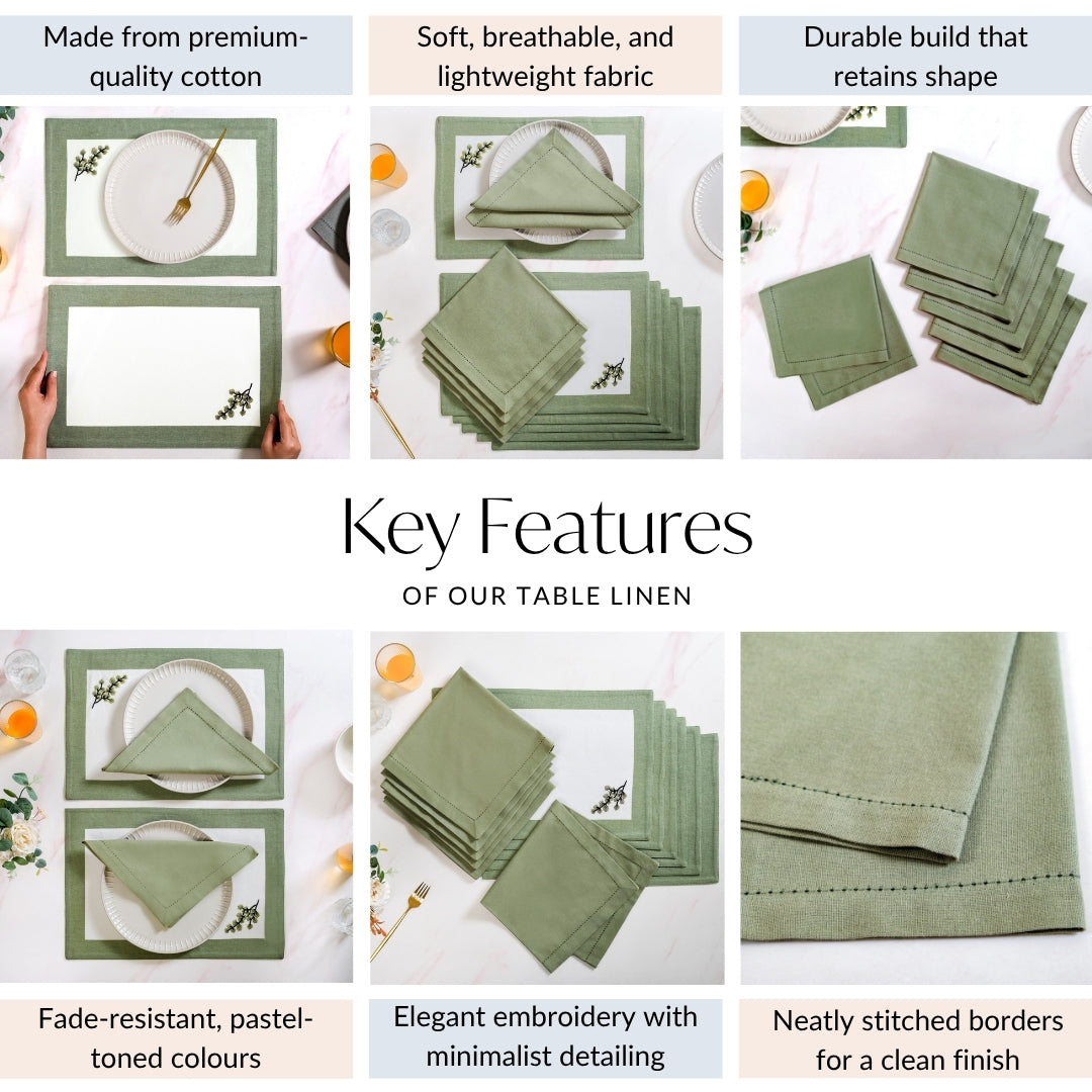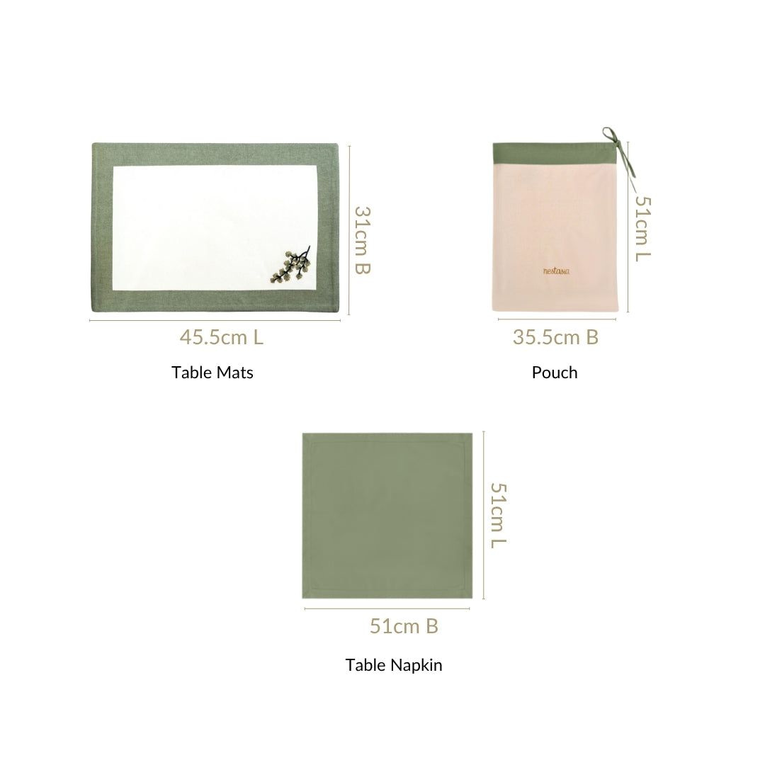 Design: Each cotton placemat features a crisp white centre framed with sage green borders and an embroidered tree branch motif in black and green at one corner, adding a grounded, nature-inspired detail. The cotton napkins come in a soft sage green shade with slim stitched edges that balance elegance with everyday durability. All pieces are crafted from 100% cotton with a smooth, structured surface that drapes well but holds its shape. The placemats are generously sized to accommodate a plate, cutlery, and glassware. The napkins fold easily for both casual and decorative setups. The cotton storage pouch echoes the set’s colour palette and includes a tie closure, making it easy to store the full set neatly or take it on the go.