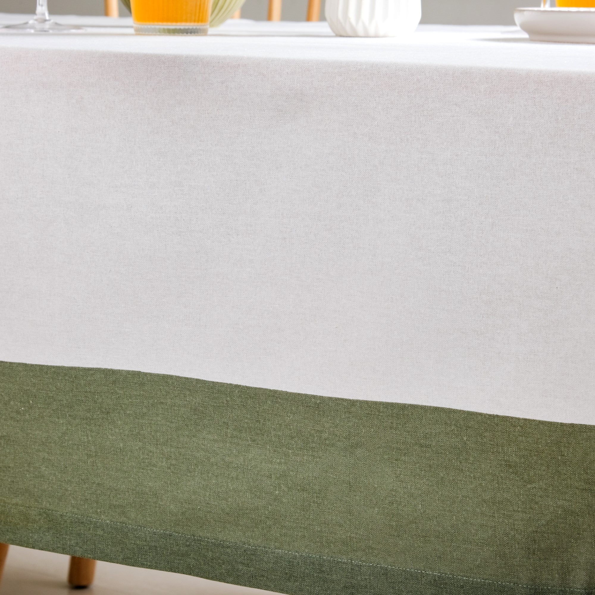 Design: This tablecloth features a plain white base contrasted with soft sage green borders that create a structured look. The fine stitching near the edges of the cloth adds a refined touch, while the smooth finish exudes regal charm. Its soft fabric drapes elegantly over any tabletop, offering a combination of style and functionality. Whether paired with colourful table napkins or soft runners, this piece creates an inviting atmosphere. The simple yet elegant design of the tablecloth makes it suitable for all kinds of dining experiences.