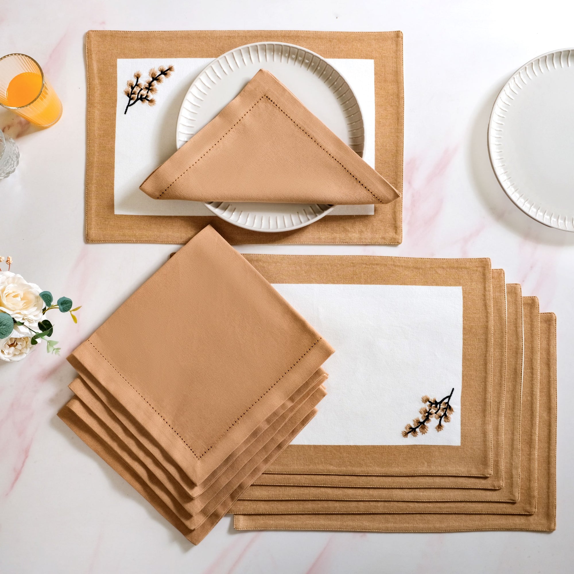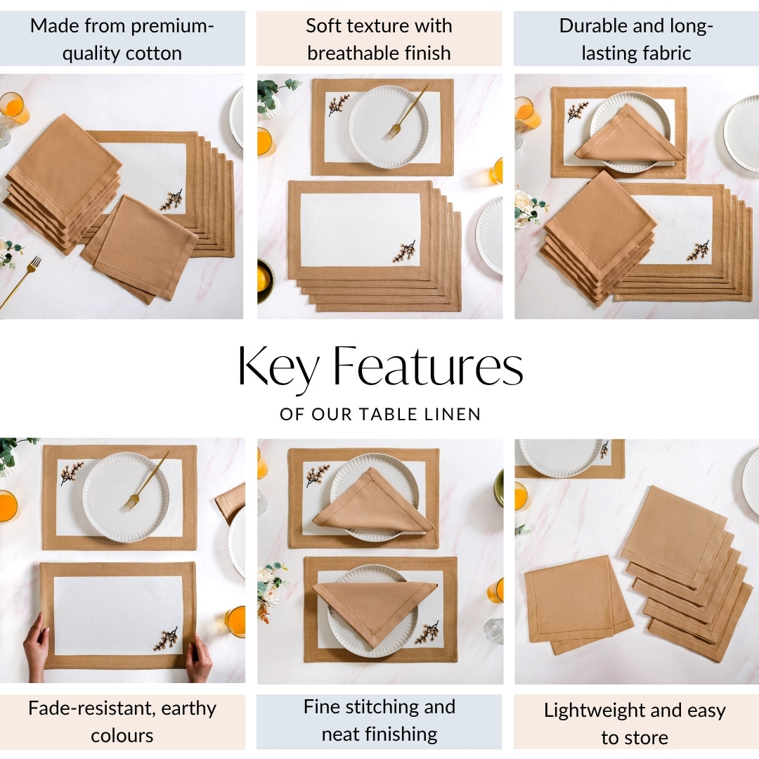 Design: Each cotton placemat features a clean white centre bordered in warm brown and is accented with a delicate tree branch embroidery in muted pastels at one corner. The cotton napkins come in a lightweight, soft weave with overlocked edges, offering a crisp, neat finish. Their rectangular shape allows for versatile folding, whether for a casual breakfast or a formal dinner setting. The smooth matte texture of both the mats and napkins pairs effortlessly with ceramic, wooden, or glass tableware. The matching cotton pouch comes with a drawstring closure and makes it easy to store the set compactly, whether at home or on the go.