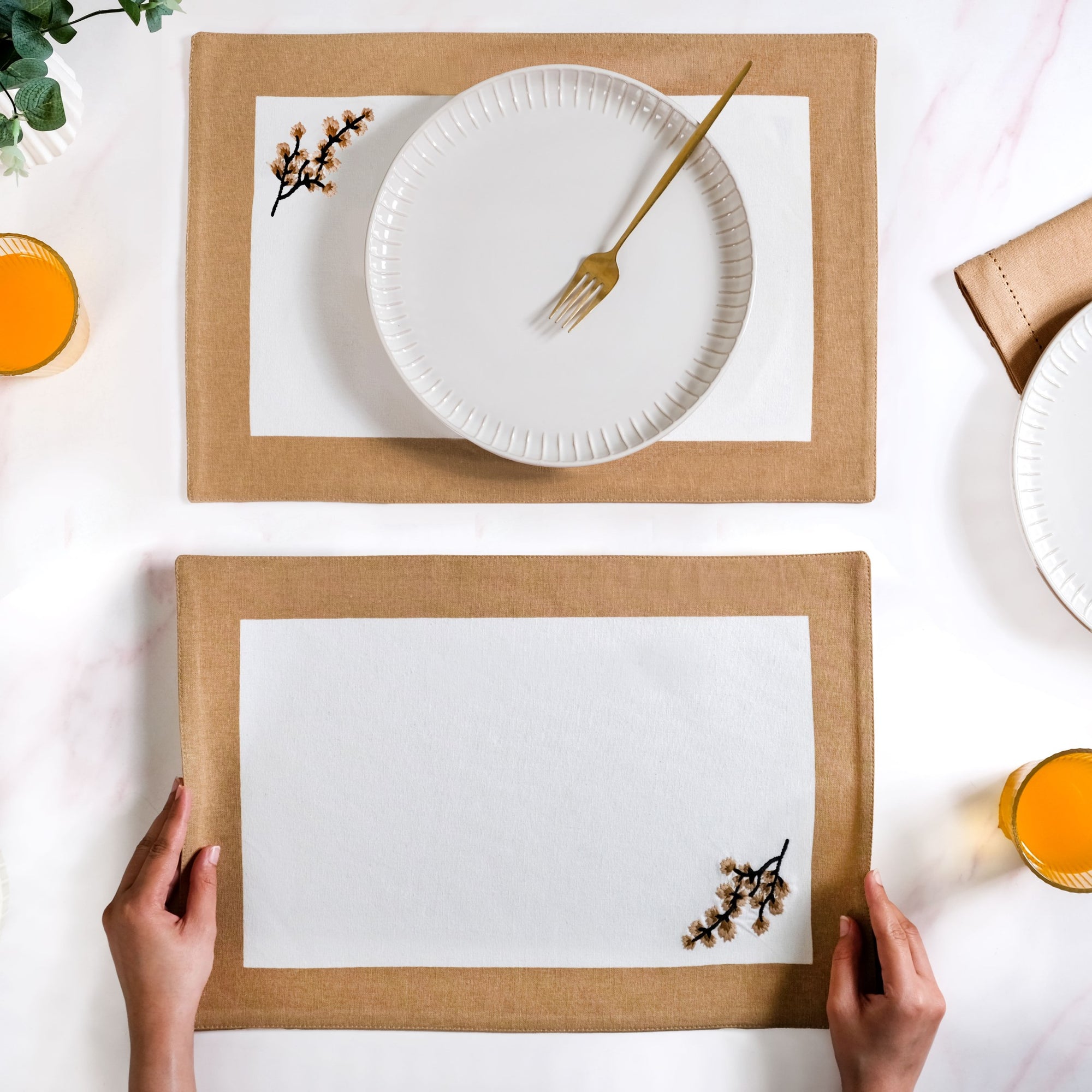 Design: Each dining table mat presents a warm brown border wrapped around a clean white centre, creating a soothing visual contrast. Along the edge, a delicate tree branch is embroidered in soft pastel tones, bringing a hand-finished charm to the overall design. The cotton surface is smooth yet structured, offering both comfort and durability. Neatly overlocked edges frame the mat and prevent fraying with regular use. A white cotton backing adds subtle grip, helping the mat stay in place on smooth surfaces. The rectangular shape is spacious enough to accommodate a full place setting, making these table mats both beautiful and highly functional.