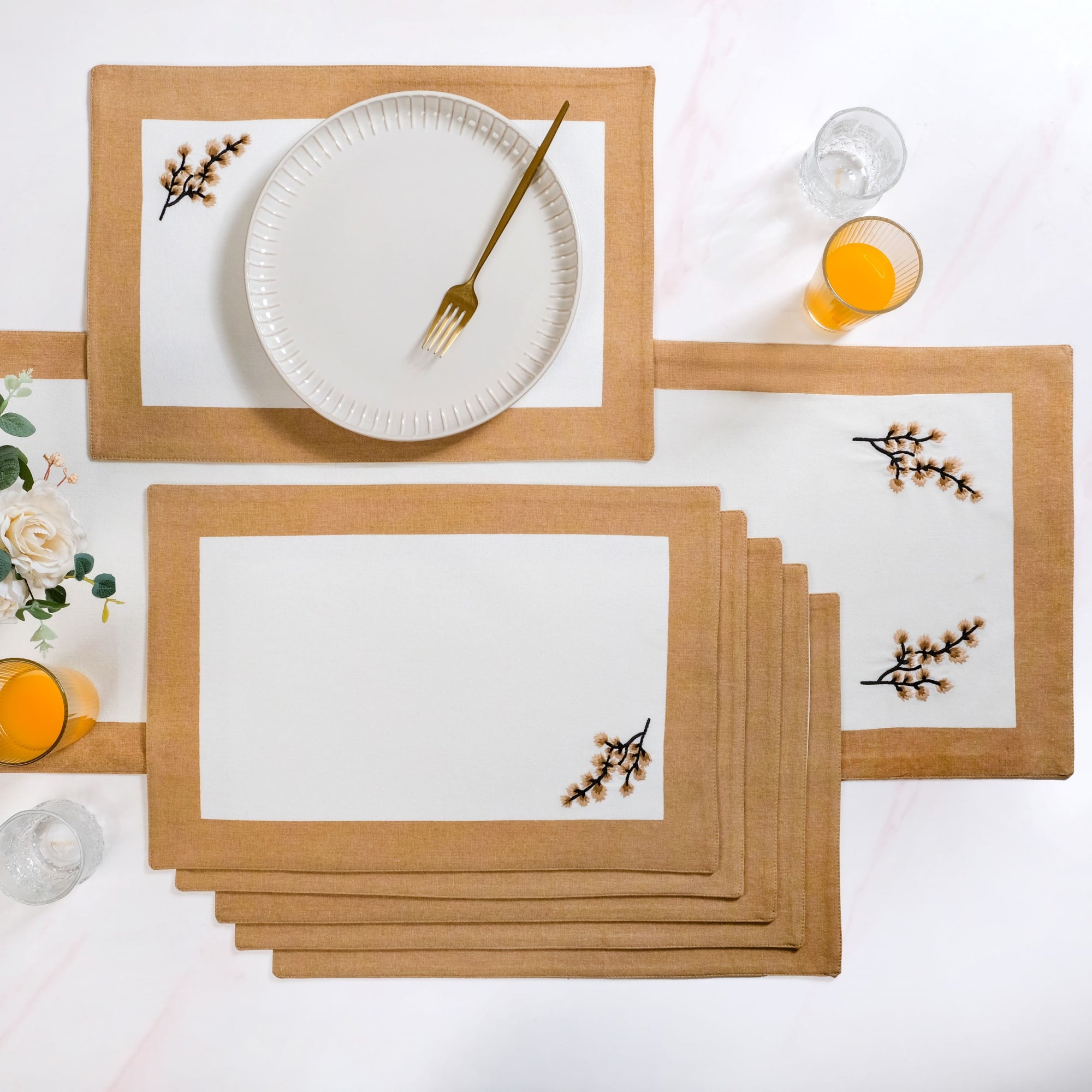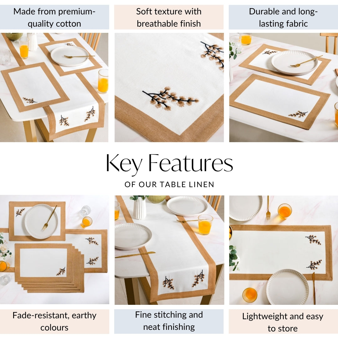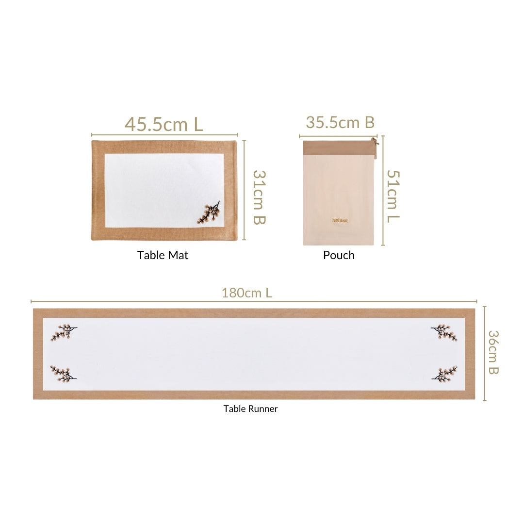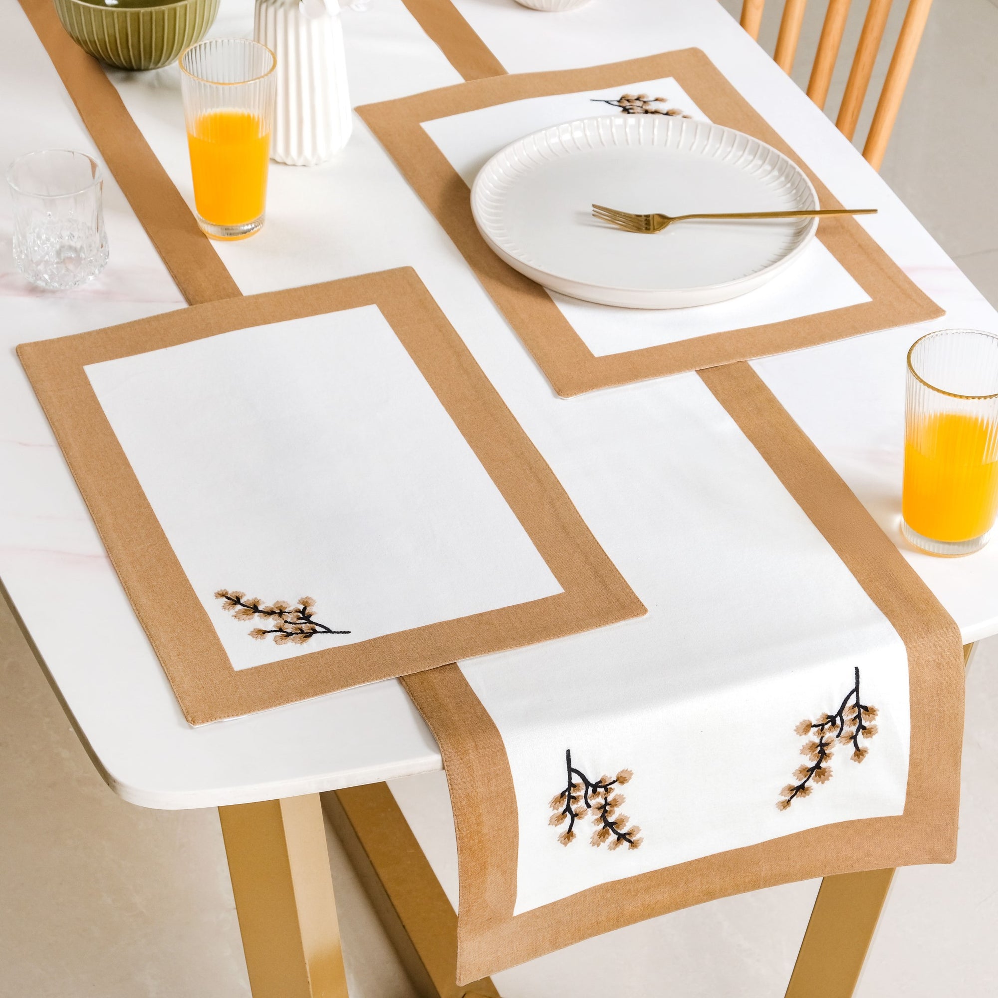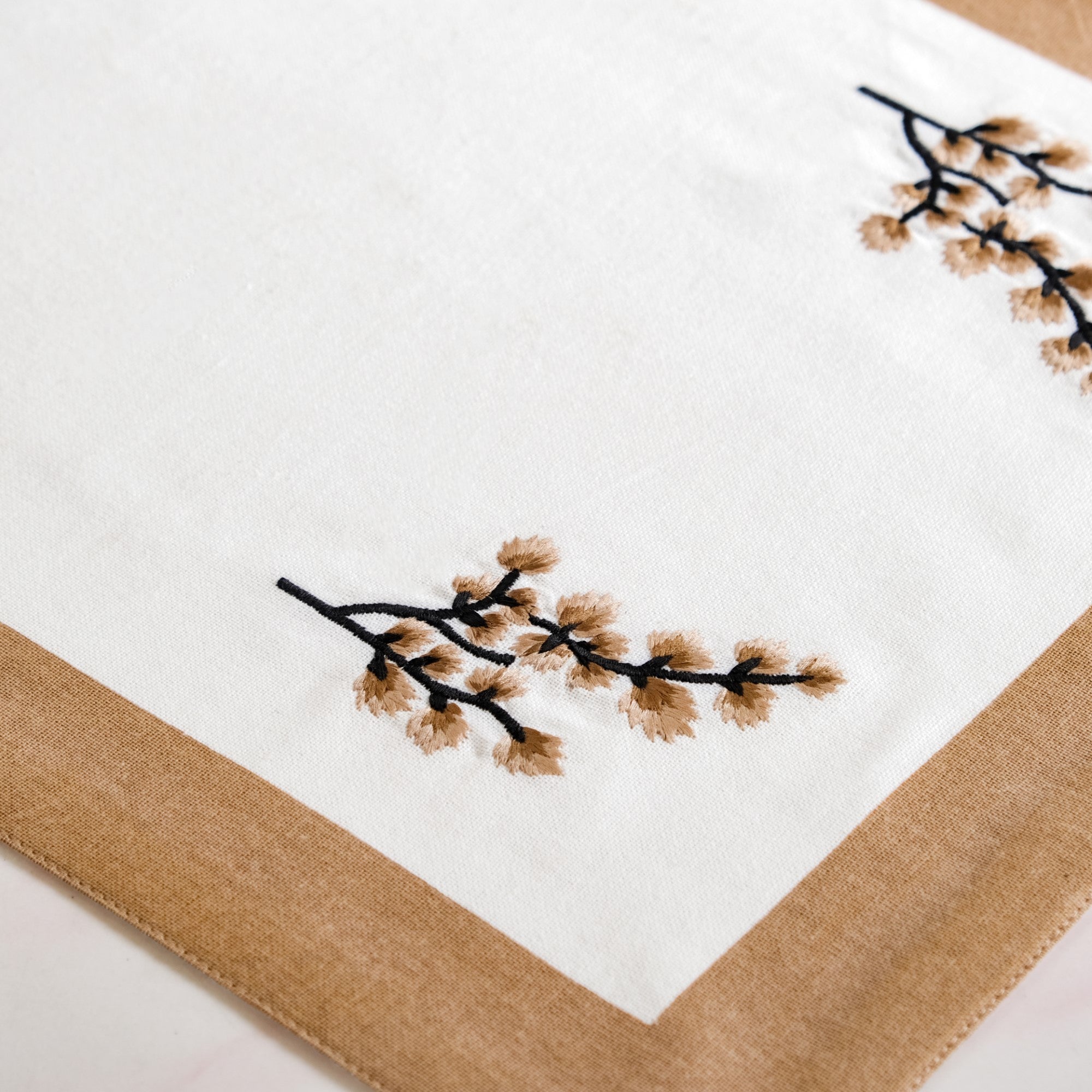 Design: This set includes six rectangular placemats, one long table runner, and a matching cotton pouch. Each placemat features a white base with warm brown borders and a delicate embroidered tree branch in pastel tones at one corner. The runner echoes the same palette and pattern, with motifs embroidered on both ends to create visual balance. The fabric is tightly woven with a soft matte finish, offering structure without stiffness. Both the mats and runner are detailed with fine stitching to prevent fraying and add a clean, finished look. The drawstring pouch is made from coordinating cotton, keeping the set compact and easy to store or carry.