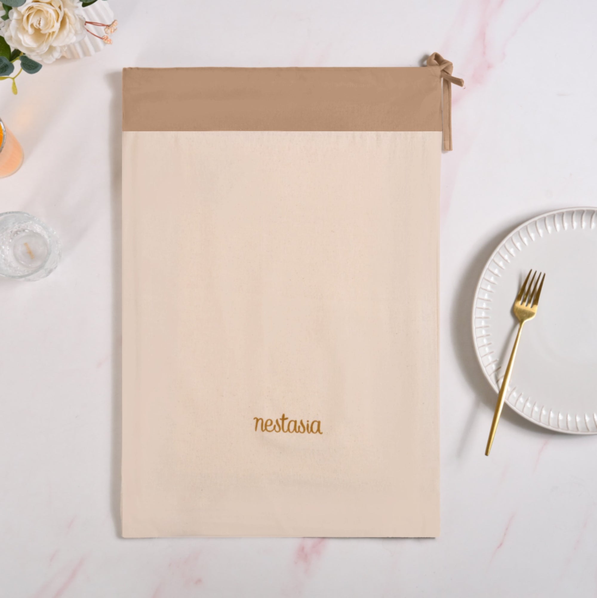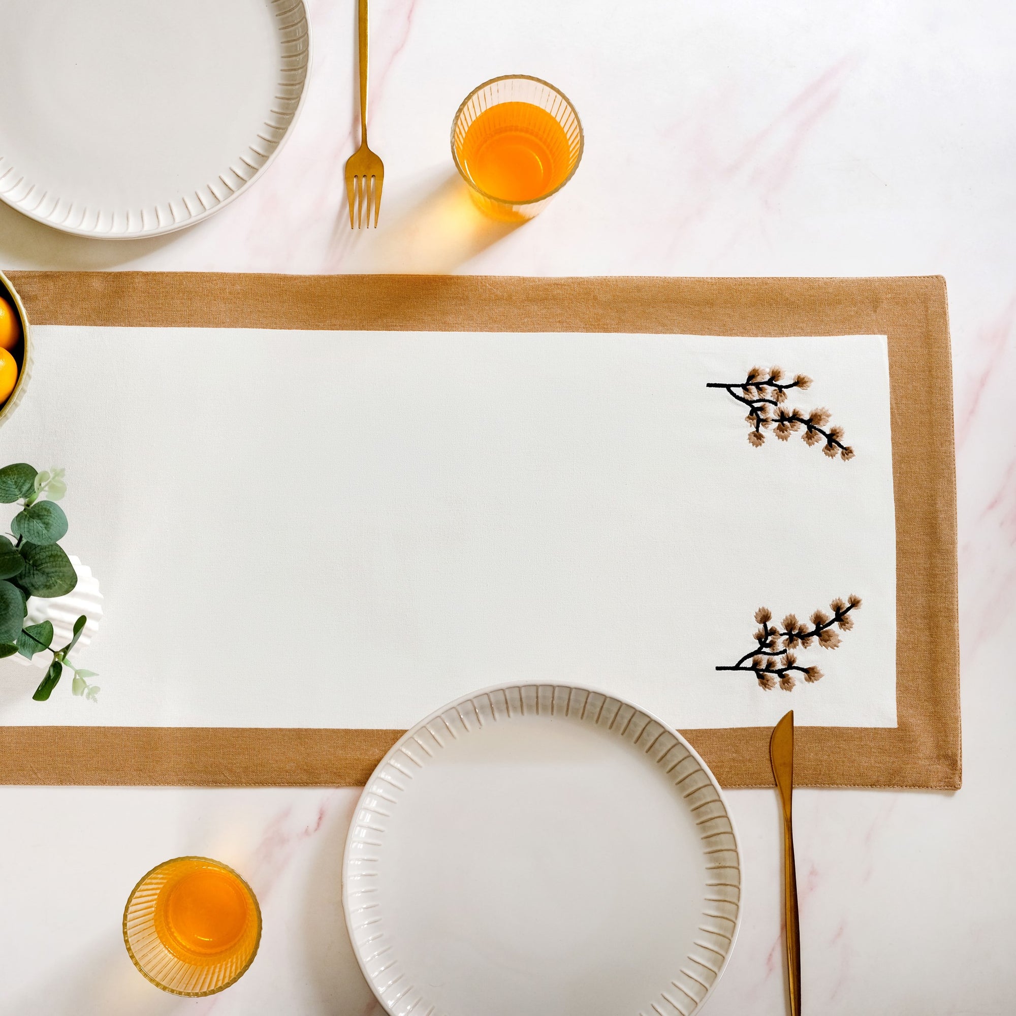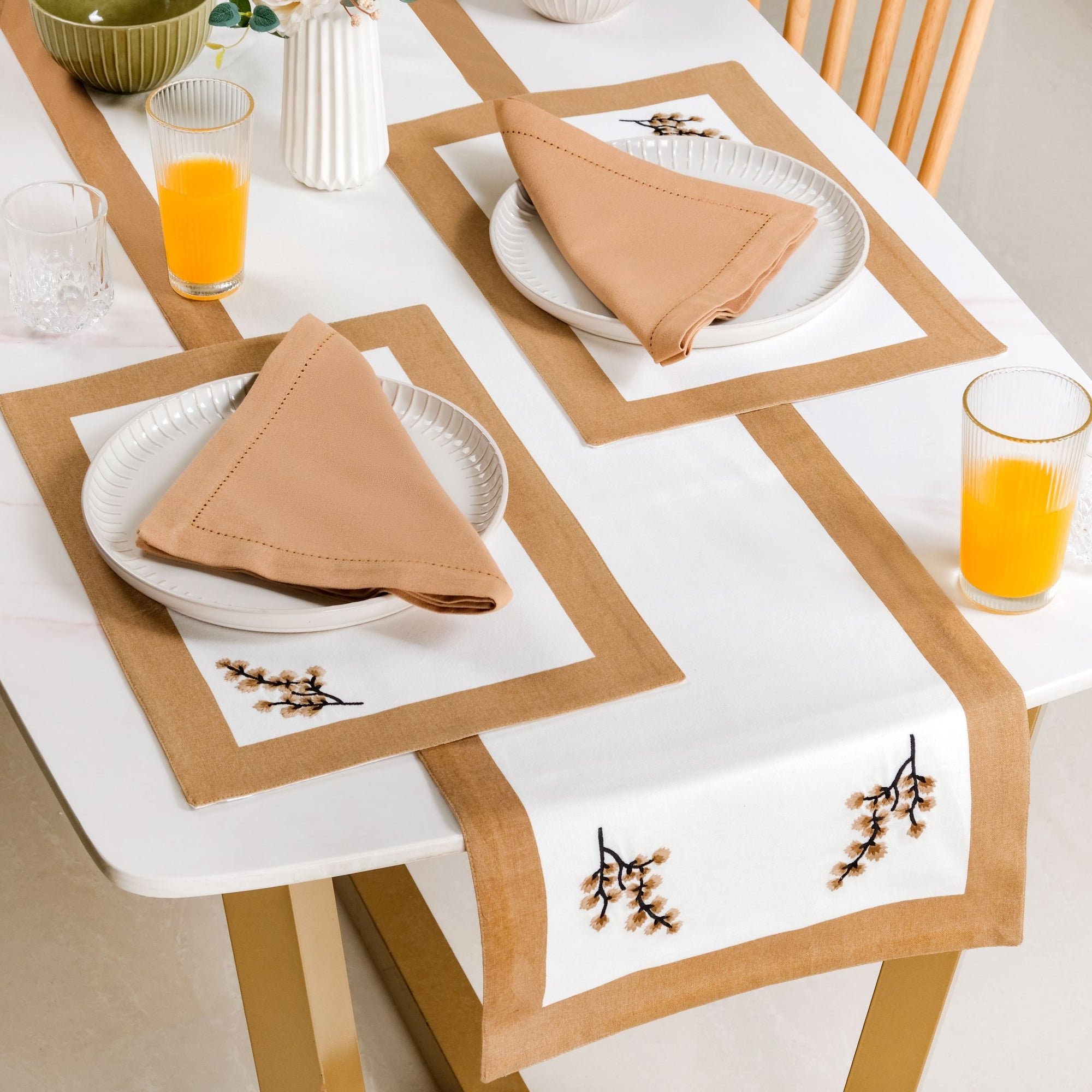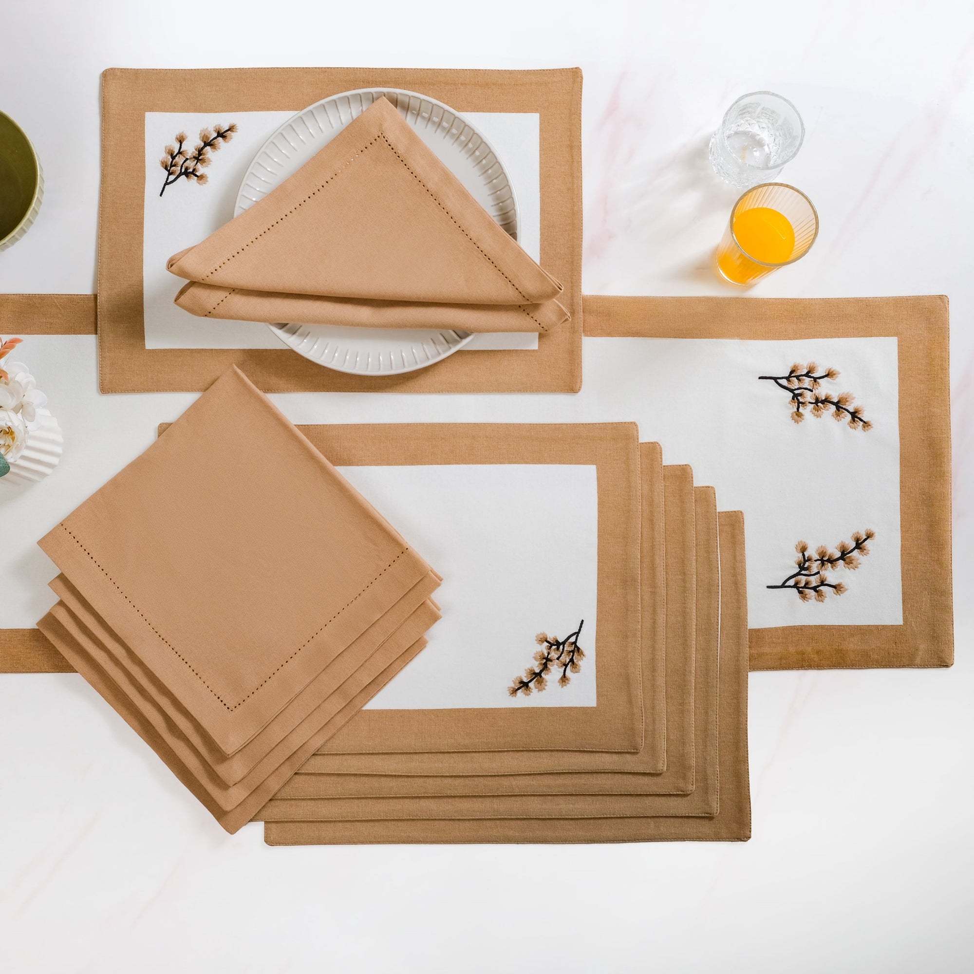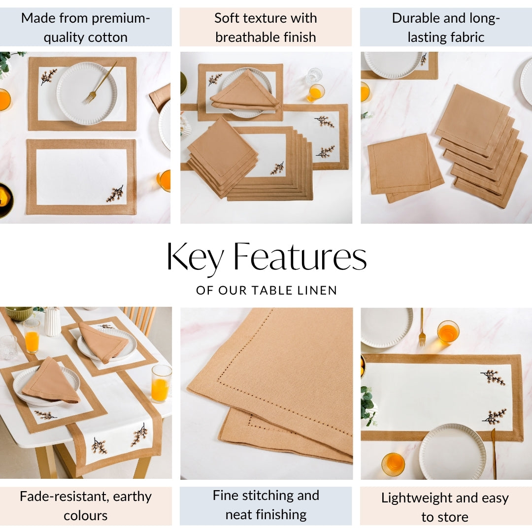 Design: This set includes six rectangular placemats, six rectangular napkins, one long table runner, and a fabric pouch for compact storage. All pieces feature a clean white base bordered with a warm, earthy brown for visual contrast. The placemats and runner are delicately embroidered with soft tree branch motifs in pastel tones. Napkins have a lightweight matte finish and overlocked edges for a minimal, refined appearance. The runner adds visual structure to the centre of your table with motifs at both ends. A coordinating drawstring pouch in matching tones stores the entire set neatly for easy organisation.