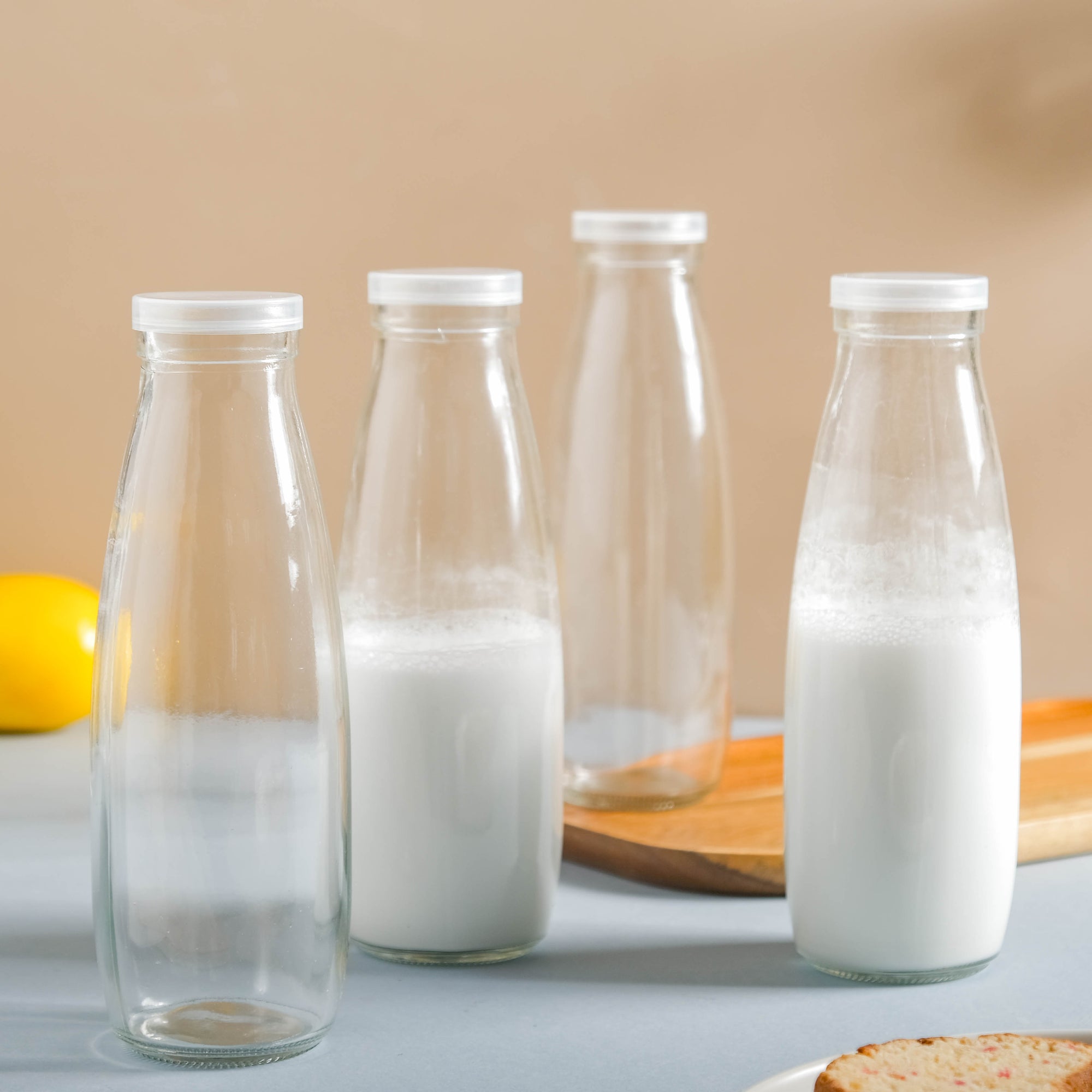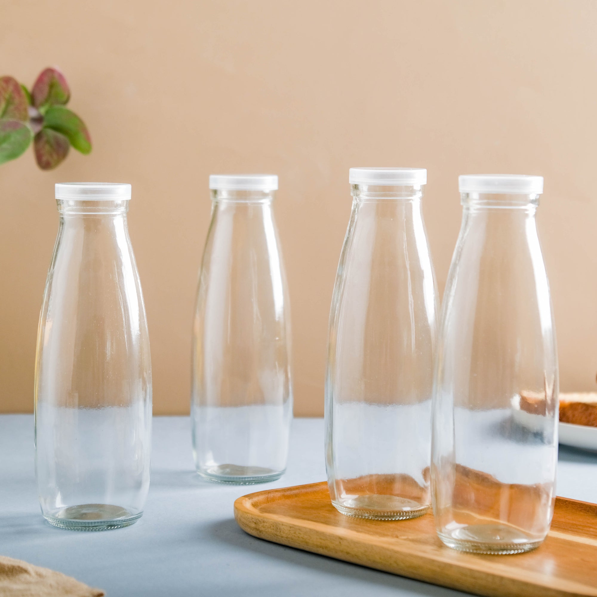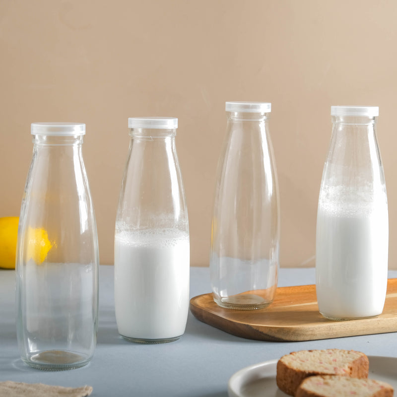 Hygienic airtight glass bottles with a lid. The glass bottles, available in a set of 4, sprinkle the vintage charm to whichever setting they are added. Embodying a cylindrical shape, each bottle is modelled to live up to the urbane demand of routine house or office decor. The durable glass bottles with PVC lids can help store fruit juices, milk, or simply water.