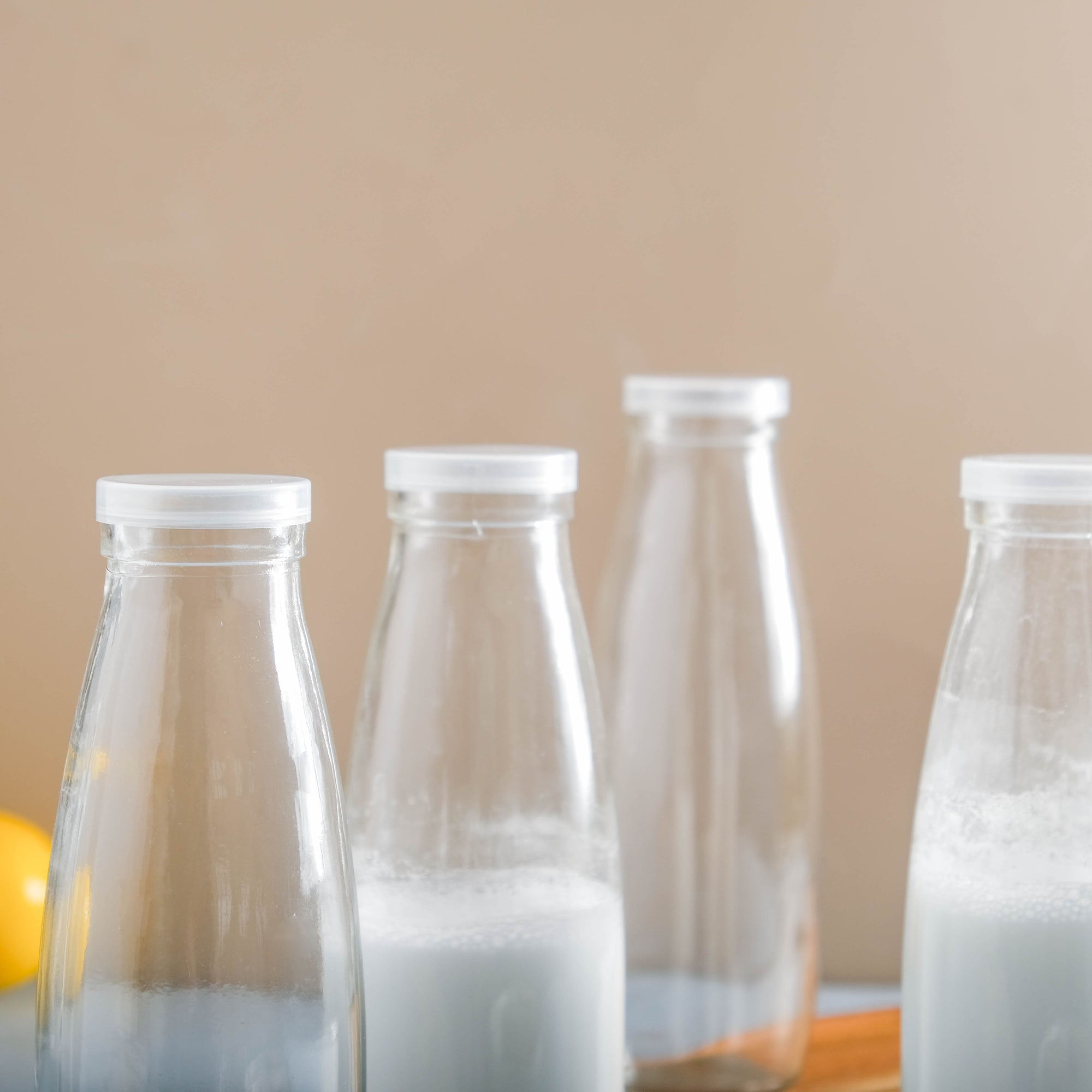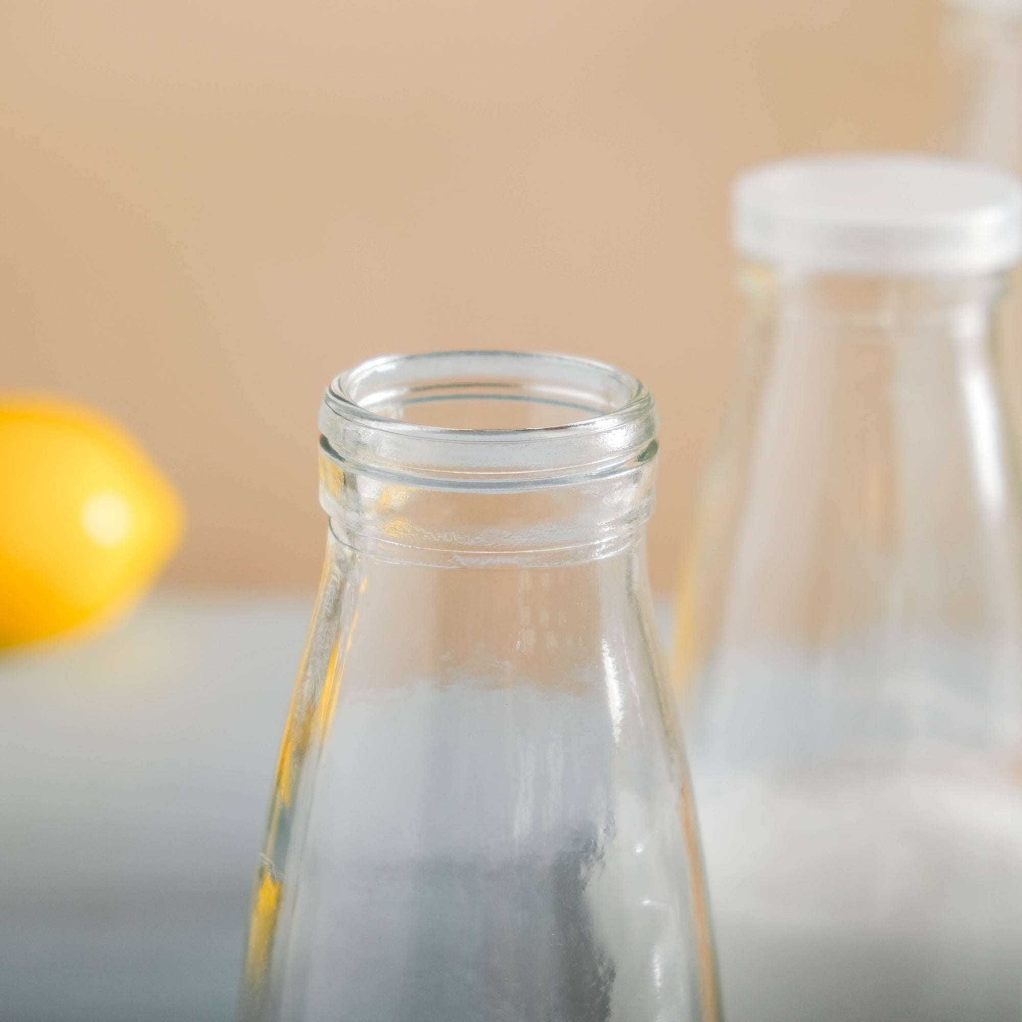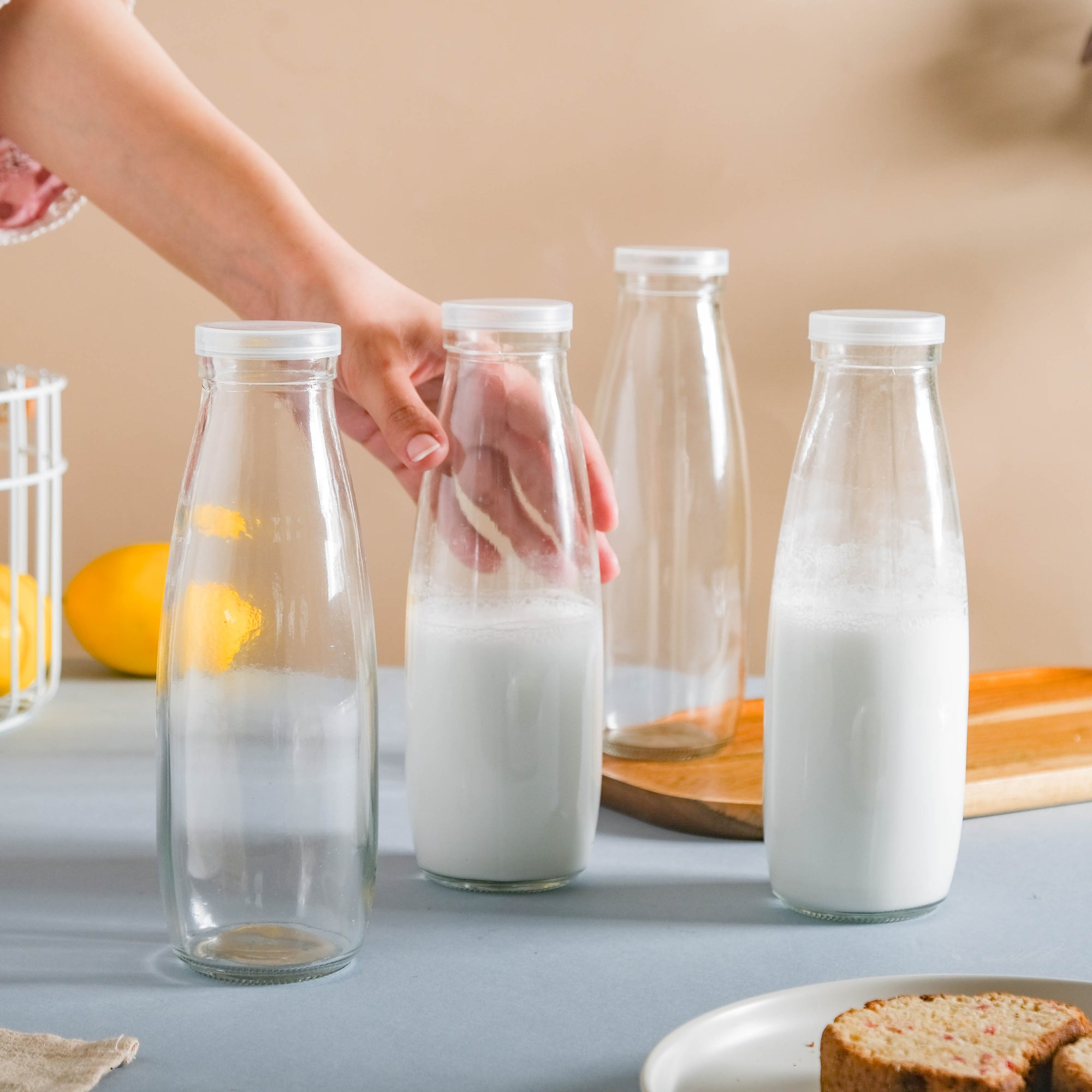 Hygienic airtight glass bottles with a lid. The glass bottles, available in a set of 4, sprinkle the vintage charm to whichever setting they are added. Embodying a cylindrical shape, each bottle is modelled to live up to the urbane demand of routine house or office decor. The durable glass bottles with PVC lids can help store fruit juices, milk, or simply water.