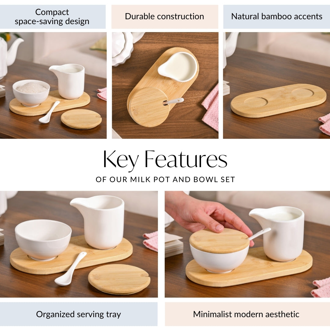 Design: This set includes a ceramic milk pot with a smooth spout, a round sugar bowl with a bamboo lid, and a white ceramic spoon that rests neatly in a spoon slot. The compact bamboo tray with rounded edges holds everything in place. With a sturdy ceramic build and neutral tones, the lightweight set suits both modern and minimalist tables.