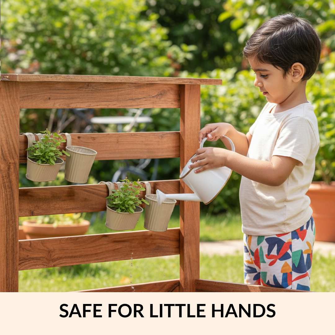 Benefits: The iron build offers dependable strength for repeated use while keeping the planters stable once filled. Ribbed sides help maintain structure and make the planters easier to handle. Integrated hooks allow flexible placement on rails, shelves, or edges without additional hardware. Drainage holes help release excess water, supporting healthier plant growth. The neutral beige taupe finish blends easily with modern interiors, making the planters easy to style while introducing beginners or children to simple gardening.