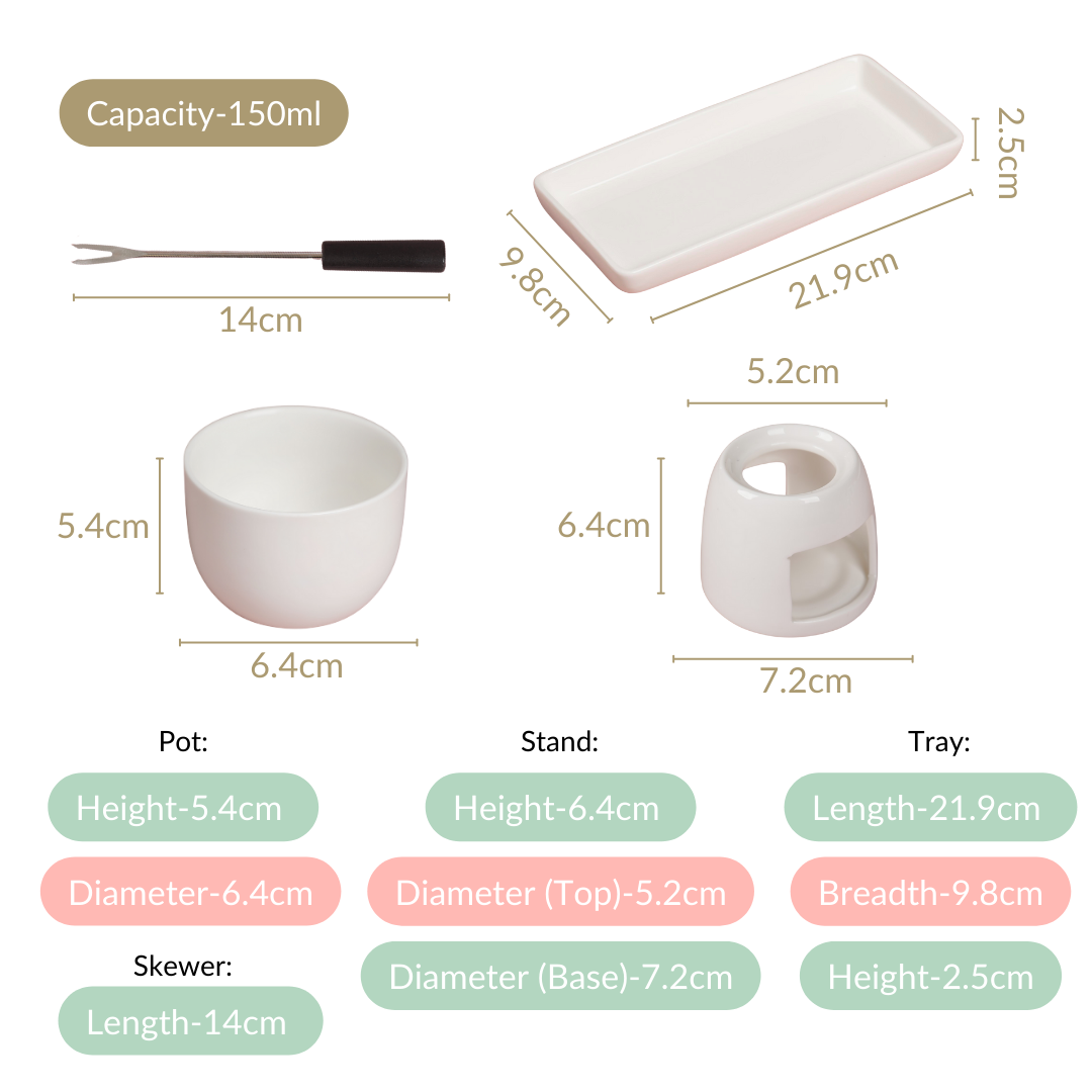 Design: Enjoy the artistry and functionality of our ceramic fondue set, a stunning addition to any dining experience. Crafted entirely in pristine white ceramic, this set embodies elegance and modernity. The fondue pot and stand, both sleek and ergonomic in design, maintain the perfect temperature for your favourite melted delicacies. A ceramic tray effortlessly complements the ensemble, providing a stylish base for the pot and stand while offering ample space for dipping accompaniments. Stainless steel skewers with sleek black handles add a touch of contrast and practicality to this sophisticated design.
