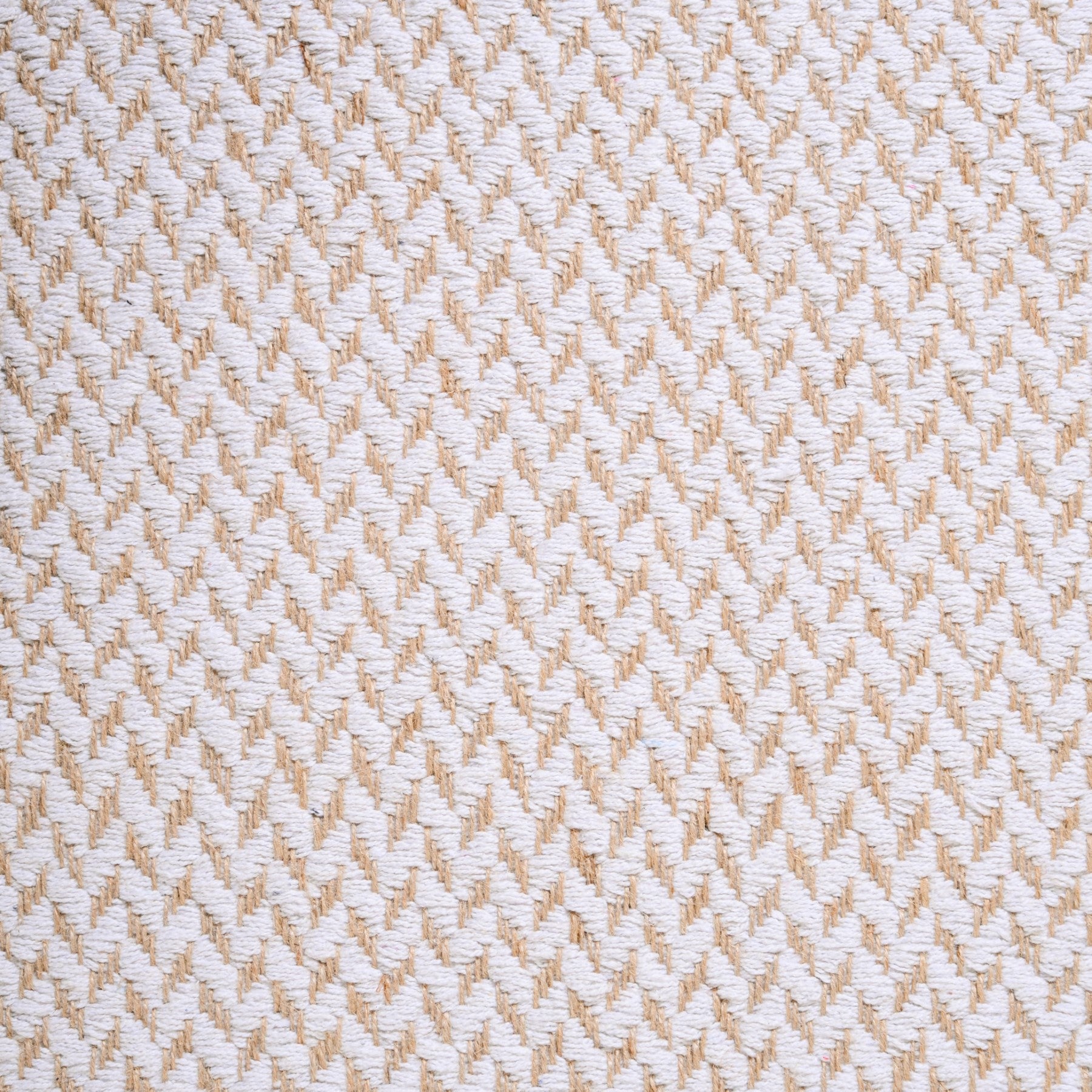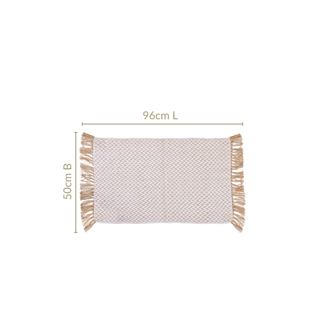 Design: Made from a natural mix of jute and cotton, this rectangular floor mat features a repetitive chevron pattern in light brown and white tones that effortlessly grounds a space. The subtle texture adds visual movement while maintaining a clean, structured look. Its fringed tassel edges introduce a rustic softness that feels right at home in both contemporary and casual corners. The muted palette and natural weave make it a go-to piece for earthy aesthetics, while its foldable form allows easy handling and seasonal swaps.