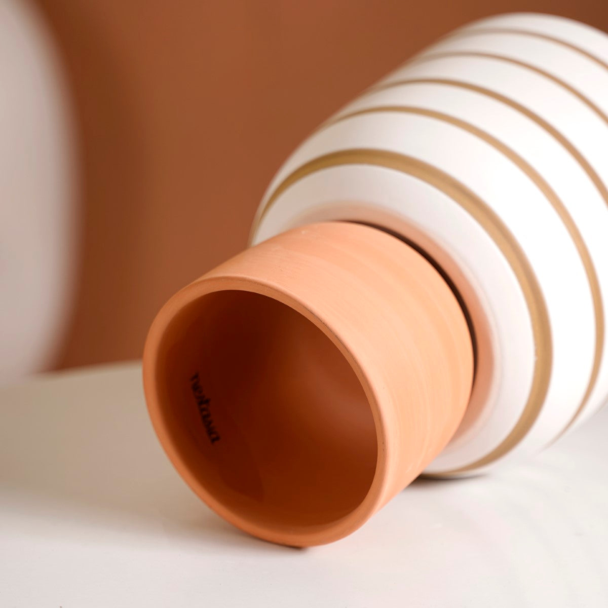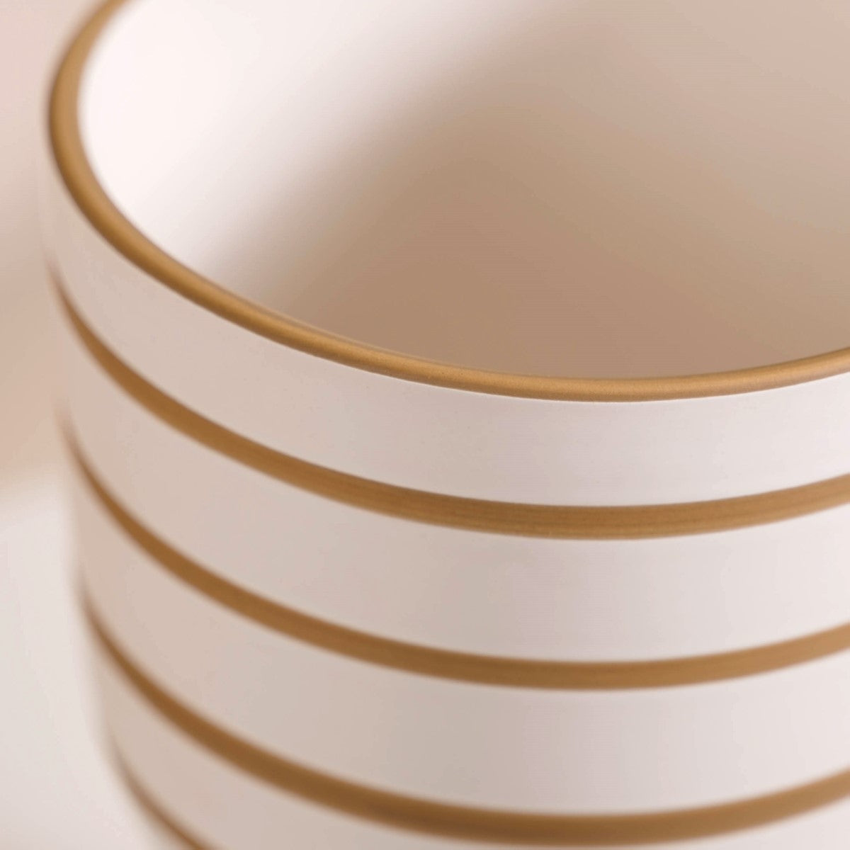 Introducing our exquisite flower pot, which is a perfect fusion of style and function. The stunning flower vase boasts a bowl-shaped clear white top, making it an ideal canvas to showcase your favourite fresh or artificial flowers, allowing it to effortlessly blend into your home decor. The beige stripes encircling the top add a touch of refinement, and the beige base adds a stunning tonal contrast. The contemporary ceramic pot is expertly crafted from high-quality ceramic, ensuring durability and longevity. Seamlessly combining two different colours and textures, the vase boasts a rustic matte texture for a superb tactile experience.