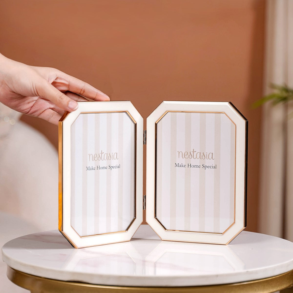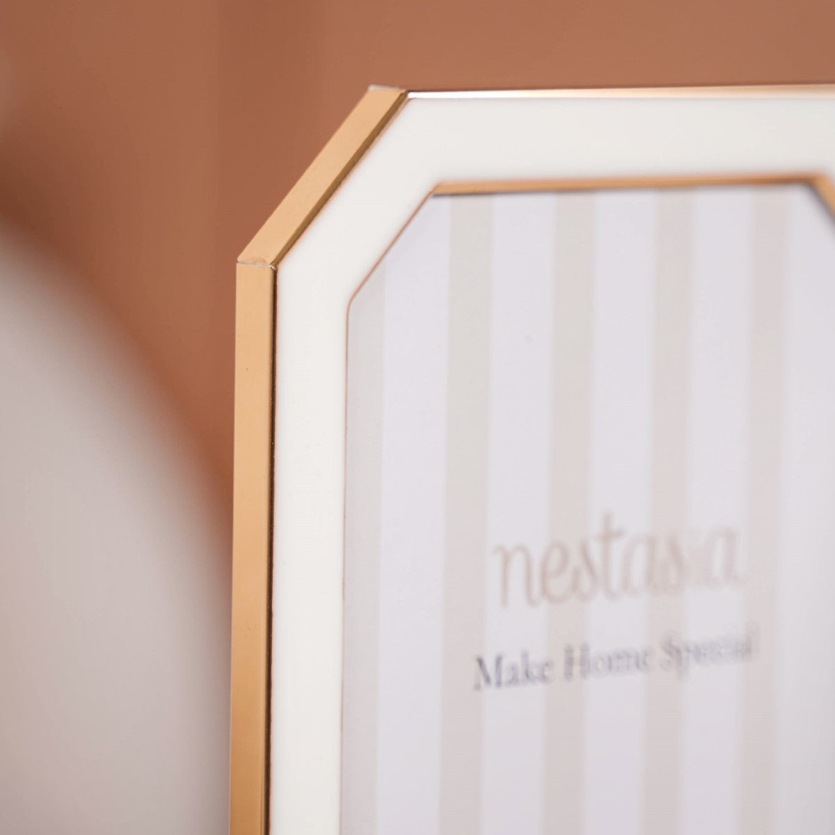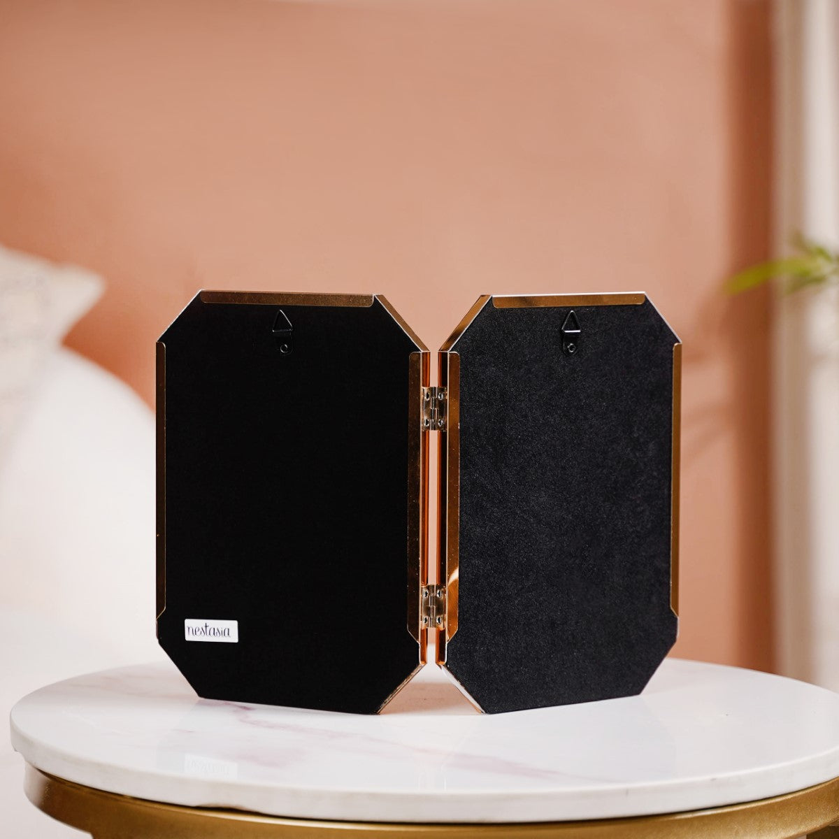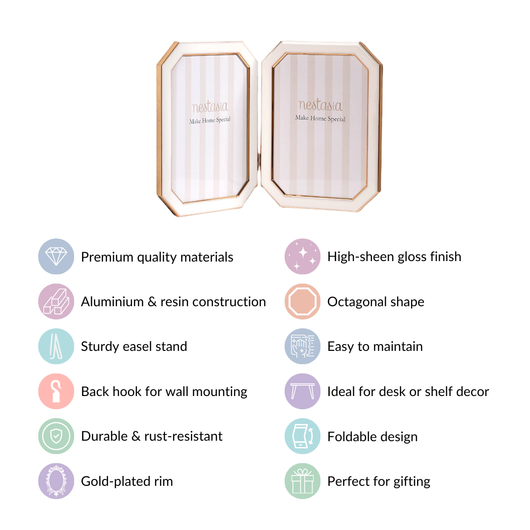 Absolutely! This versatile photo frame is ideal for displaying on your desk or shelf, thanks to its carefully designed features. Crafted from premium quality materials, including aluminium and resin, it not only adds a touch of elegance but also offers robust durability. The frame is equipped with a sturdy easel stand, making it perfect for tabletop display on your desk or shelf. Its foldable design adds a practical dimension to your decor options. Whether you choose to showcase it on your desk, shelf, or any other flat surface, this frame's octagonal shape, high-sheen gloss finish, and gold-plated rim will enhance the ambience of your space. It's a perfect choice for elevating your decor and can also make a thoughtful gift for your loved ones.
