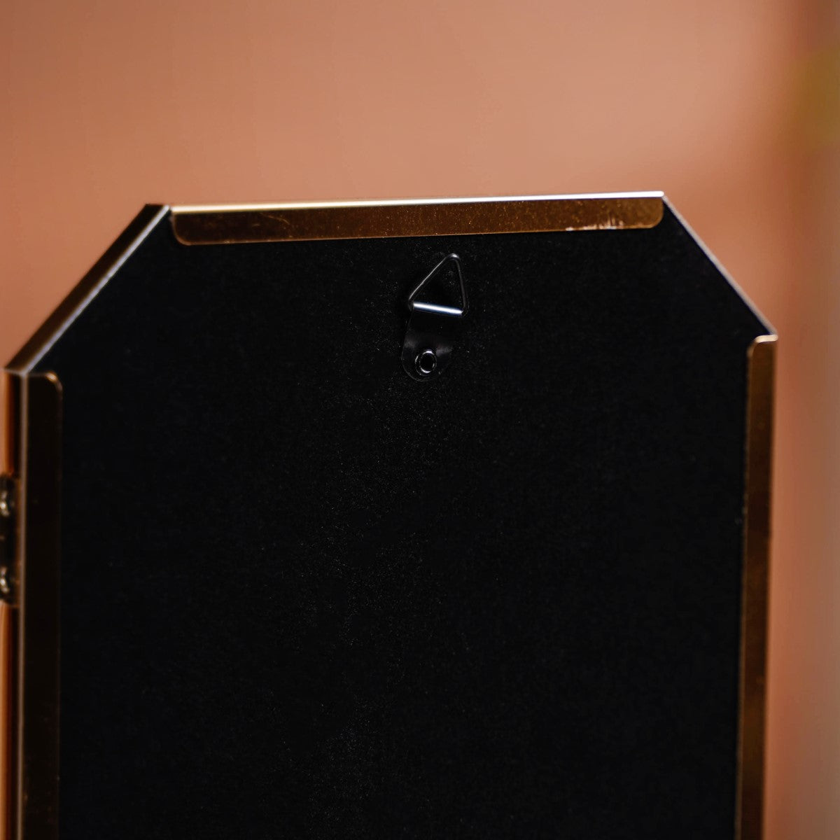 Absolutely! This photo frame is designed for maximum versatility. It not only features a sturdy easel stand, making it perfect for desk or shelf display but also includes a convenient back hook for wall mounting. You can easily switch between these display options based on your preferences and the aesthetics of your space. The frame's combination of premium materials, a gold-plated rim, and its octagonal shape add an elegant touch to any wall or surface, making it a standout piece of decor. Whether you choose to showcase it on your desk, or shelf, or hang it on the wall, this frame is a fantastic choice for displaying your cherished memories.