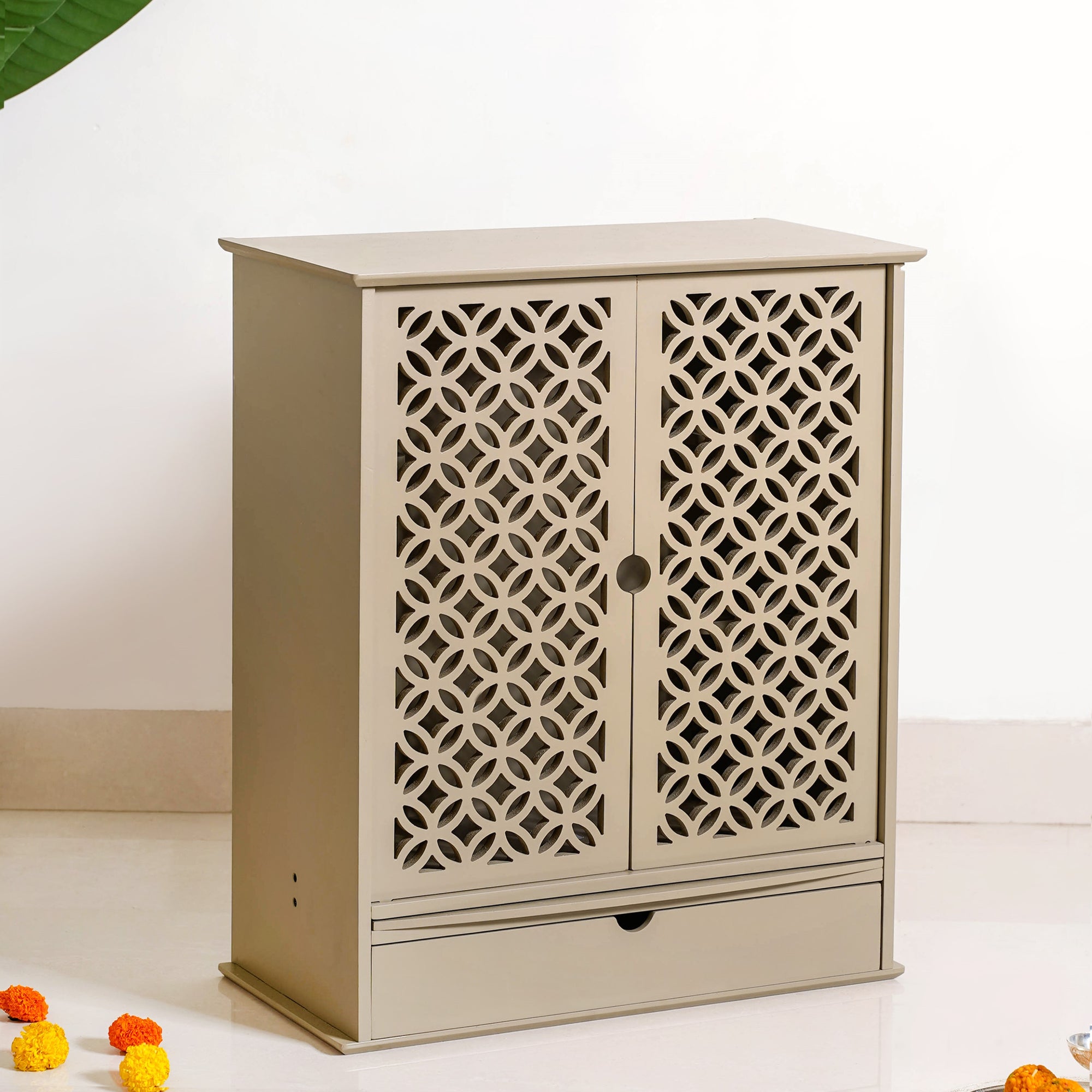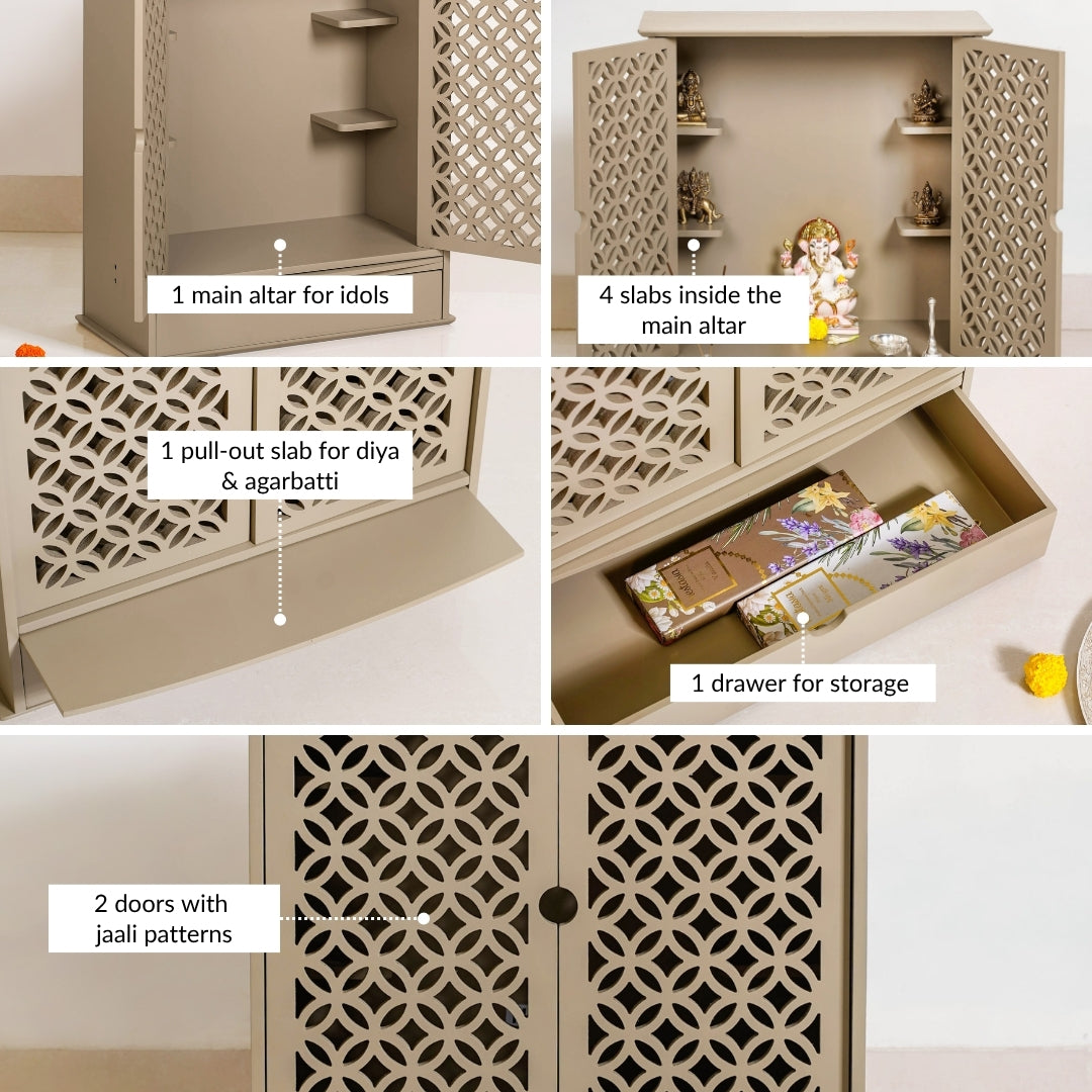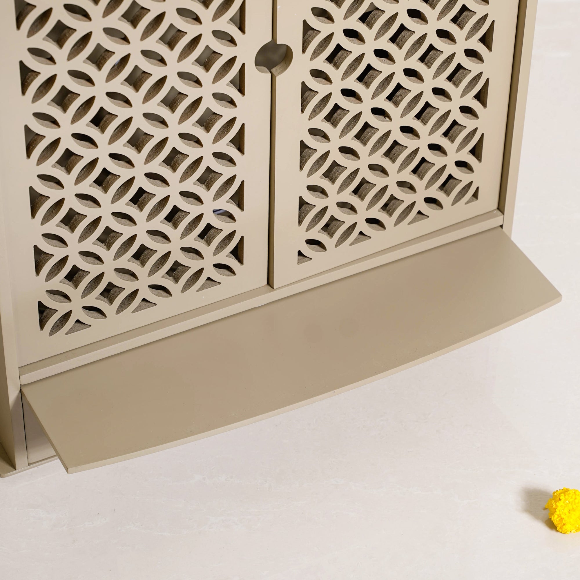 Design: Discover the refined craftsmanship of this taupe mandir for the home. Constructed with durable MDF and a premium pre-laminated finish, this elegant unit features an intricate detailing of geometric Jali patterns. The taupe tone blends effortlessly with modern interiors, adding warmth without overwhelming the space. A beautiful perforated latticed screen on its front doors ensures gentle ventilation and a reverent view. The space-saving structure includes a main altar for idols and four side slabs inside the main altar for showcasing smaller idols.
