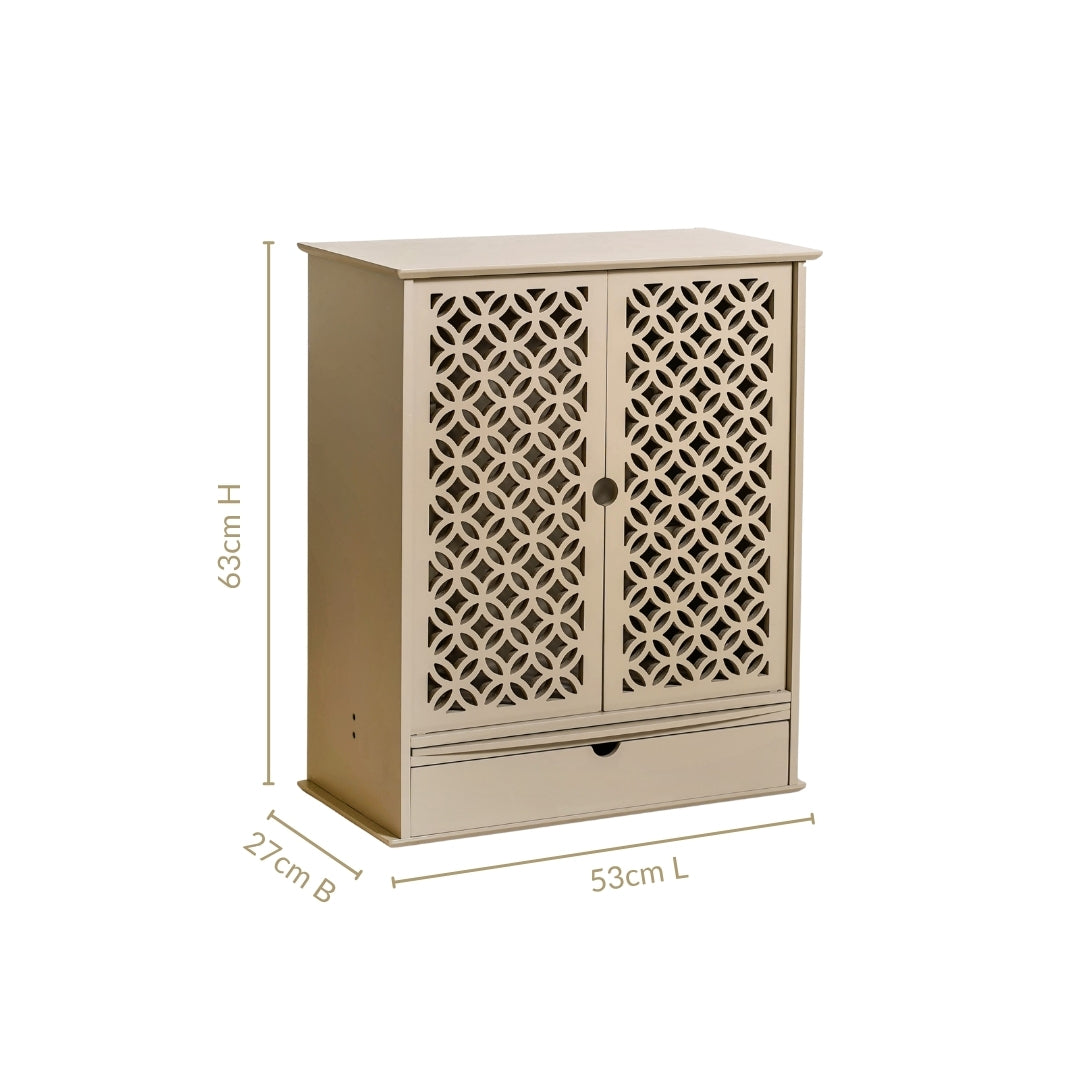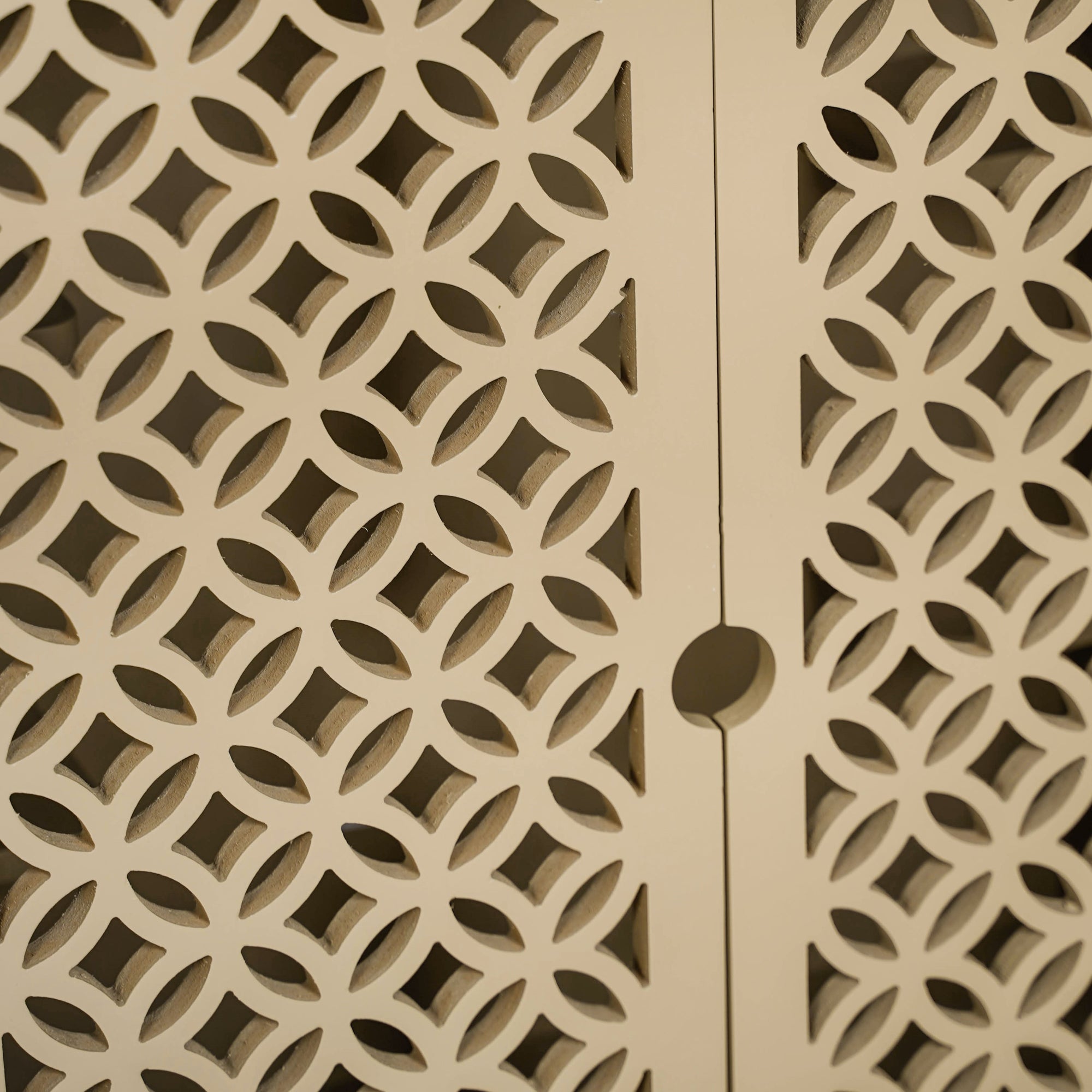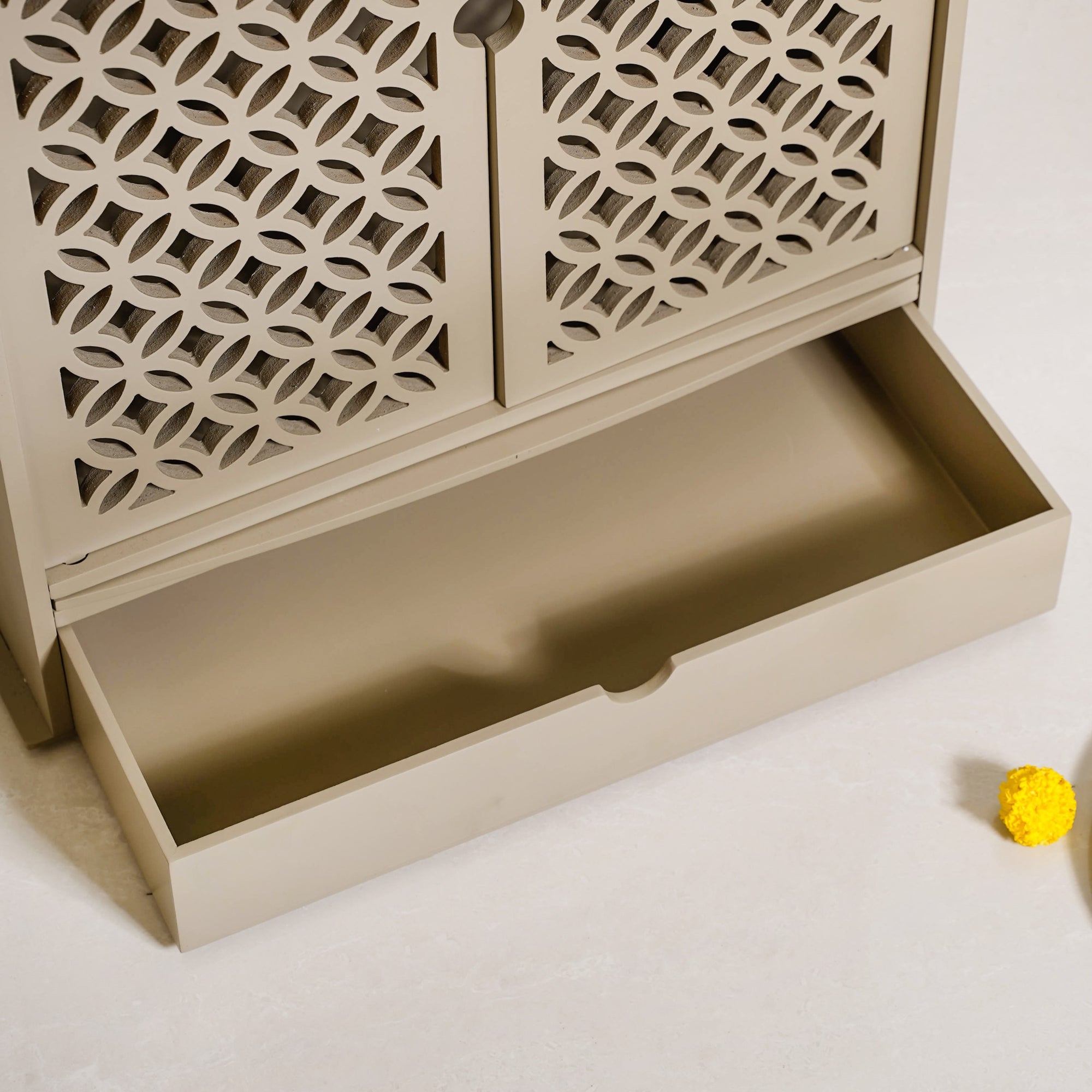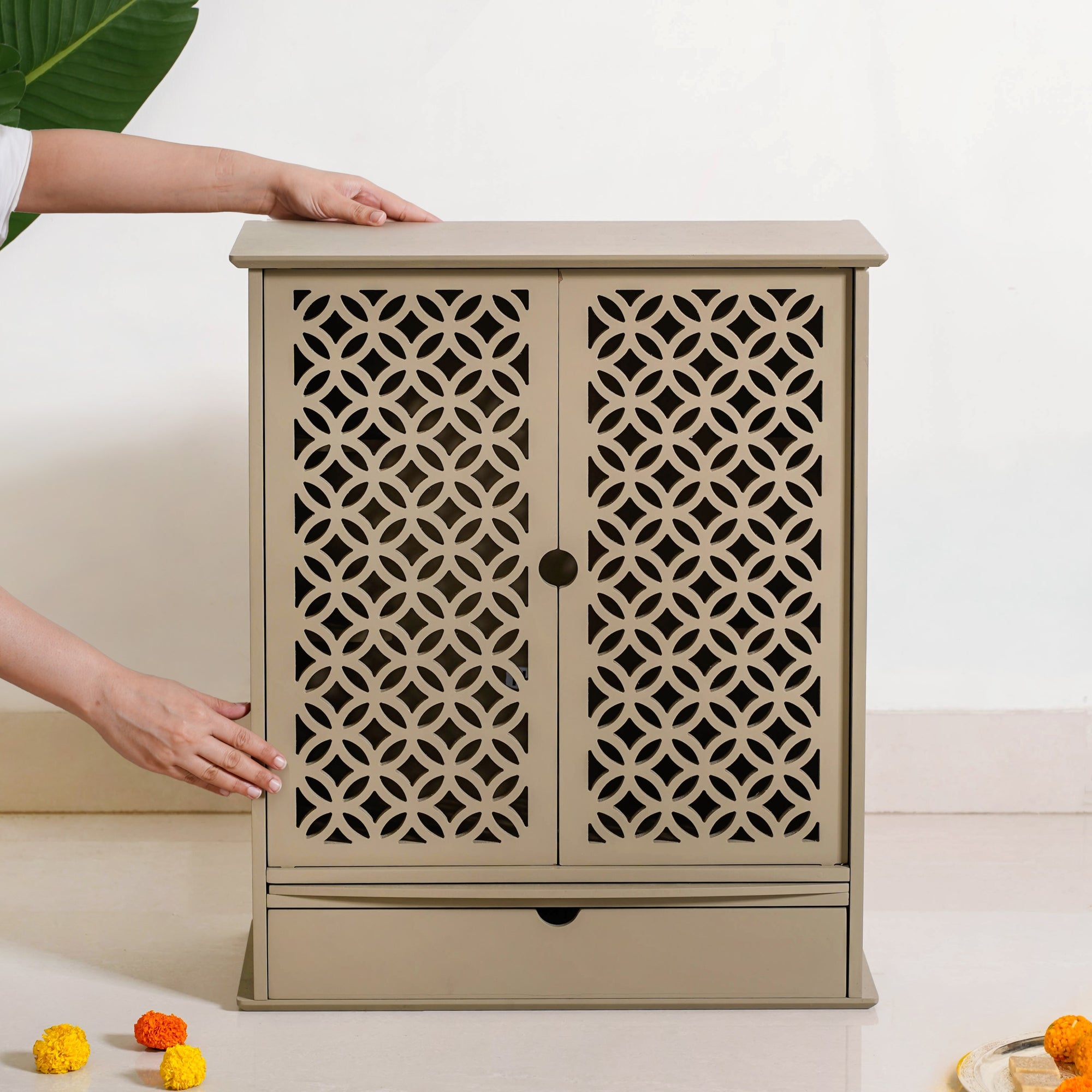 Design: Discover the refined craftsmanship of this taupe mandir for the home. Constructed with durable MDF and a premium pre-laminated finish, this elegant unit features an intricate detailing of geometric Jali patterns. The taupe tone blends effortlessly with modern interiors, adding warmth without overwhelming the space. A beautiful perforated latticed screen on its front doors ensures gentle ventilation and a reverent view. The space-saving structure includes a main altar for idols and four side slabs inside the main altar for showcasing smaller idols.