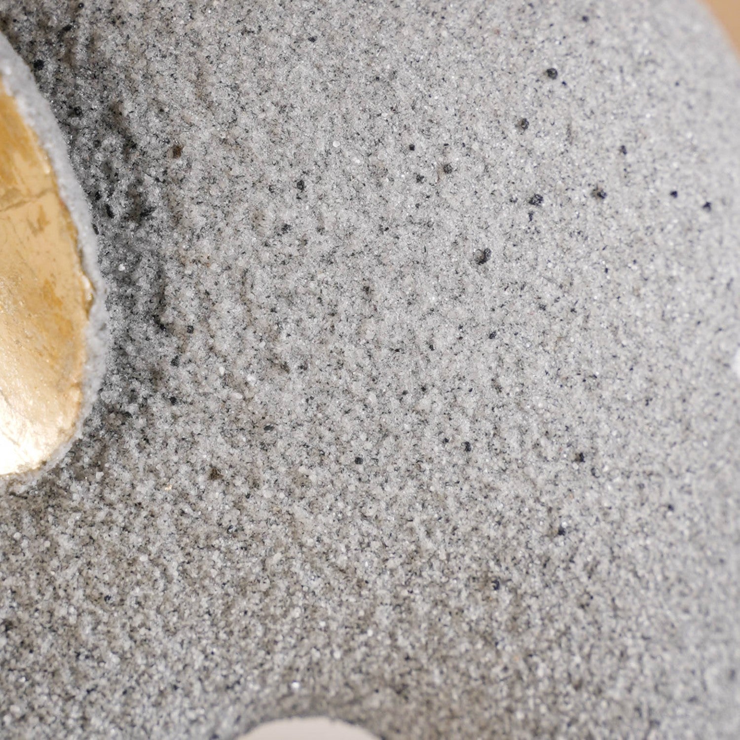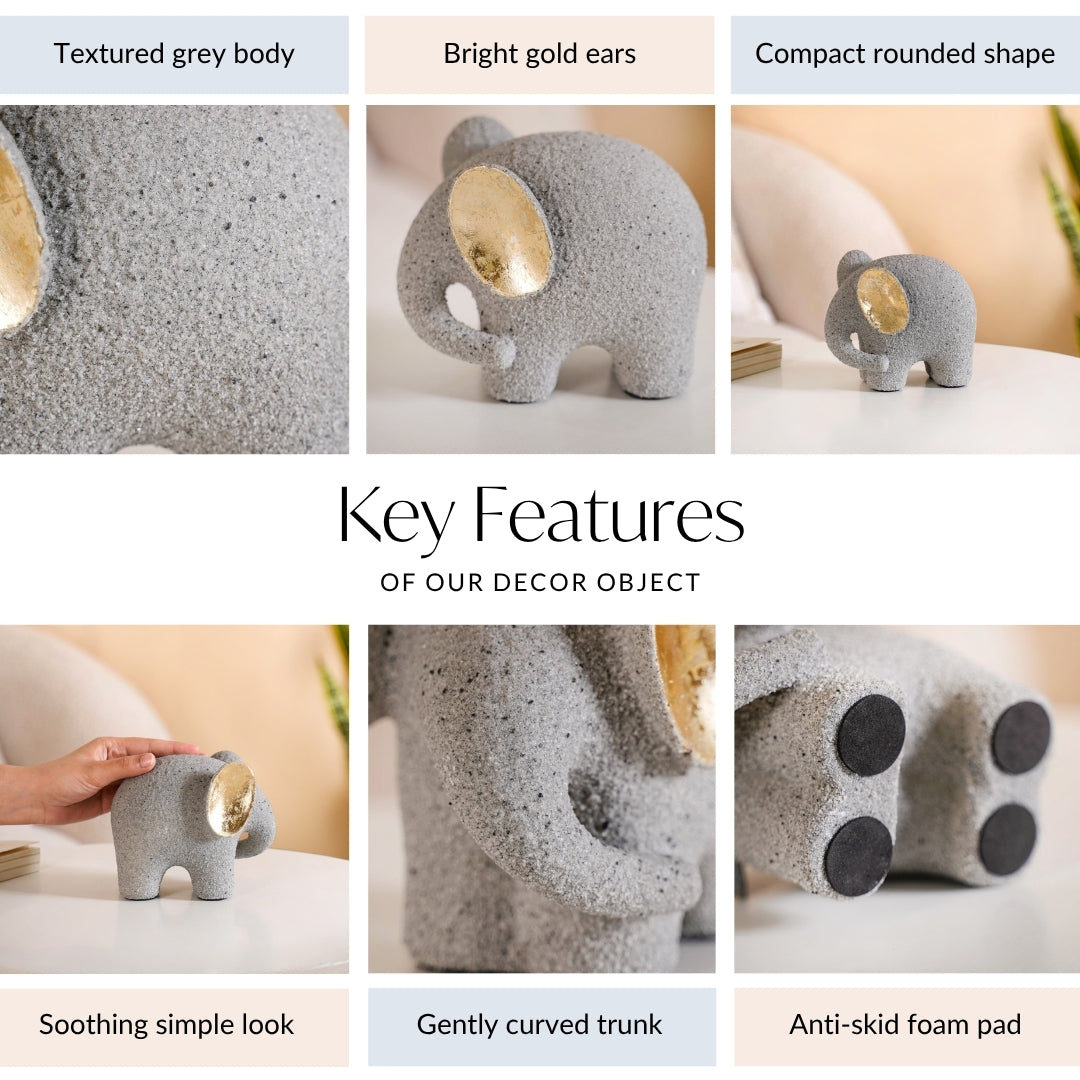 Design: The design features a compact, rounded elephant body shape overall, rendered in a minimalist, smooth form that captures the animal shape. The body shows a speckled, textured grey finish, while one ear features a smooth, bright gold panel. This work of art is crafted from premium resin. The trunk is curved close to the front, and the figure stands firmly on four block legs. Its curved profile offers a sweet, simple look, and the small size fits easily on narrow shelves.