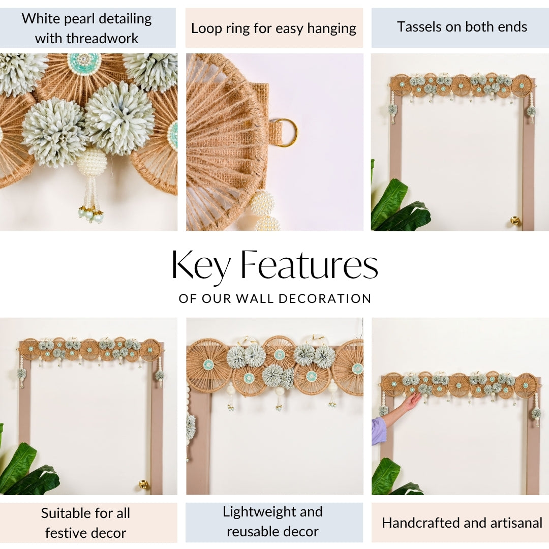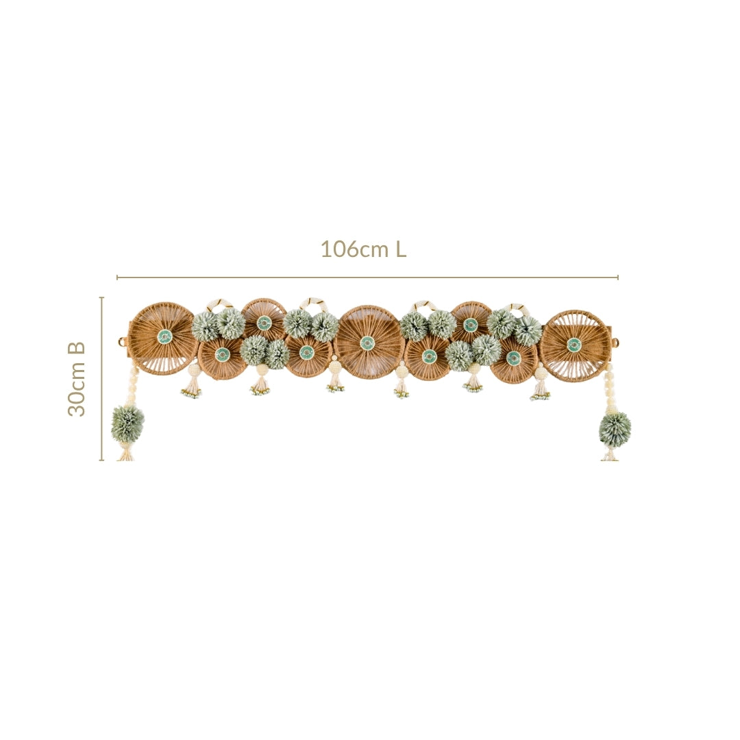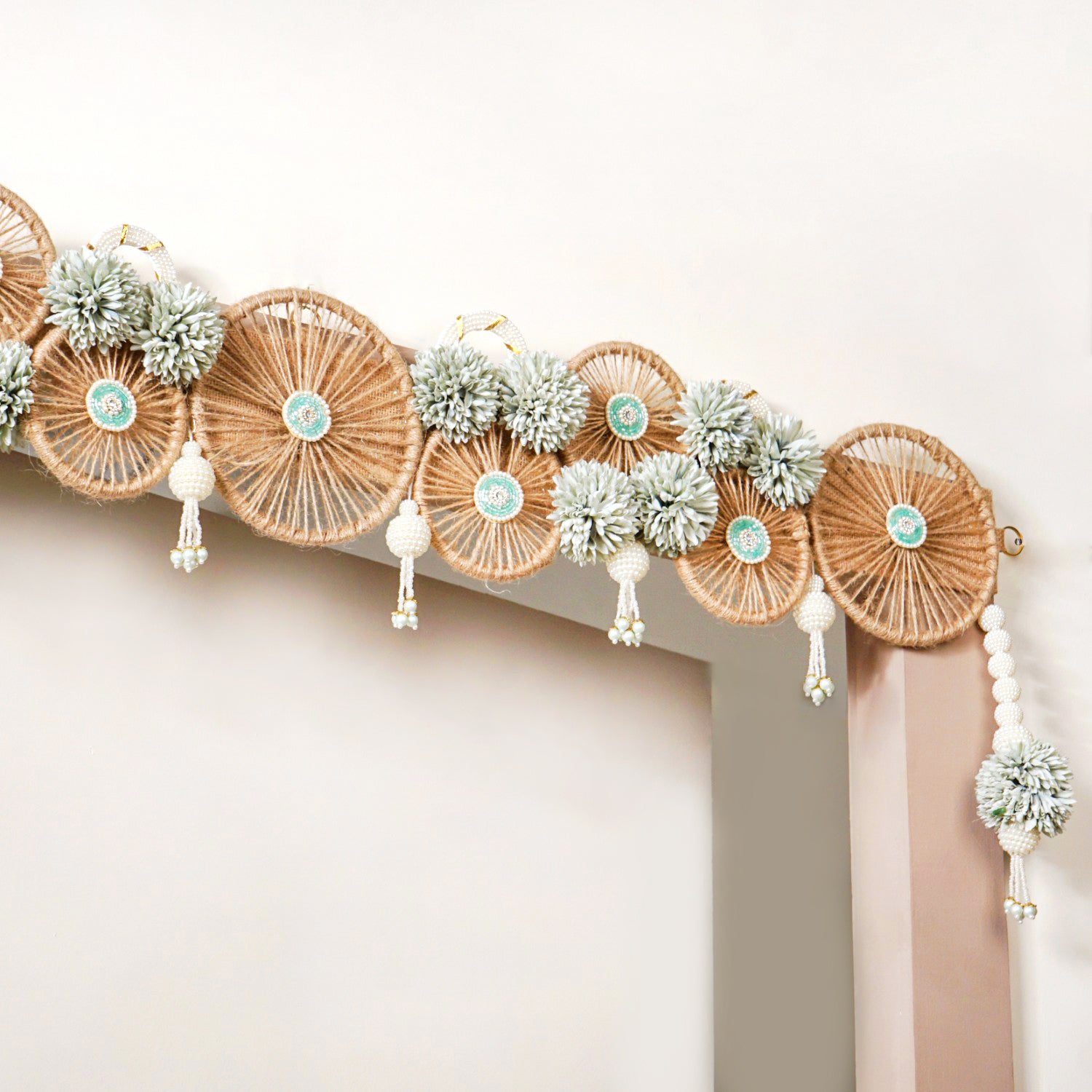 Design: Crafted with a circular base tightly wrapped in jute thread, this toran features alternating large and small rings arranged in a symmetrical layout. The centre of each ring showcases mint green bead embellishments, while sage green artificial flowers lend a soft, elegant touch. The design is further enhanced with pearl and bead tassel hangings at intervals. Golden rope loops on the top allow for easy hanging. The earthy jute paired with pastel florals gives it a grounded, natural appeal. Its compact and lightweight build makes it ideal for decorating doors, walls, and puja spaces.
