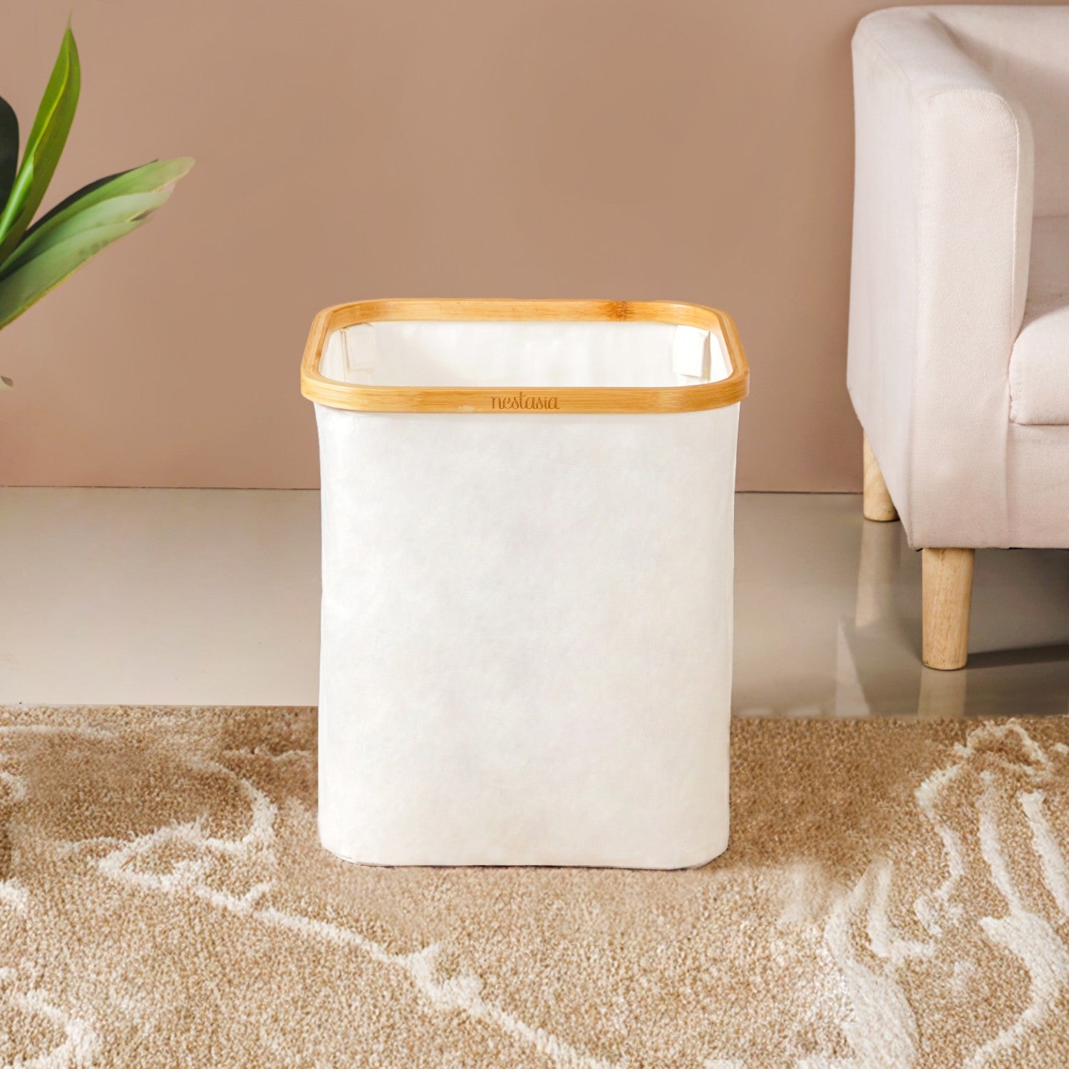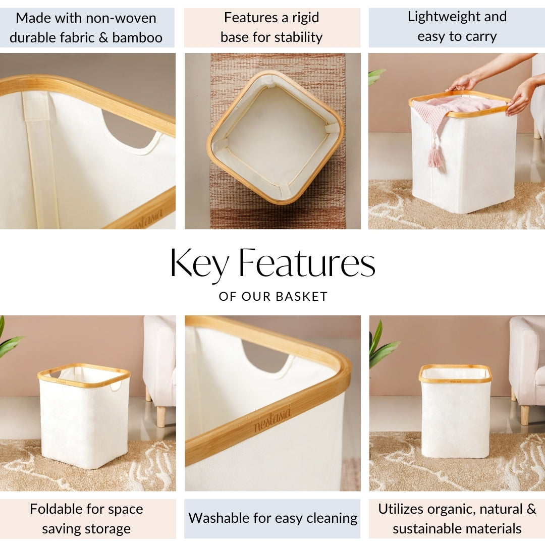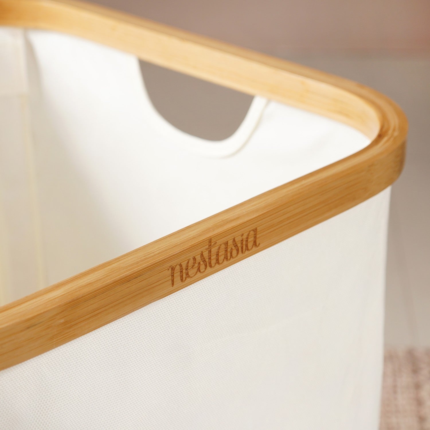 Design: Discover the clever construction of this rectangular basket, made to blend effortlessly into any room. It’s crafted from sturdy natural bamboo and smooth beige nylon, offering both strength and softness. The fabric’s clean look adds a calming touch to your space. Two cut-out handles make lifting and carrying easy, while four bamboo sticks can be inserted to give the basket its firm shape. These are held securely with a velcro closure. A stable base ensures the basket stays upright, even when filled to the brim.