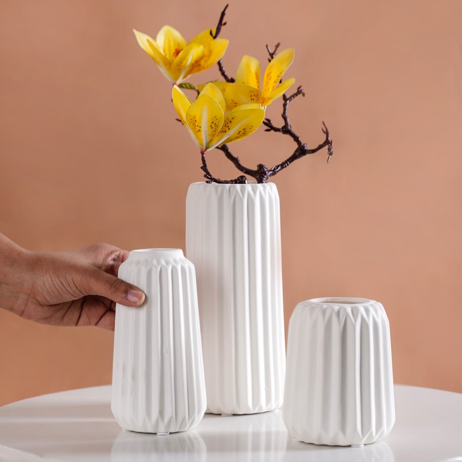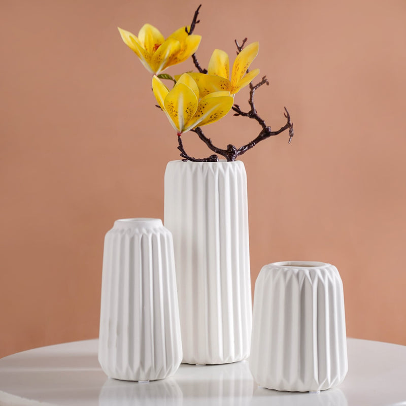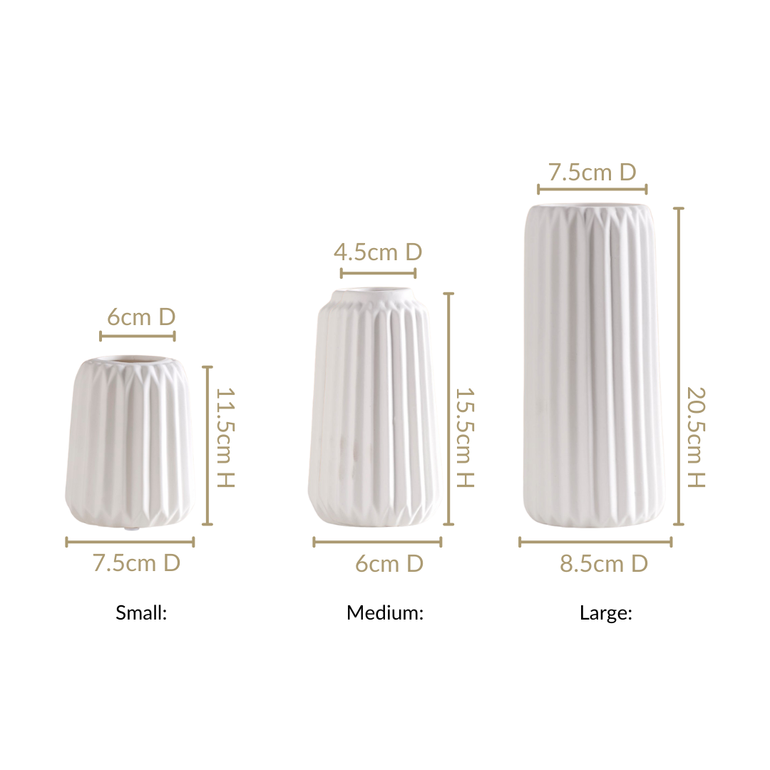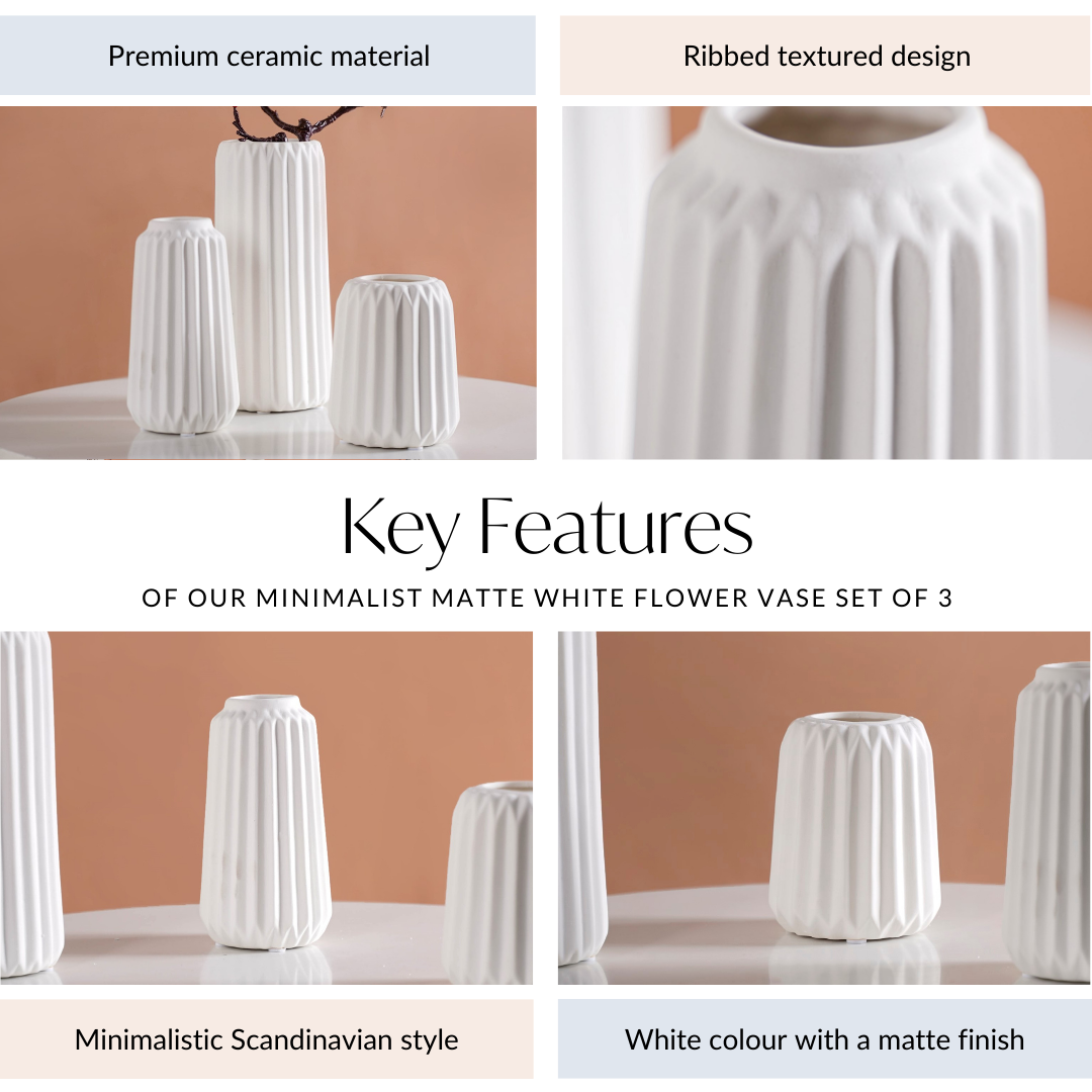 Design: Crafted in a minimalistic Scandinavian style, each flower vase features a ribbed texture that adds depth and character. The sleek white colour with a matte finish ensures versatility, making the vases a seamless fit for any decor setting.