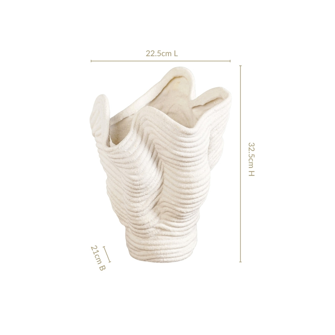 Design: This captivating vase is a unique vessel defined by its undulating, vertical form and striking textured surface. The body features deep, horizontal ridges that create a rhythmic pattern, resembling sea coral. Finished in an ivory neutral colour, the piece maintains a clean, contemporary aesthetic. The wide, wavy opening and substantial base ensure stability for holding flower arrangements.