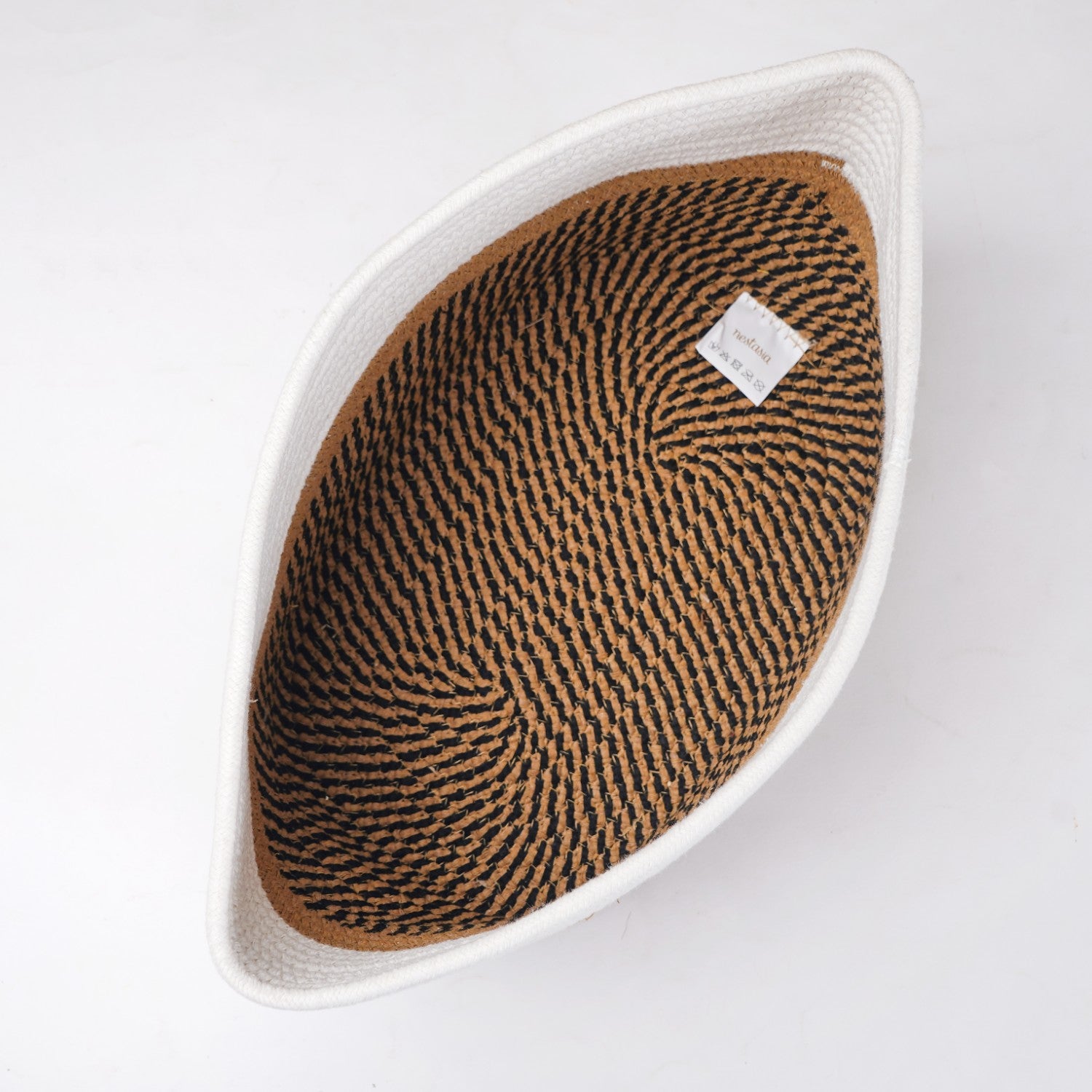 Design: Made with high-quality cotton rope, this laundry basket features a machine-embroidered structure that enhances its durability and intricate detailing. The tricolour design - soft white at the top, earthy brown in the middle, and a striking black geometric pattern at the base - creates a visually appealing contrast. Its flexible yet sturdy form ensures it holds its shape while maintaining a soft touch. The open-top design allows for easy access, while the woven texture adds a handcrafted charm to your space.