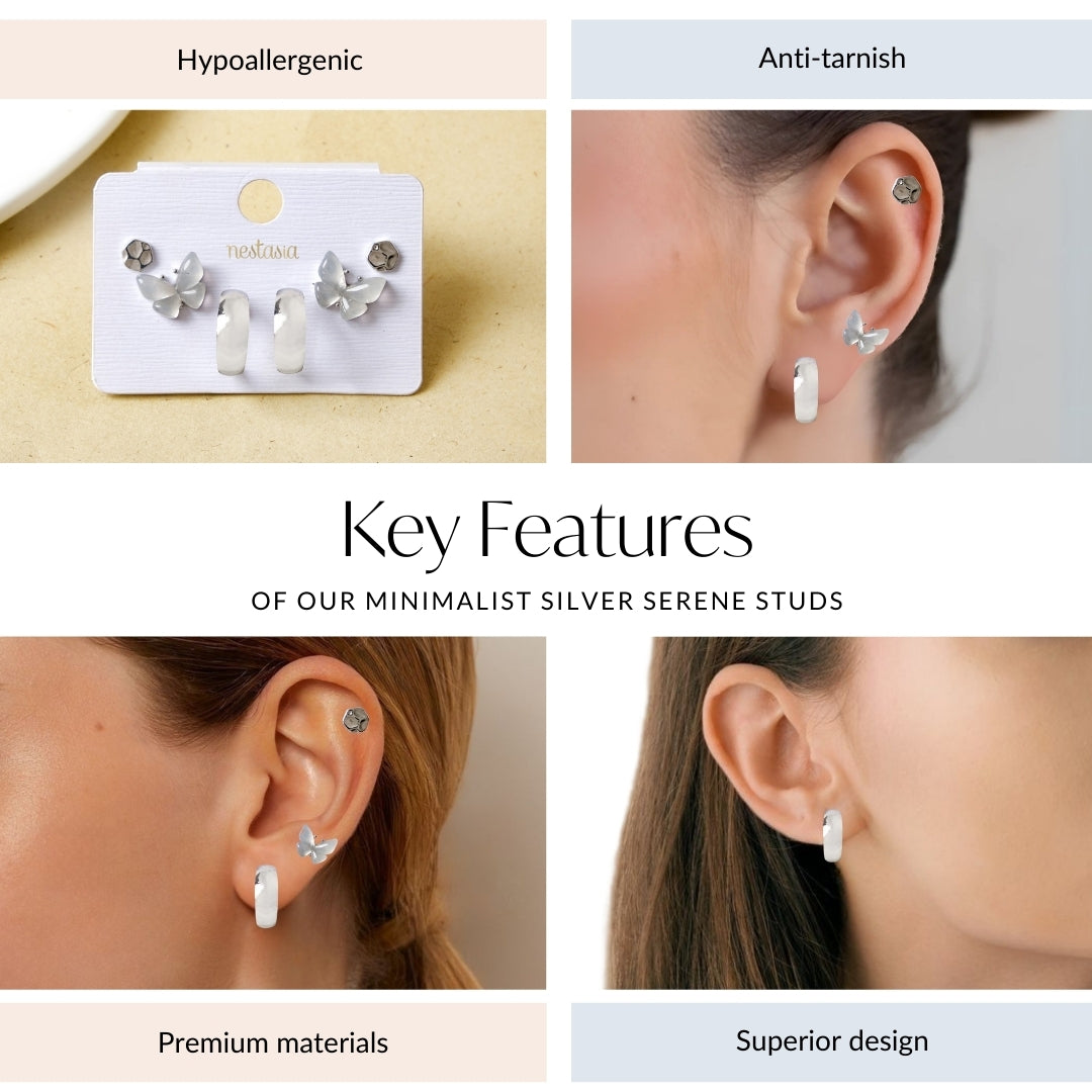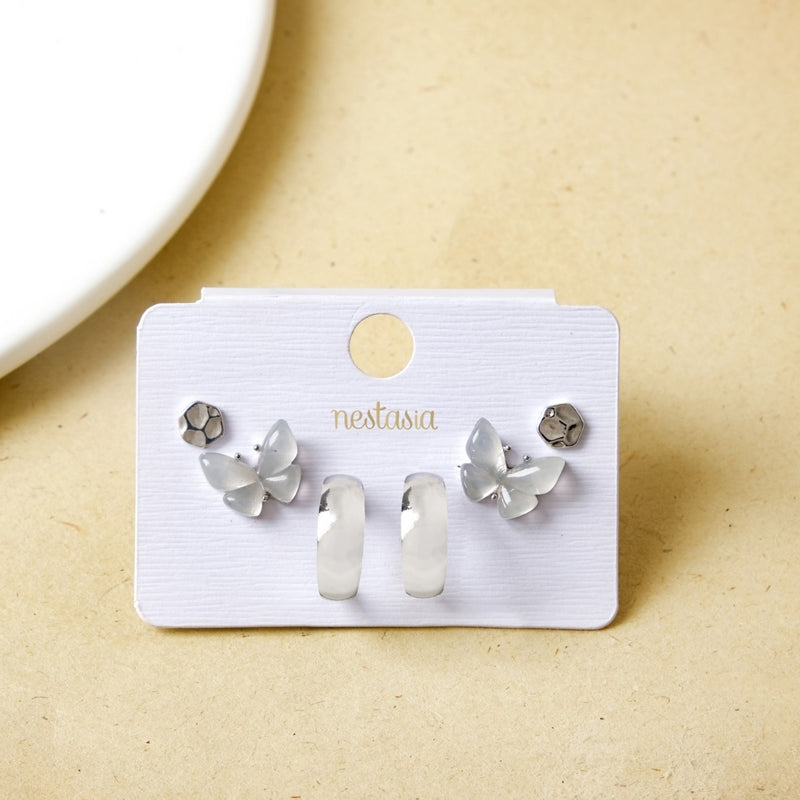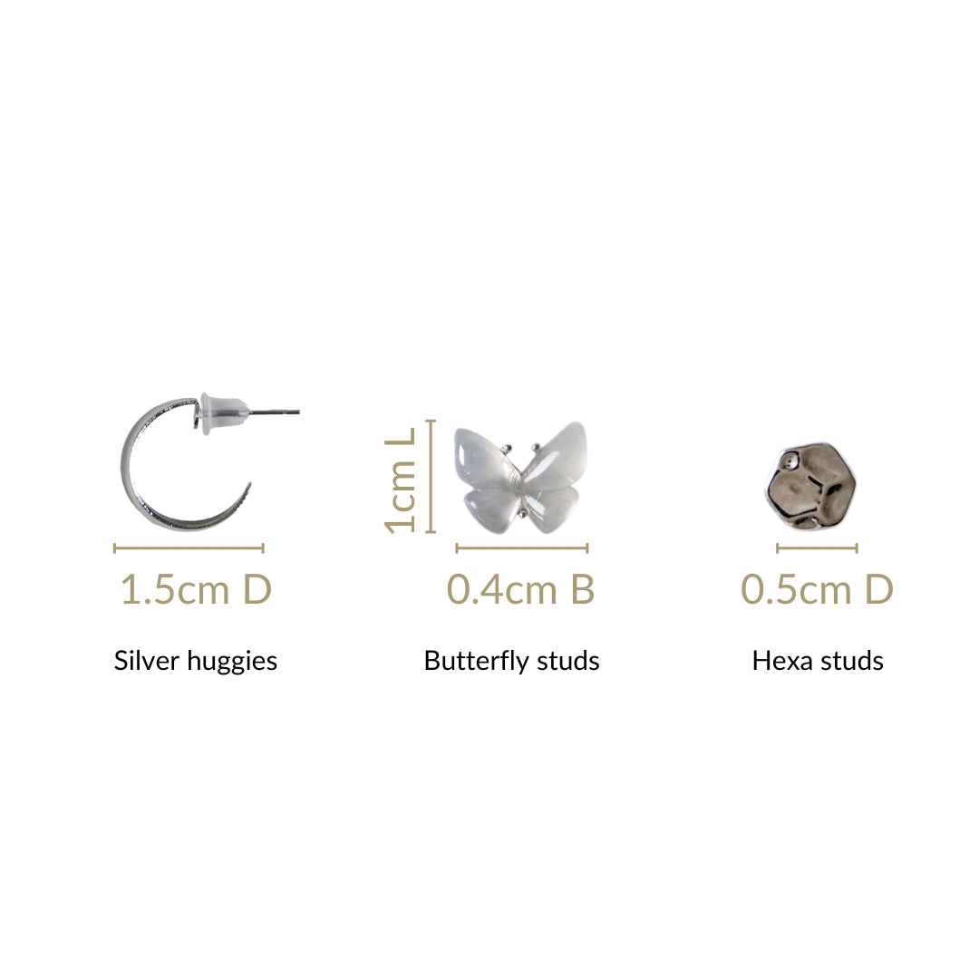 This curated stud set is a celebration of modern simplicity and playful elegance. The first piece, a petite silver huggie hoop, wraps delicately around the ear, embodying understated sophistication. The second stud enchants with a whimsical white resin butterfly, gracefully perched on a gleaming silver plate, offering a touch of nature’s beauty and lightness. The final stud makes a statement with its bold, hexagonal silver design, subtly dented to create a textured, futuristic appeal. Together, these studs weave a story of contrasts — the quiet allure of simplicity and the boldness of modern design.
