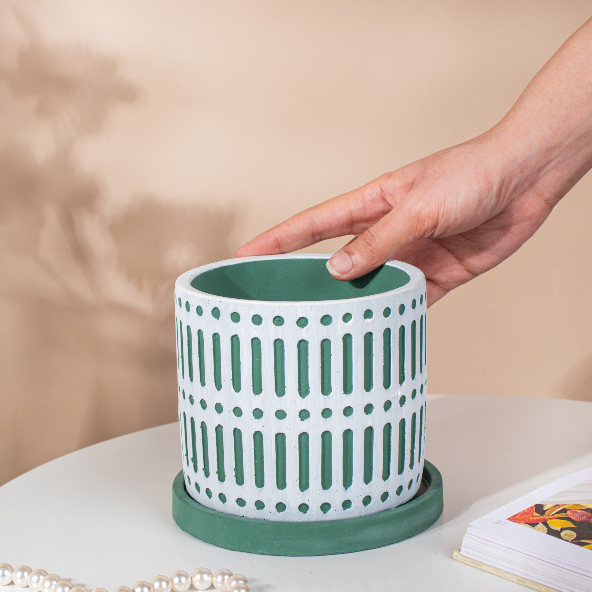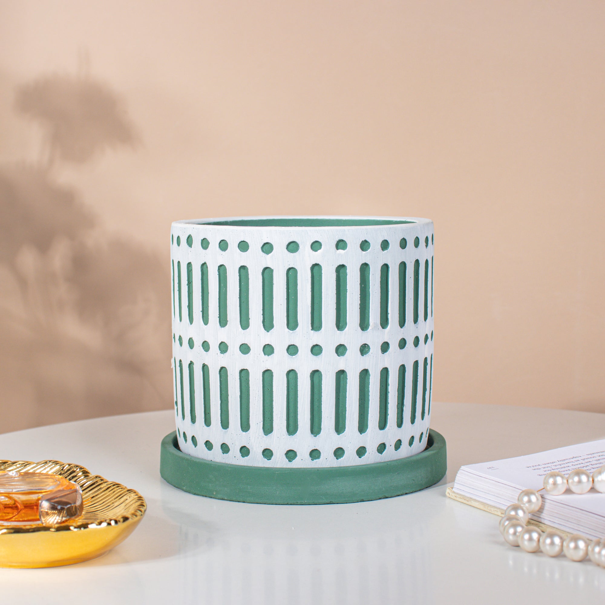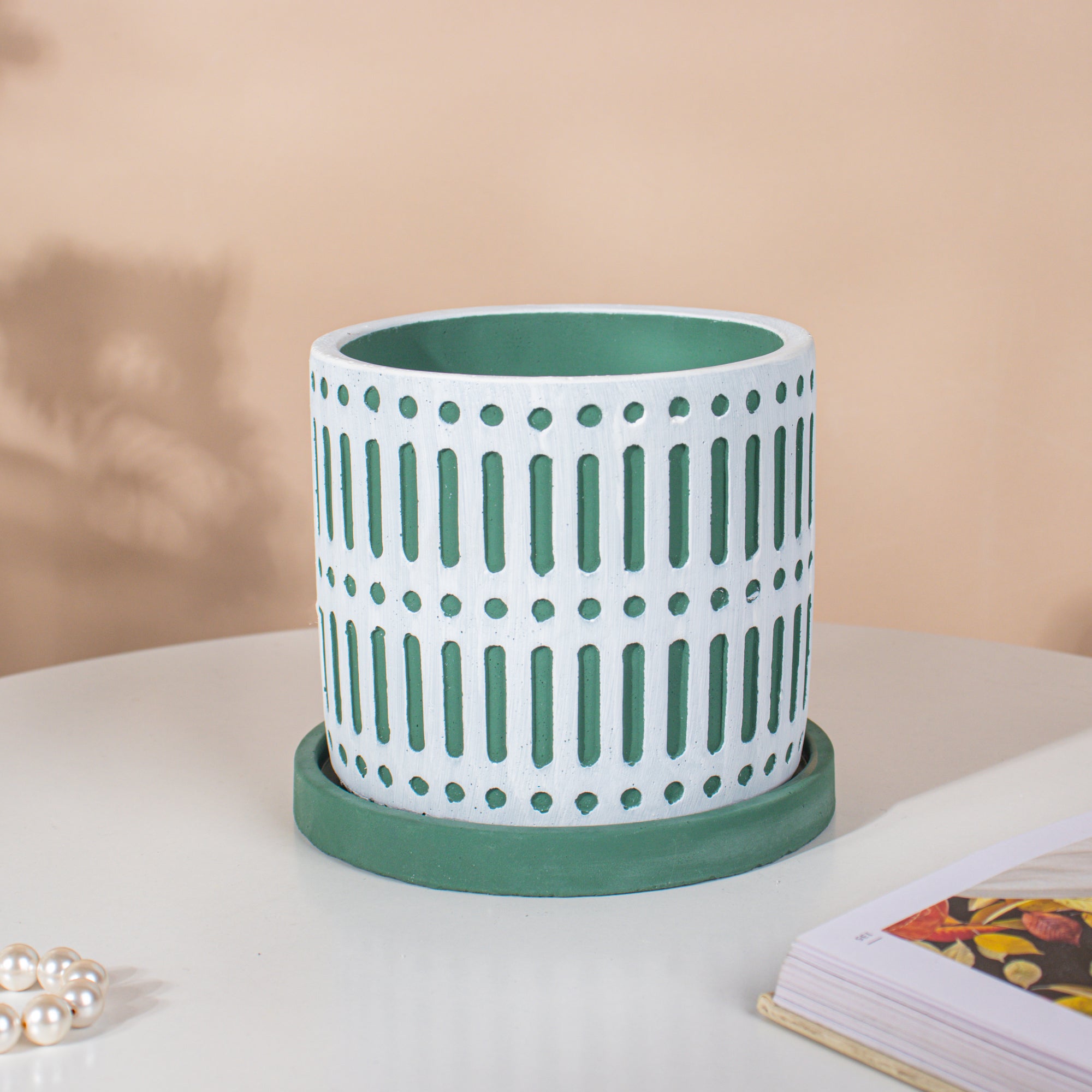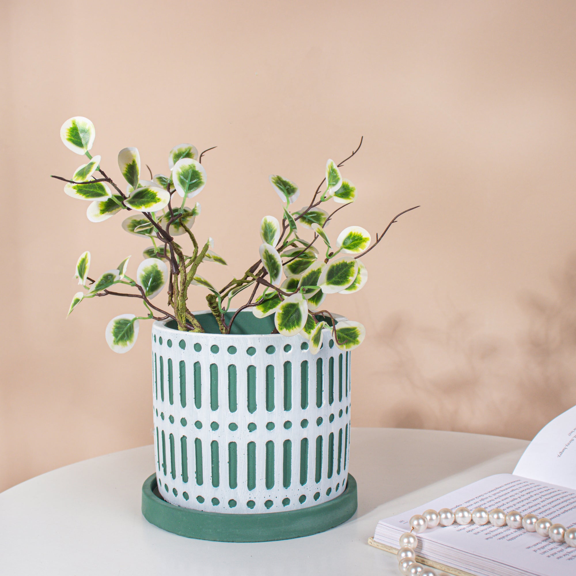 The patterned ceramic pots with intricate designs are certainly appealing and aesthetic for a minimal and modern home. Plant a bonsai, aloe vera or snake plant to deck up the space with lush green vibes. The white and green bounce off of each other very well creating a bright and energetic vibe that is sure to uplift the décor of any space.