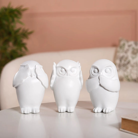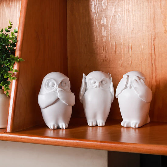 Discover the enchanting allure of our white owl resin showpieces, a captivating decor item that infuses your space with a touch of whimsy. Meticulously crafted from high-quality resin, this showpiece set showcases a serene white hue that radiates elegance and purity. The endearing owls embody the proverbial notions of 'Hear No Evil', 'See No Evil' and 'Speak No Evil.' This charming portrayal evokes feelings of wisdom and innocence, making it a distinctive and thought-provoking addition to your decor.
