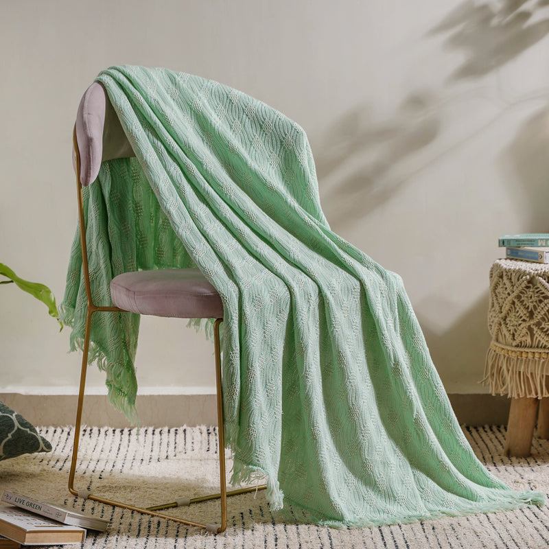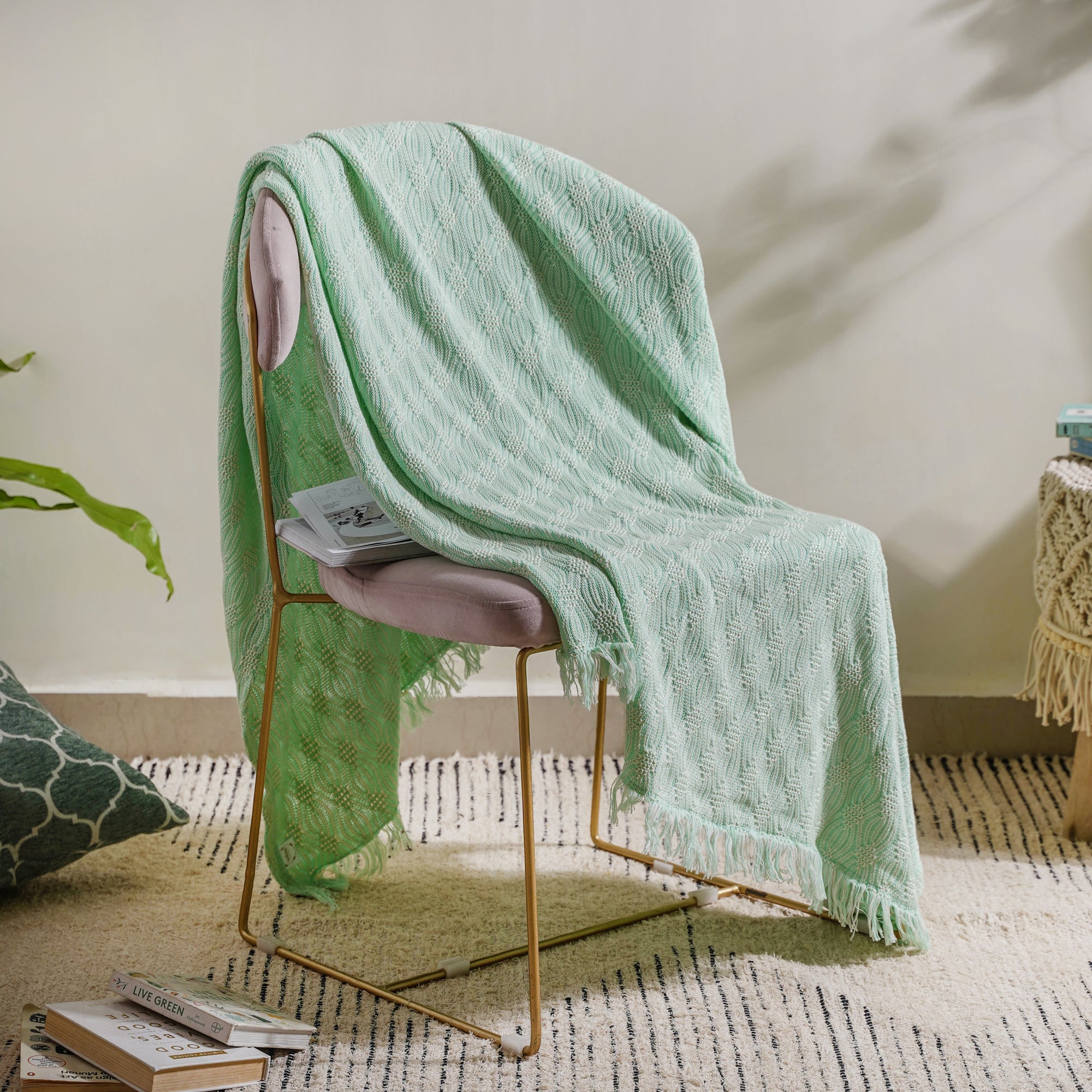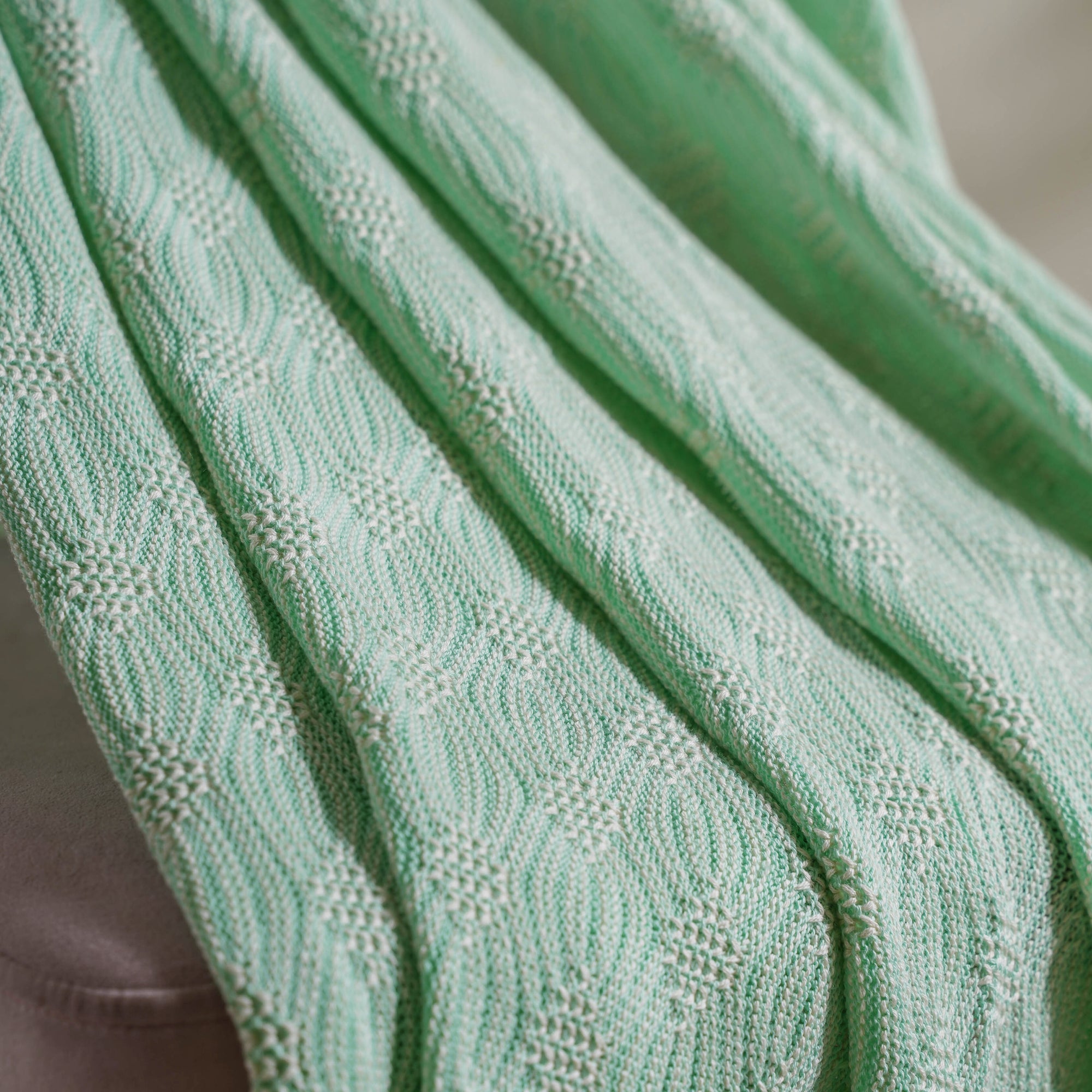 The dual toned knitted throw in minimal yet intricate design is a wonderful addition to one's living room, bedroom or guest room. Relish a hot cup of coffee, snuggled up in this warm and tender throw blanket on a chilly evening. The amalgamation of mint and white is just a perfect mix of soft shades to add to any decor.