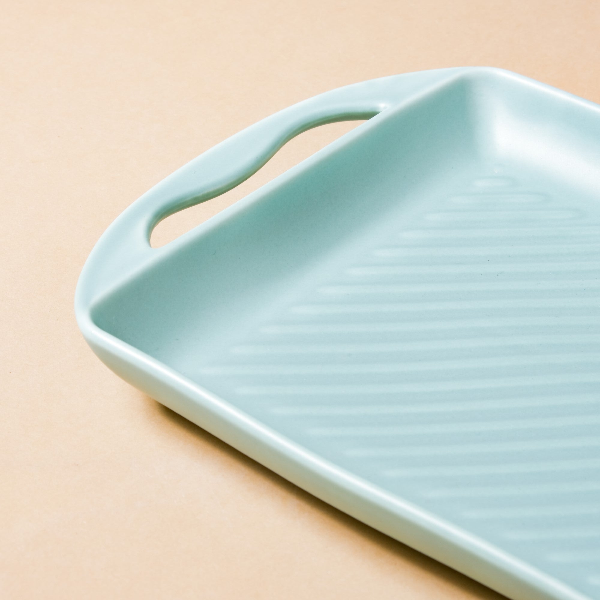 The square-shaped mint baking plate with handles is ideal for baking and grilling in the oven and may also be used for serving. In the ceramic baking plate that also doubles as a snack dish, plate up and serve kebabs, noodles, and cupcakes. The fine grill lines on the square plate give the food a pleasant grilled feel, which adds to the experience of the delightful meal.