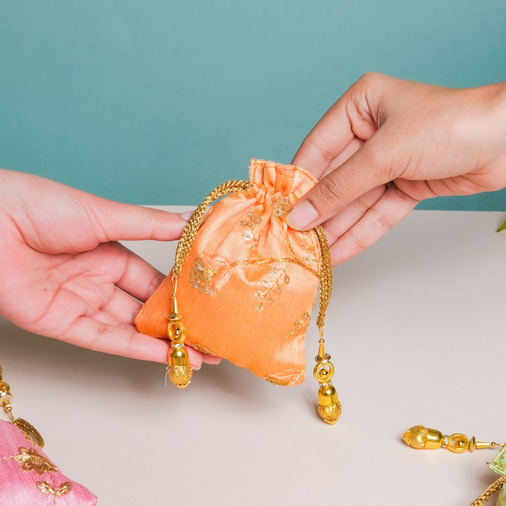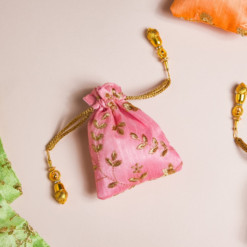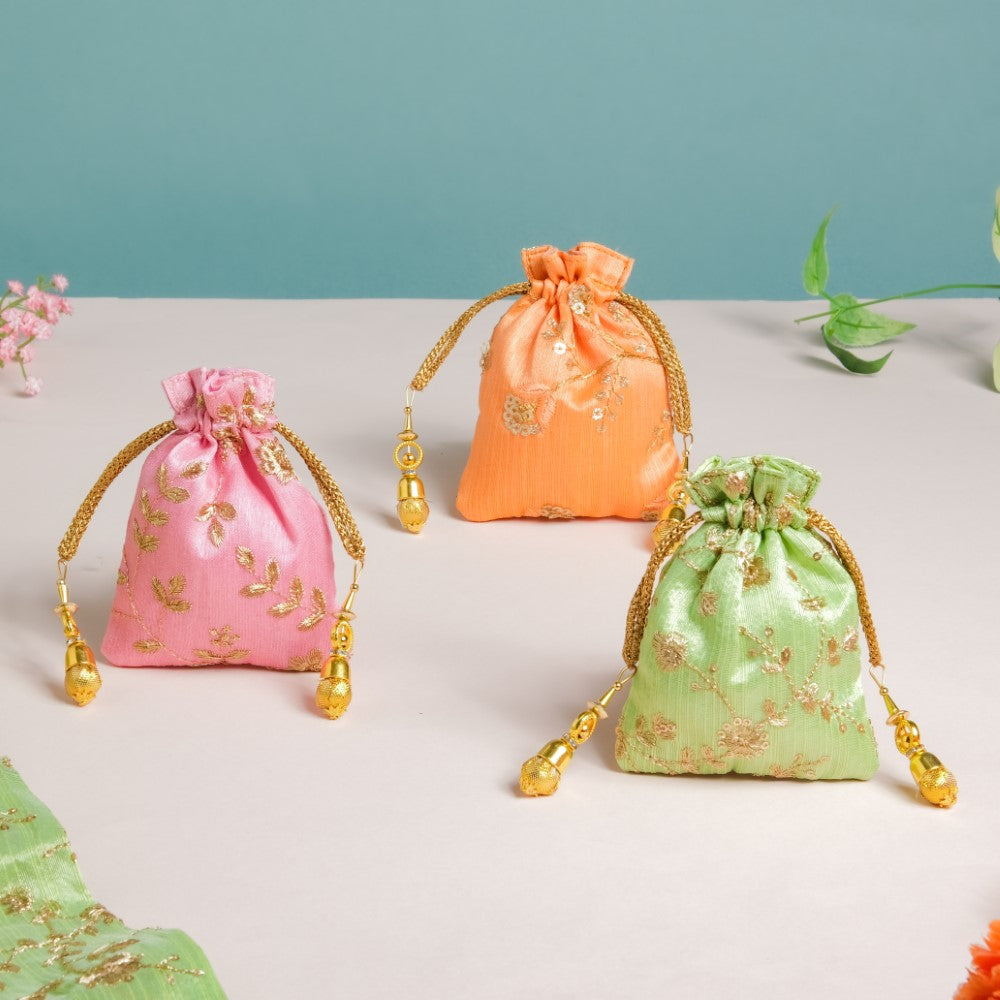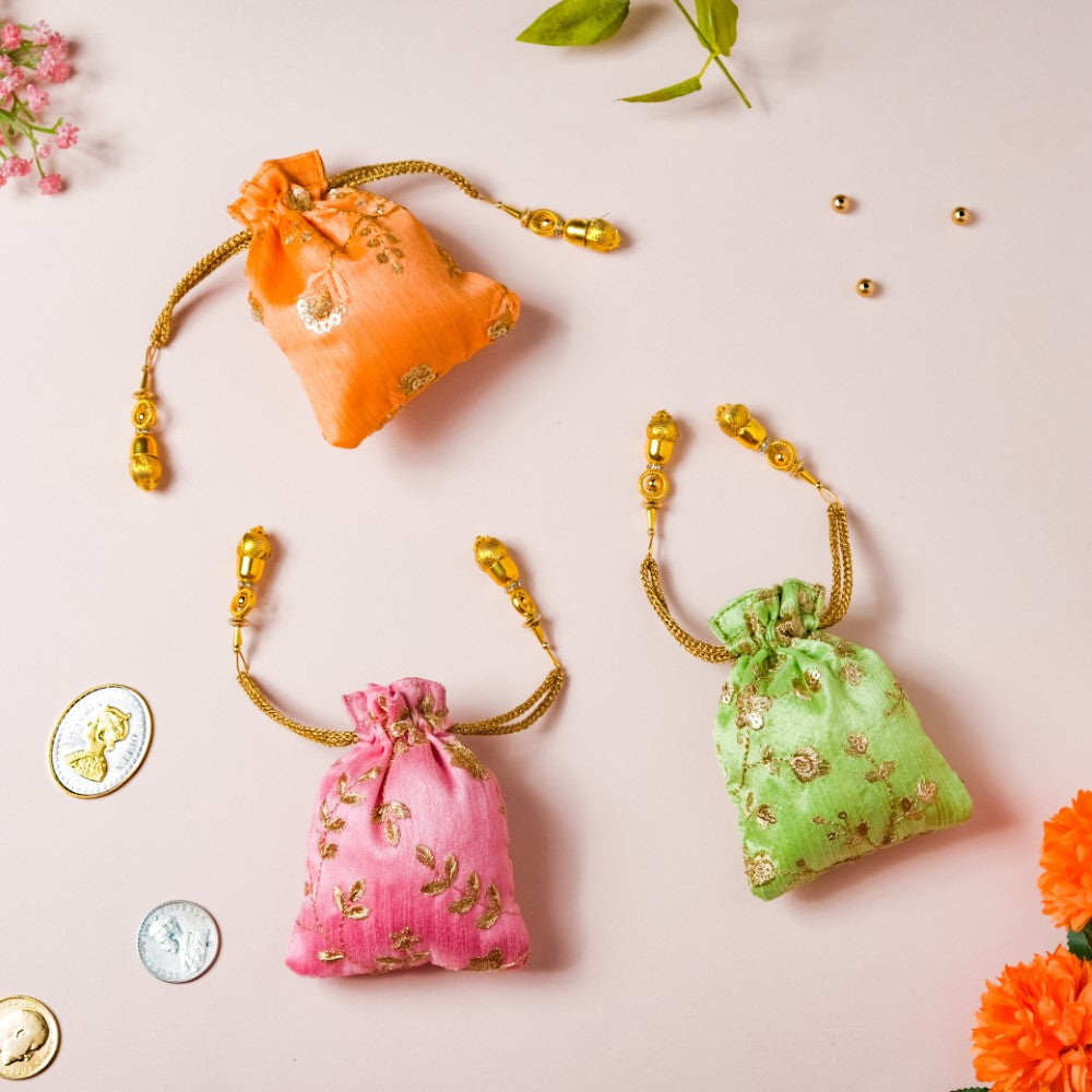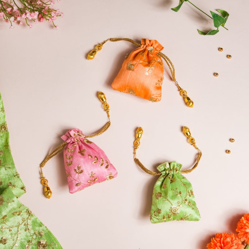 The set of 3 shagun potli bags with their glazed zari fabric add flair to festive gift-giving traditions. The 3 potlis feature distinctive colours of pink, orange, and green that are adorned with golden embroidered floral details, and topped with gorgeous sequins. The potlis feature drawstring closures that have beaded additions to glam up the design of party potlis. The potlis are perfect for return gifts and party favours during festive occasions and for gifting jewellery and trinkets during wedding and pre-wedding ceremonies.