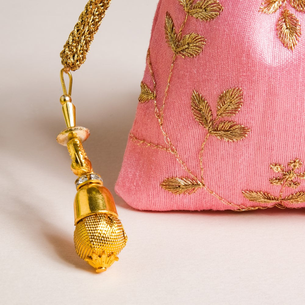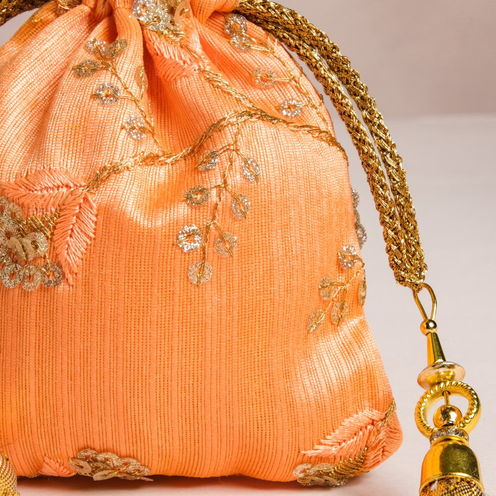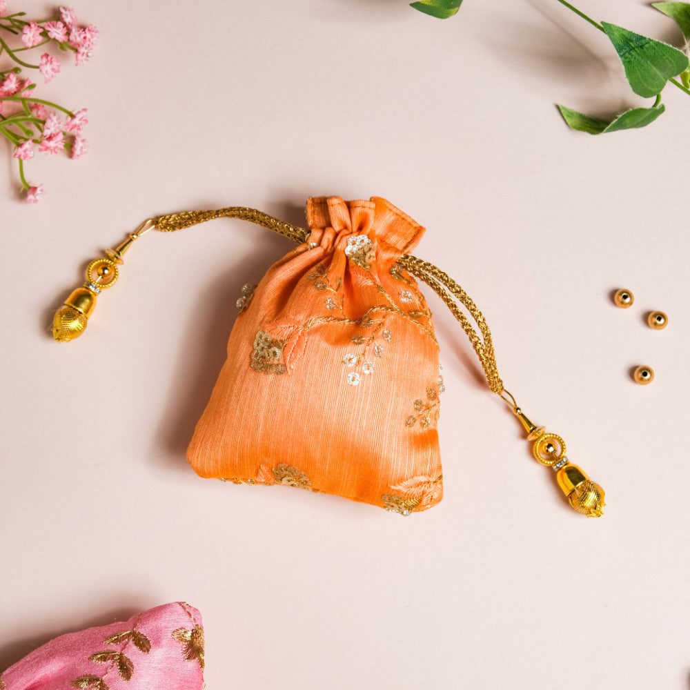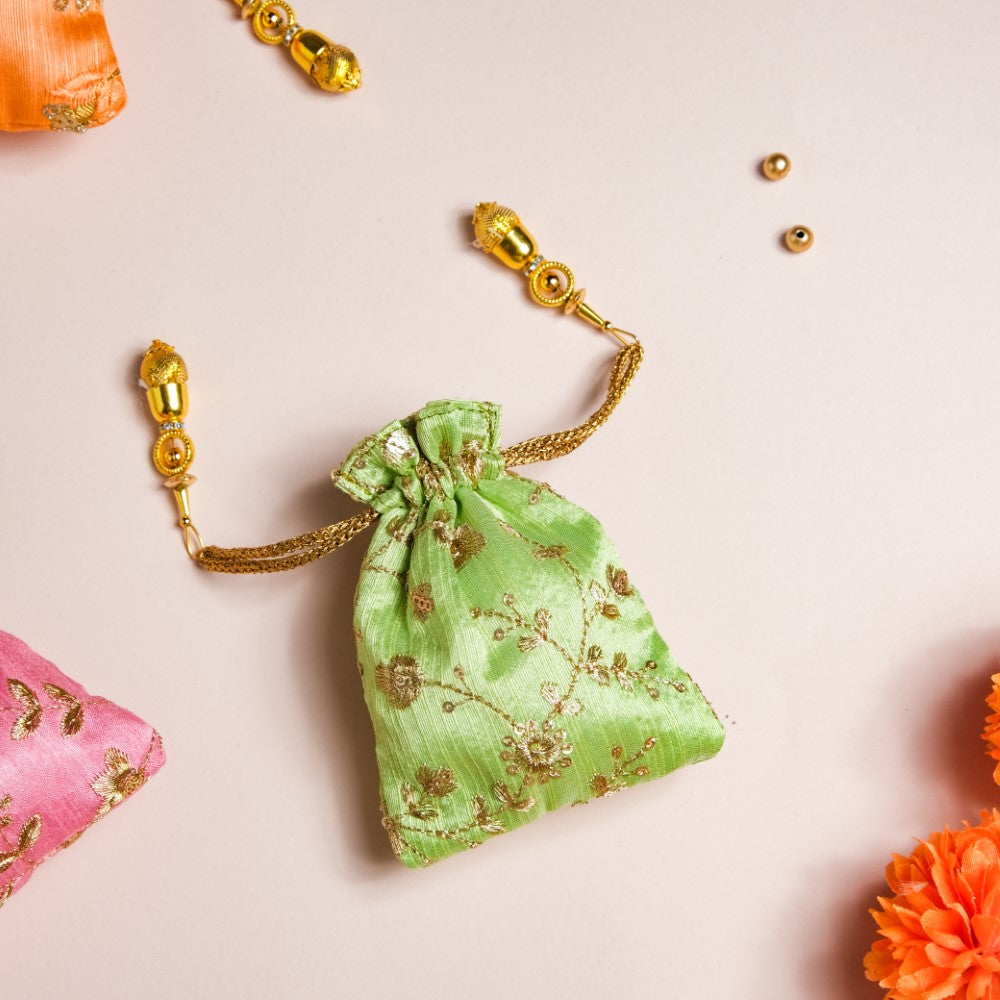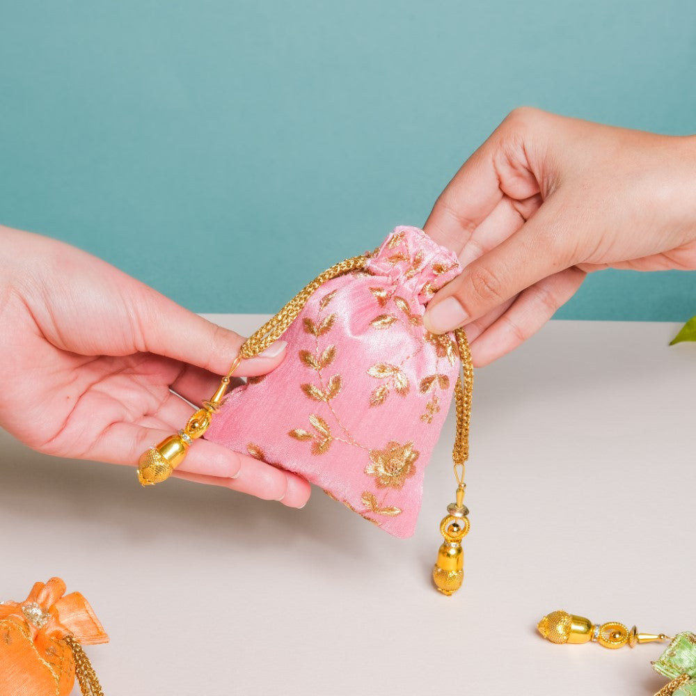 The set of 3 shagun potli bags with their glazed zari fabric add flair to festive gift-giving traditions. The 3 potlis feature distinctive colours of pink, orange, and green that are adorned with golden embroidered floral details, and topped with gorgeous sequins. The potlis feature drawstring closures that have beaded additions to glam up the design of party potlis. The potlis are perfect for return gifts and party favours during festive occasions and for gifting jewellery and trinkets during wedding and pre-wedding ceremonies.
