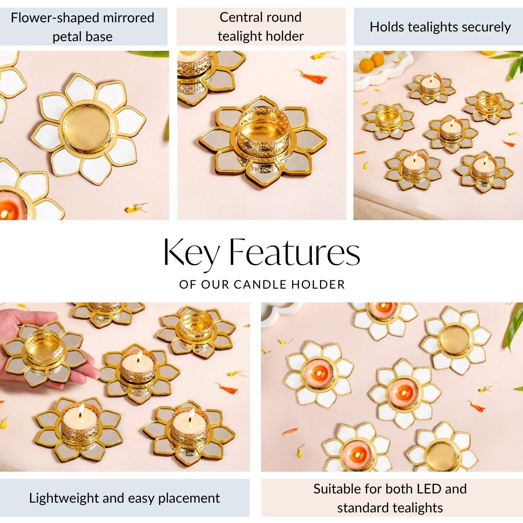 Design: This tea light holder set of 6 features flower-shaped bases crafted with mirrored glass petals, each finished with a gold metallic border. The uniform petal layout across all 6 holders offers a balanced and symmetrical aesthetic. The reflective surface enhances the glow of candlelight, while the central round cavity holds the tealight securely in place with a polished metallic ring. Their compact, flat design allows for seamless arrangement across various surfaces, adding charm to both traditional and modern spaces.