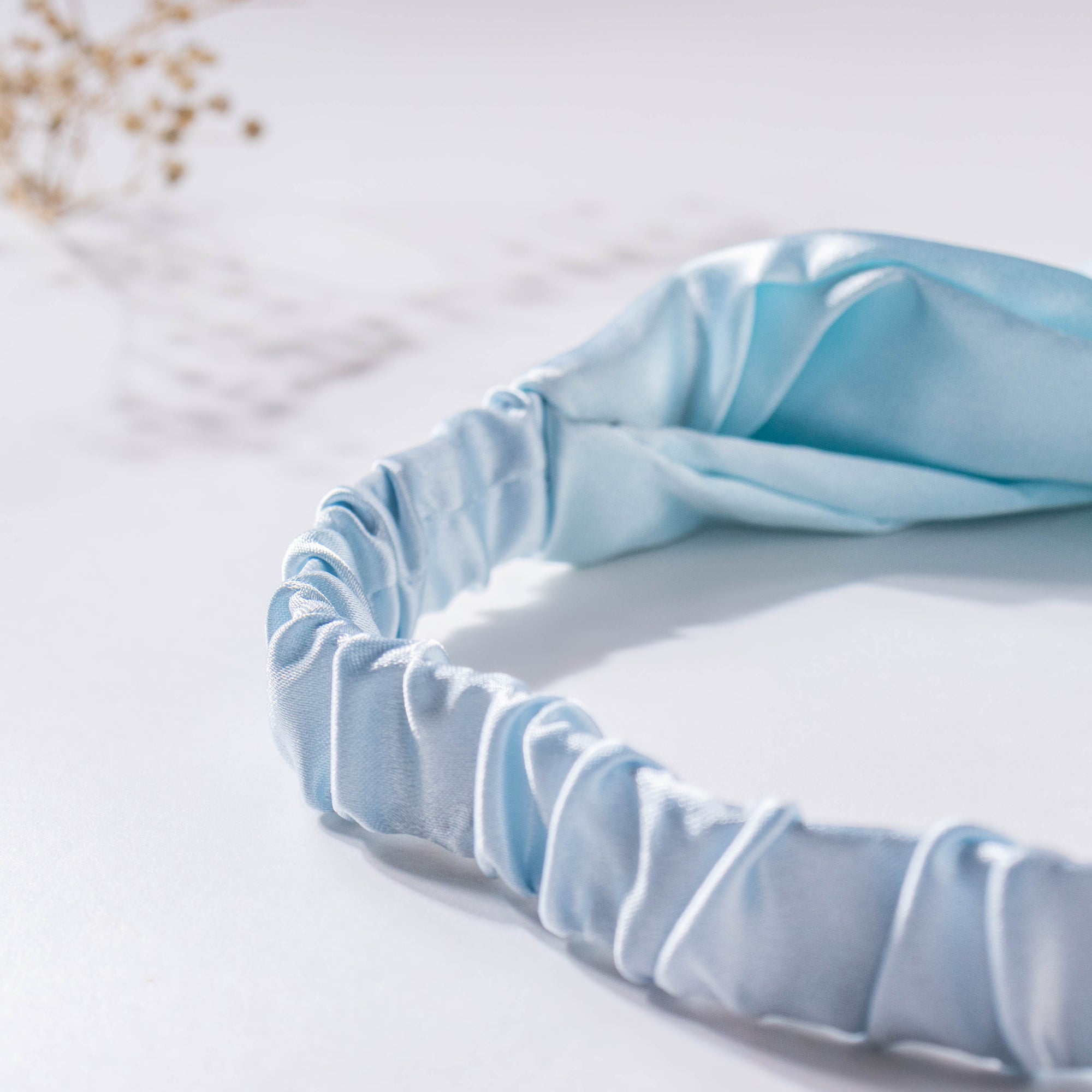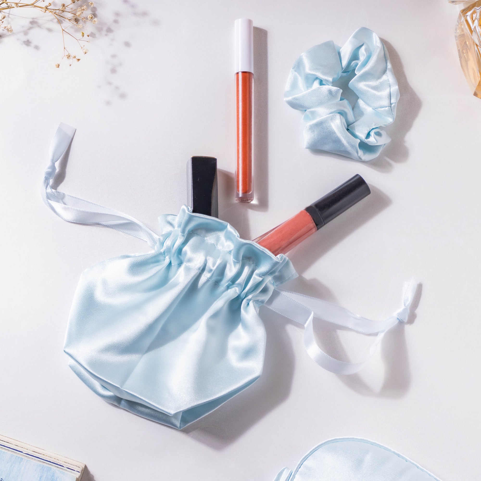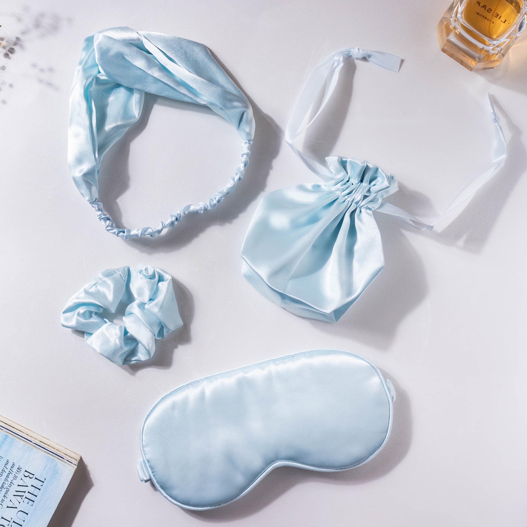 The set of sleep essentials comprises an eye mask, hair band, scrunchie, and a drawstring bag. Featuring a subtle sky blue color and made of extremely soft satin fabric, the set is one's go-to accessory to get a restful night of sleep. The eye mask's shape makes the silky mask get placed perfectly around the face while the stretchy adjustable band fits comfortably around the head. The scrunchie and hairband feature a soft and durable elastic that may be used as a daily accessory to keep the hair in place.