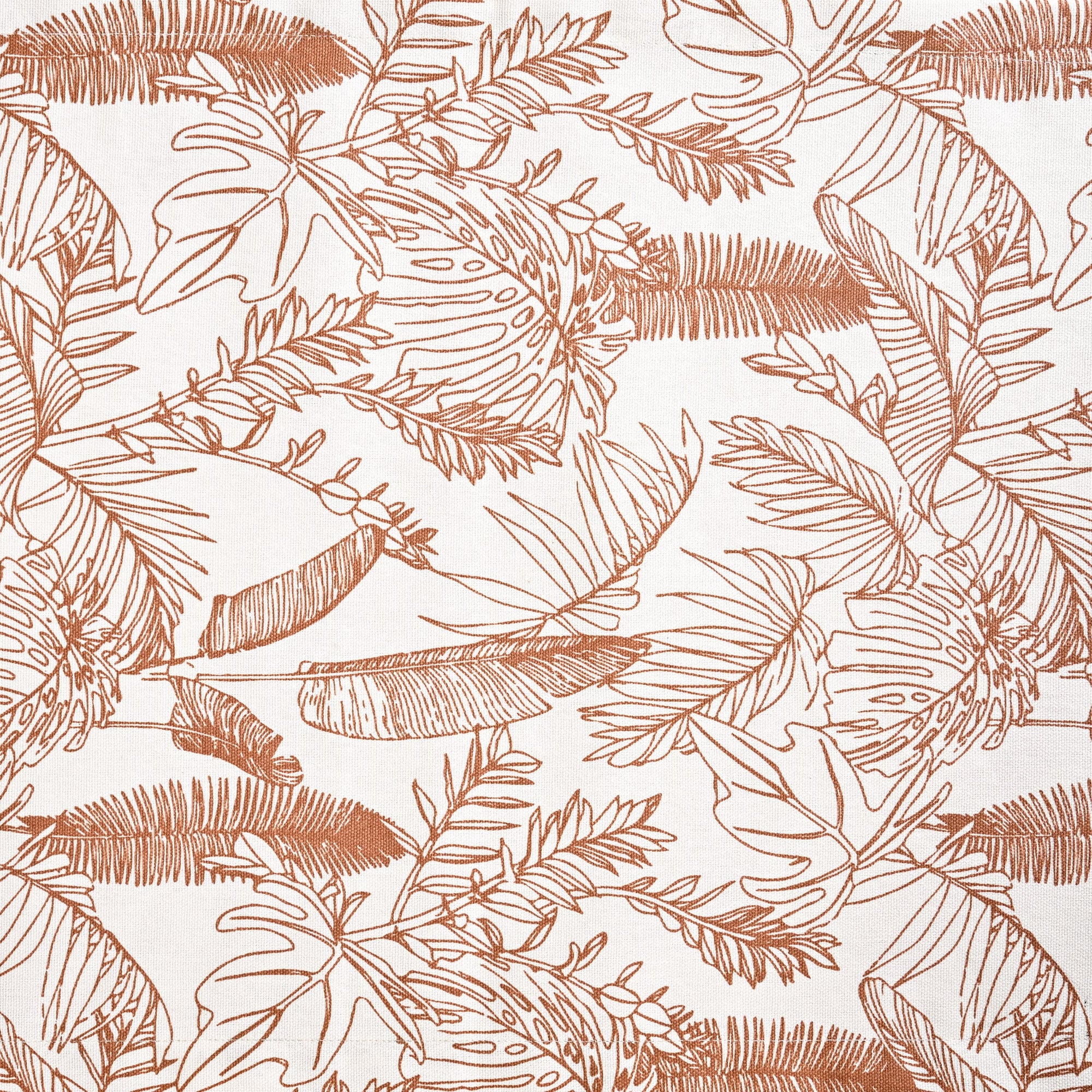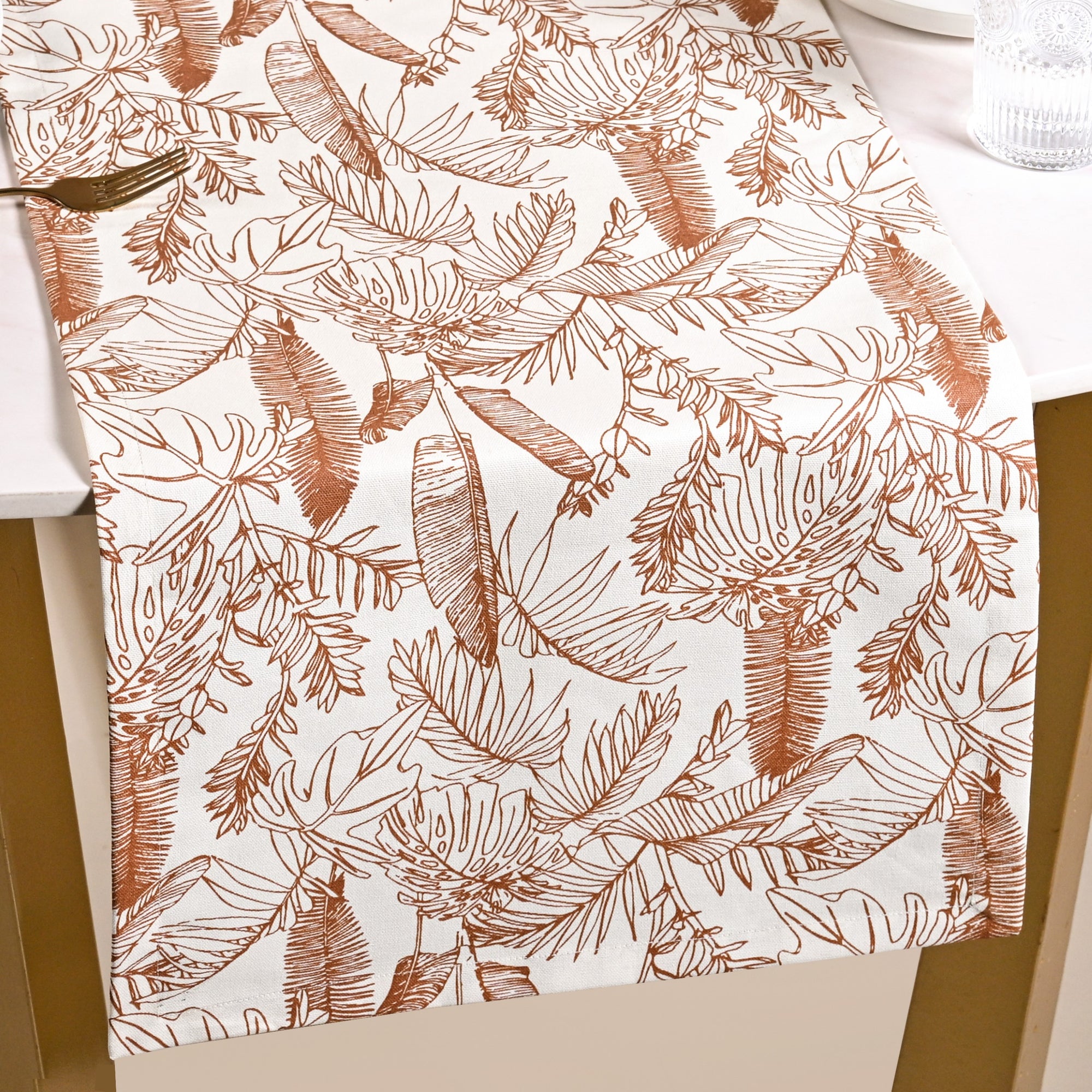 Design: This premium table runner set features an elegant, detailed tropical foliage print in a rich, earthy brown on a neutral white background, making it a stylish focal point for a six-seater table. The pattern showcases various large palm leaves in a stylish jungle design. Crafted from a high-quality 100% cotton blend with an acrylic polymer coating, the textile construction feels substantial yet soft, featuring finished edges for a clean, neat look.