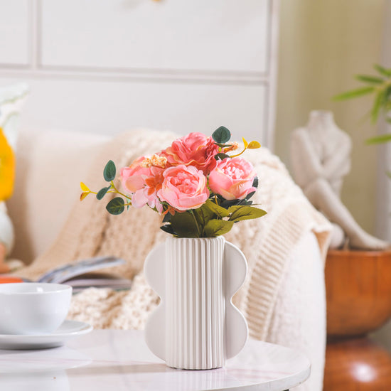 Certainly! This vase, with its premium quality ceramic and versatile design, is perfect for holding decorative branches or foliage in addition to flower bouquets. The handcrafted textured finish and abstract minimalistic design make them stylish pieces that can enhance your living room decor. Whether you prefer fresh flowers, dried branches, or other decorative elements, this vase offers flexibility and aesthetic appeal, making it ideal for gifting and complementing various interior styles.