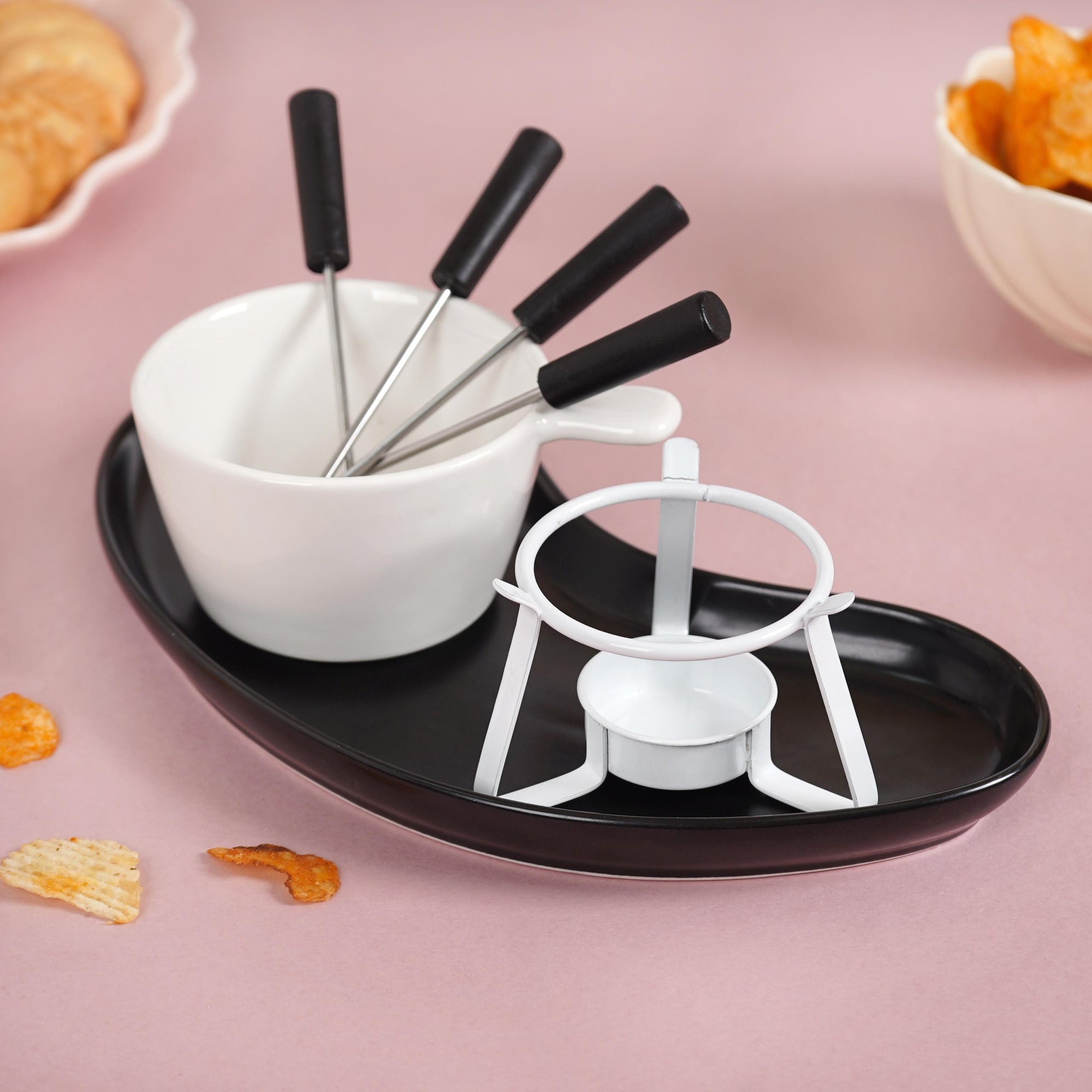 Design: The set includes a sleek ceramic fondue pot that sits on a sturdy, white metal stand, perfect for holding the tealight candle that keeps your fondue warm. The bean-shaped ceramic tray not only adds a unique touch but also offers ample space to place your dippers. Furthermore, the fondue set includes four stainless steel dipping skewers, each featuring comfortable black handles for easy dipping.