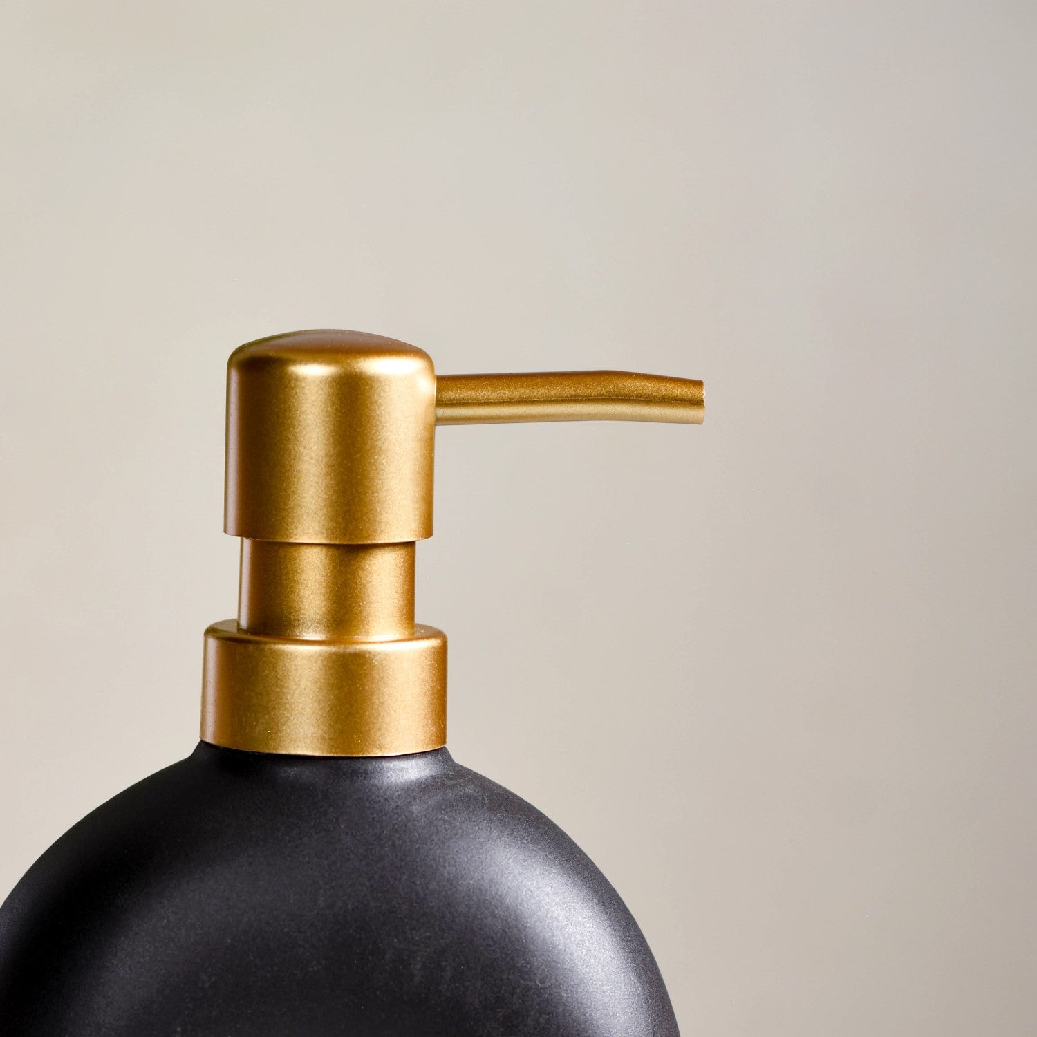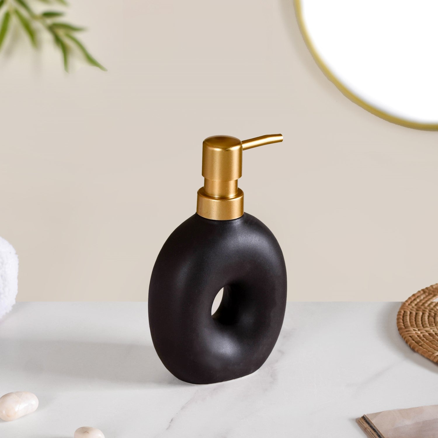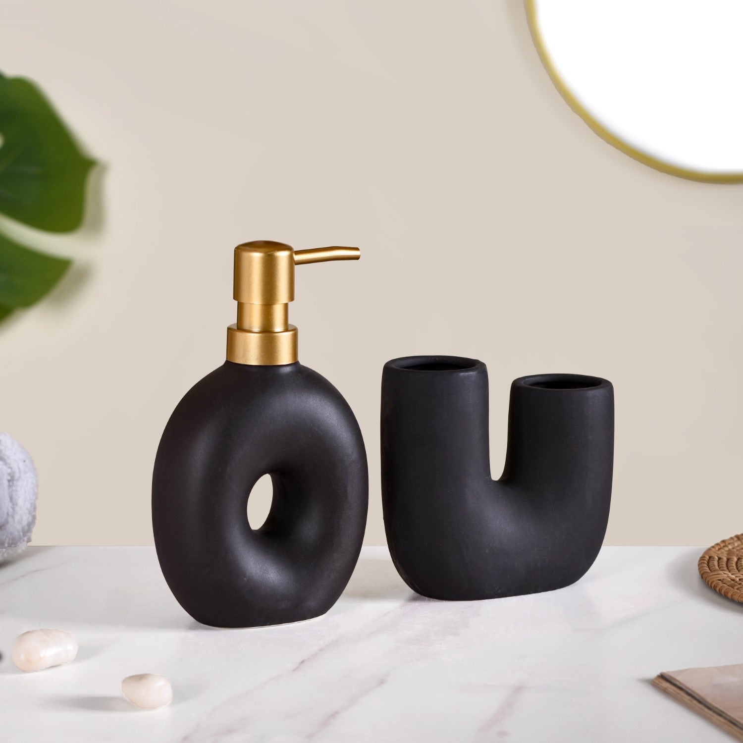 Sleek, chic, and always on fleek, get ready to elevate your daily routine with a touch of modern elegance. Crafted from high-quality non-porous ceramic, each piece in this ensemble exudes durability and resilience, ensuring long-lasting use without the worry of chips or cracks. The set includes two non-negotiable bathroom essentials that seamlessly combine functionality with style. The first is a refillable soap dispenser, designed in the shape of a chic matte black doughnut, adding a contemporary flair to your bathroom decor. Its smooth matte finish not only looks sleek but also feels luxurious to the touch, while the convenient pump ensures effortless dispensing of your favourite liquid soaps. Accompanying this stylish soap dispenser is a toothbrush holder, shaped into an uneven "U," offering a unique and artistic twist on traditional design. This asymmetrical form not only adds visual interest but also provides practicality, allowing for easy organisation of your dental essentials. Designed with sustainability in mind, this set is both eco-friendly and easy to clean, making it the perfect choice for both bathroom decor and organisation.