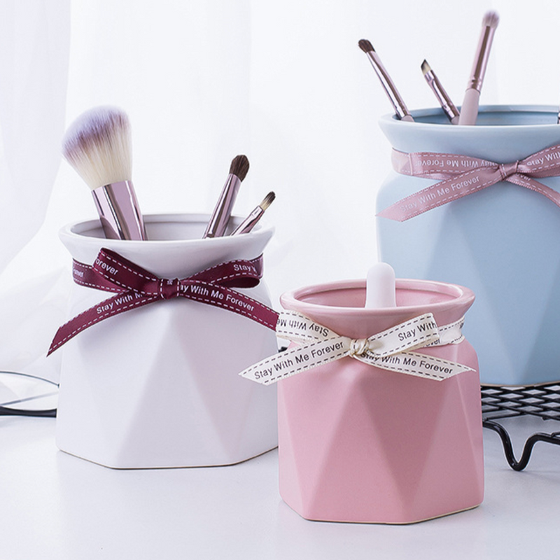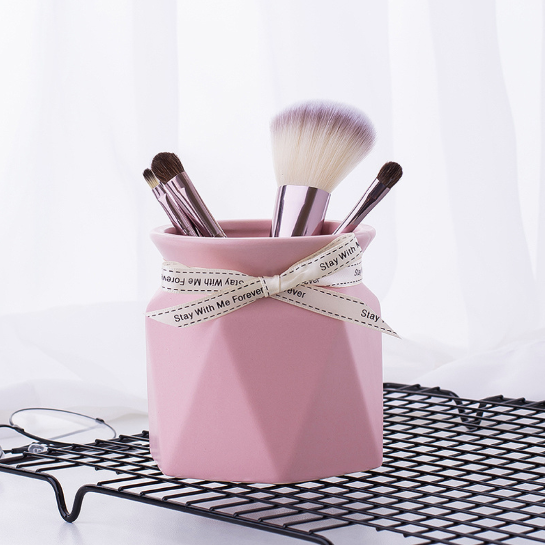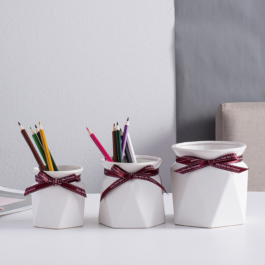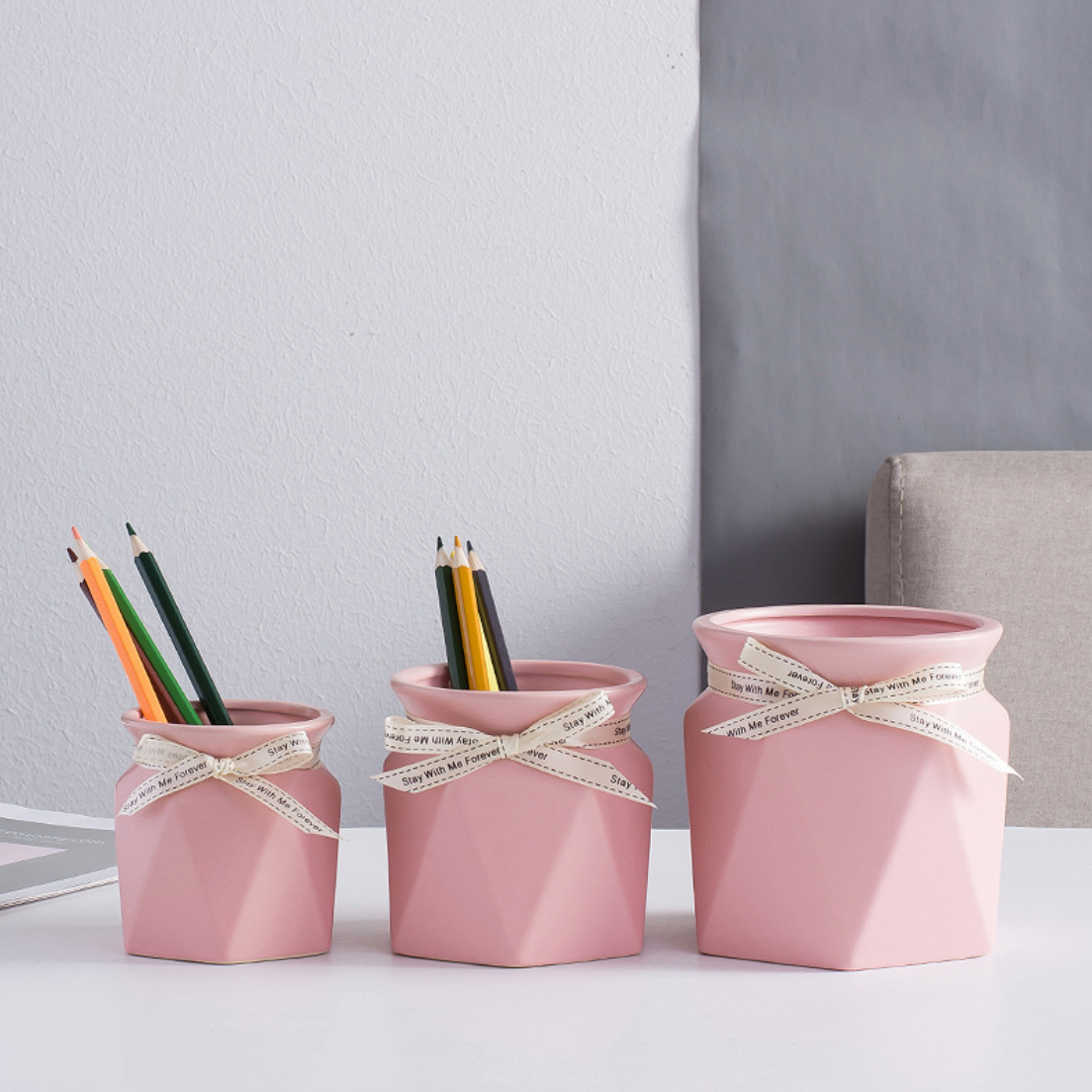 Pastel tones and trendy geometric textures combine beautifully to make the small flower container. For a vibrant contrasting look, pair the vase with imitation flowers and leaves. The vase includes a bow at the neck that provides a decorative element to the vase. The flower vase can be used to dress up a bedside table.